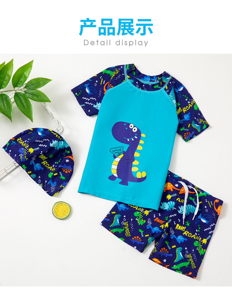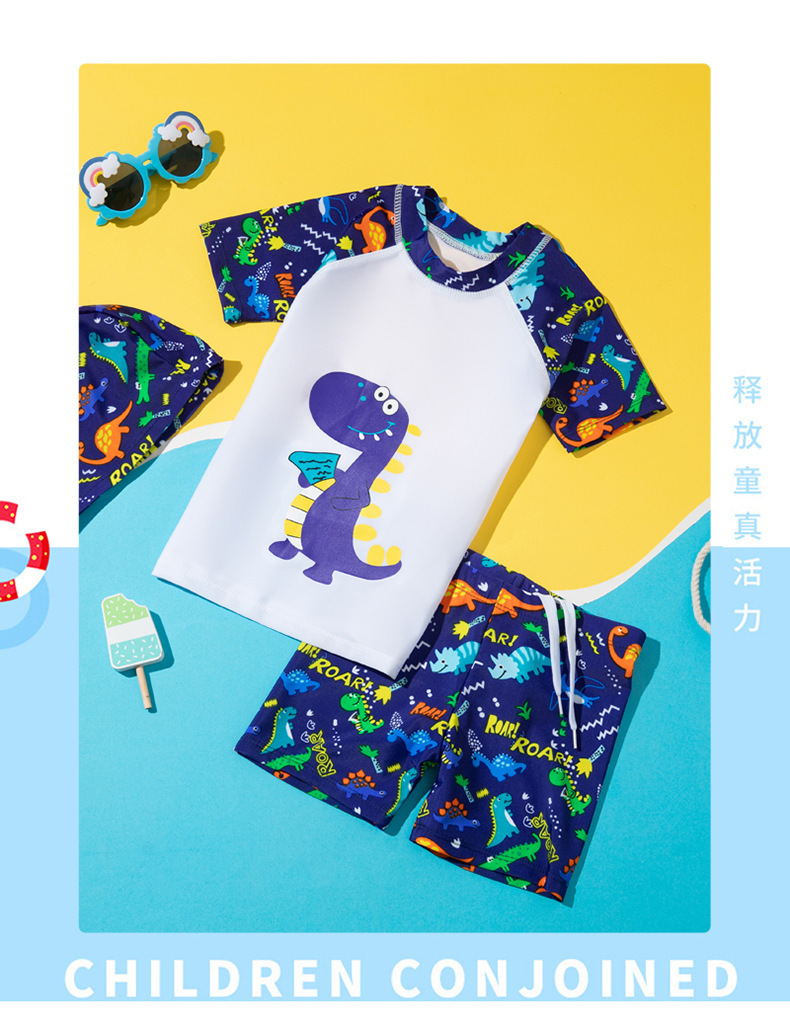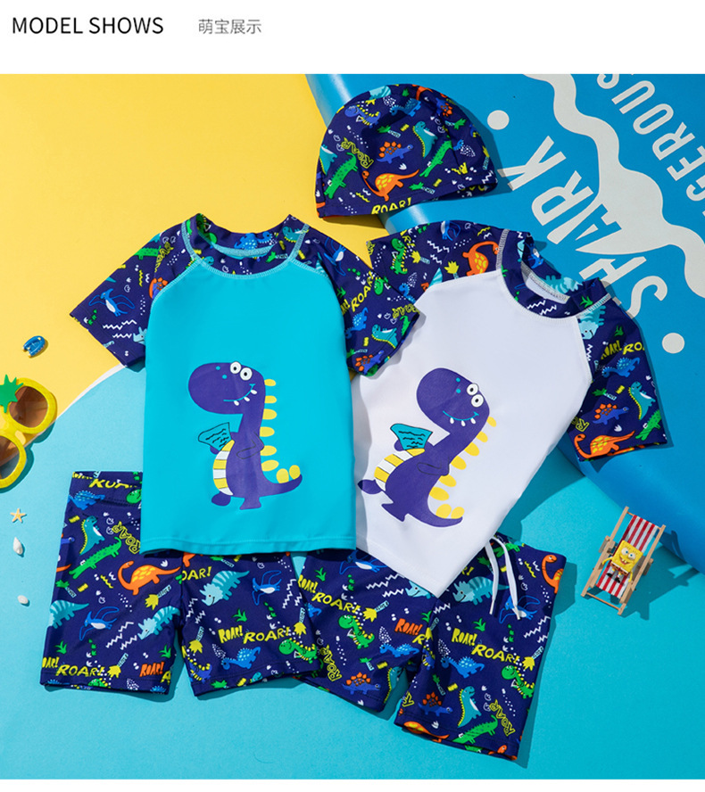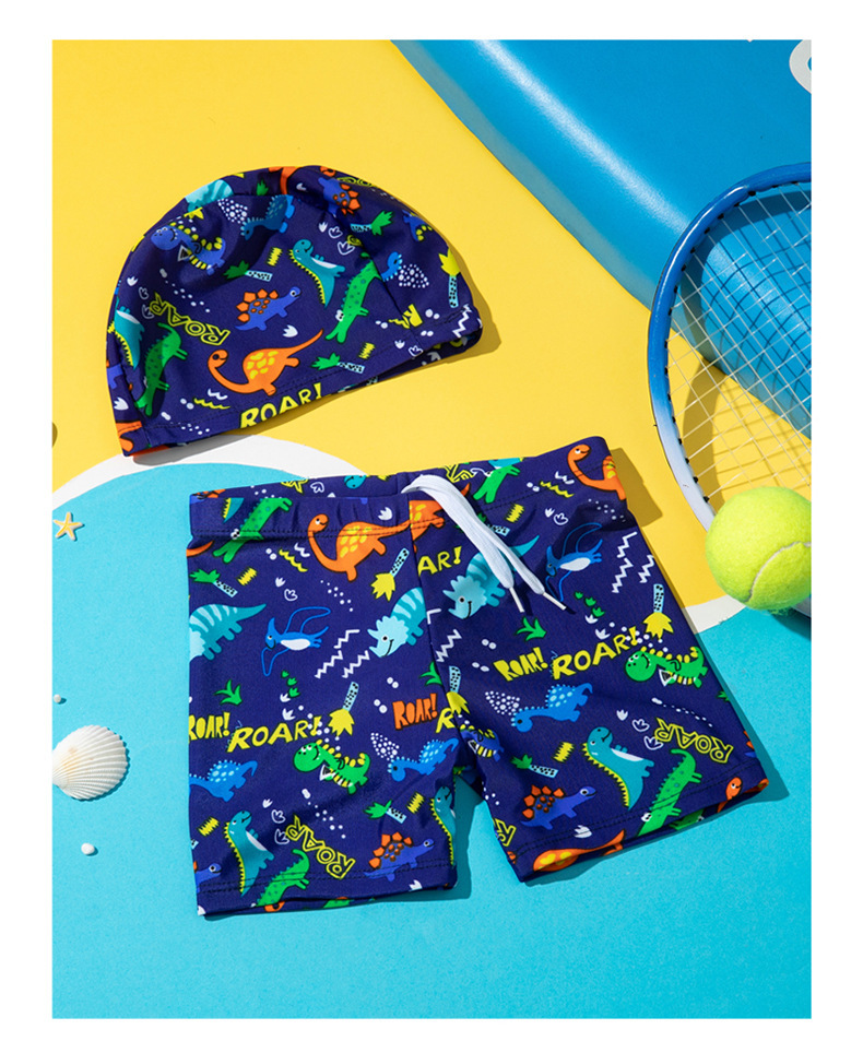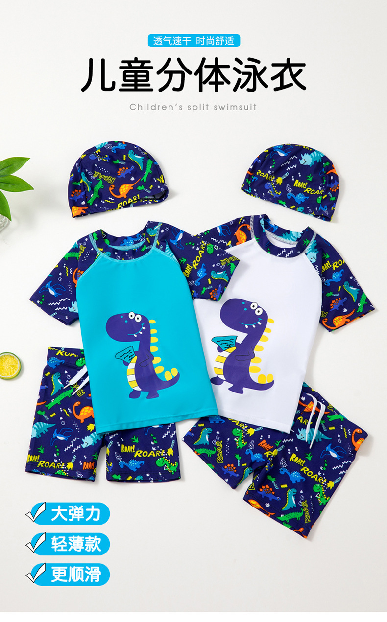 만화 공룡 어린이 수영복 분할 중간 큰 아이 십대 소년 수영 세트 여름 수영 트렁크 수영 모자 수영복 세트