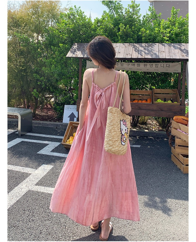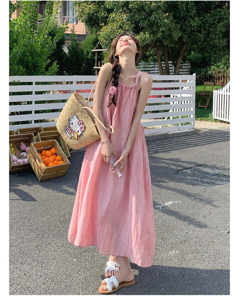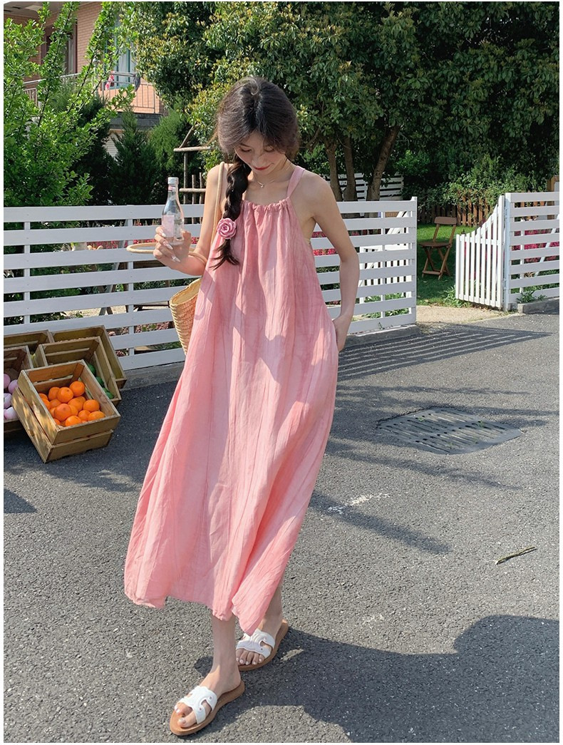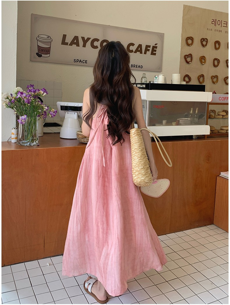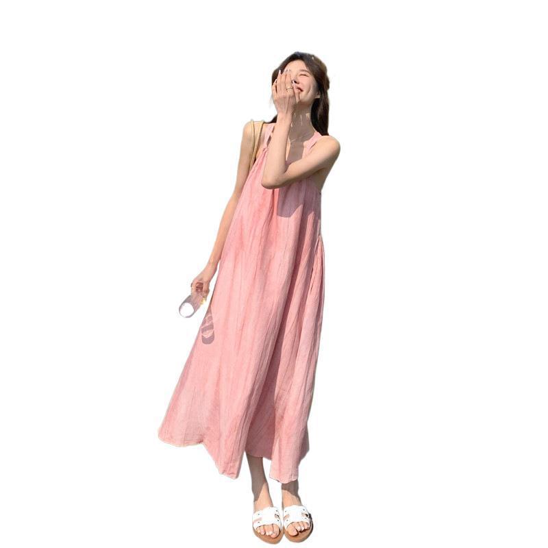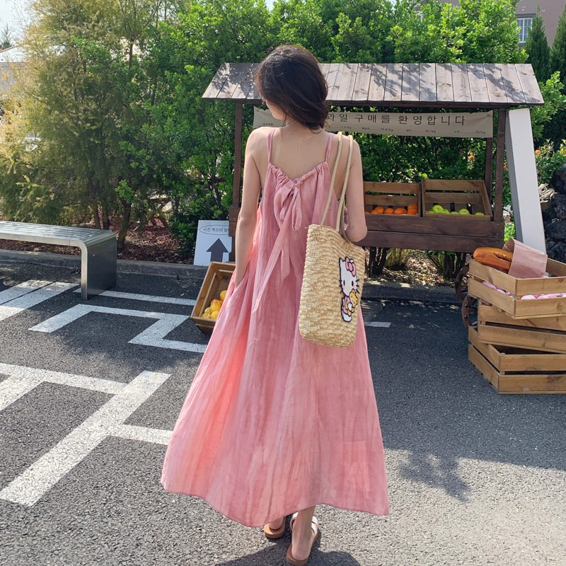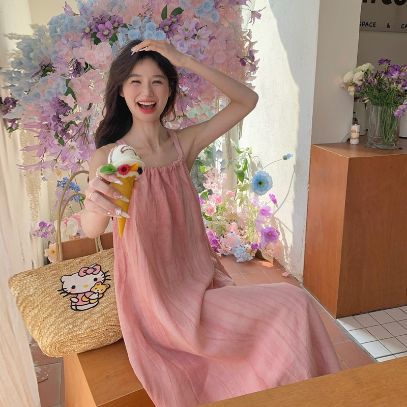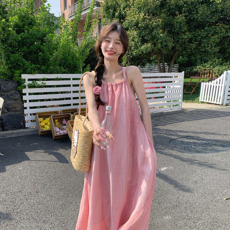 핑크 슬링 롱 원피스 여성 여름 새로운 해변 휴가 해변 원피스 디자인 틈새 원피스 여성 의류