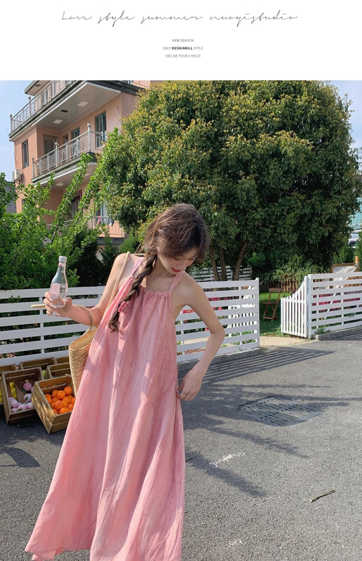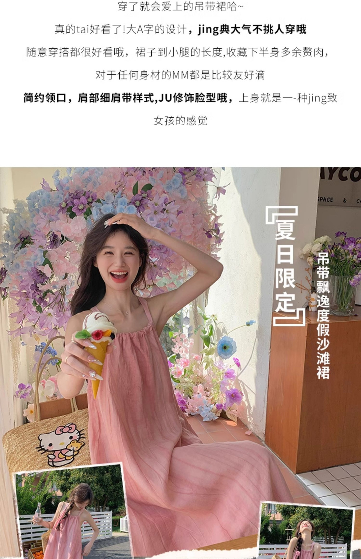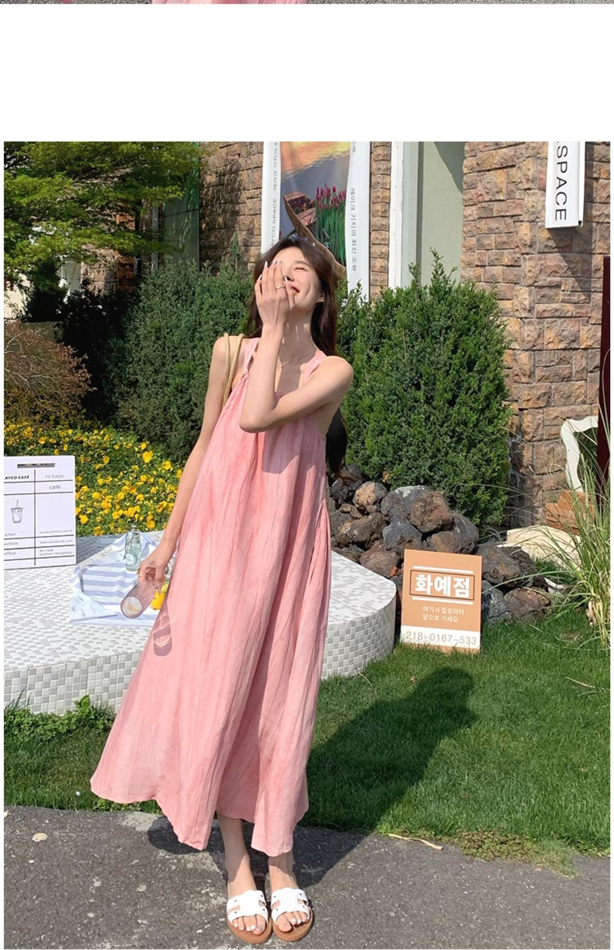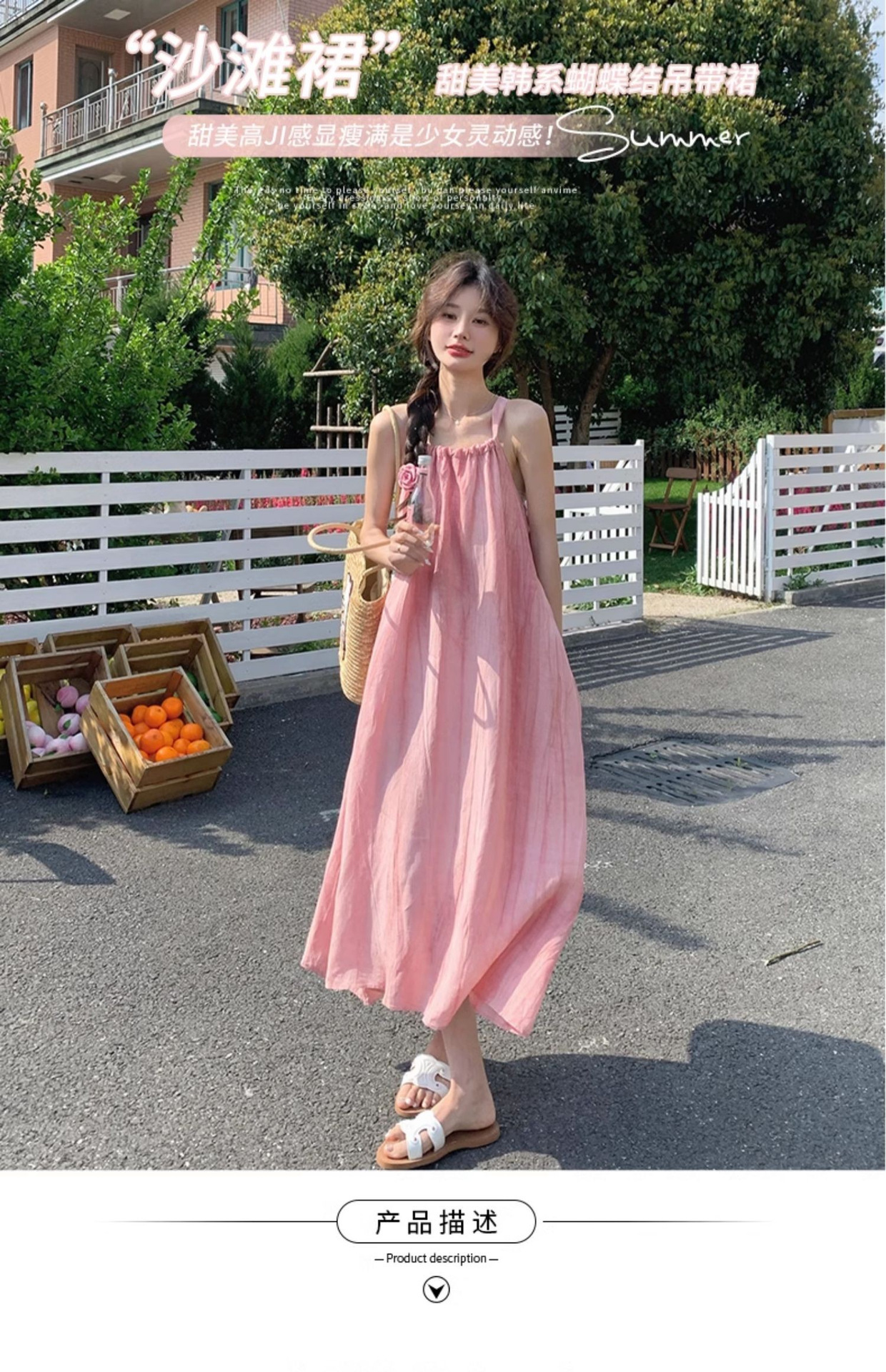 핑크 슬링 롱 원피스 여성 여름 새로운 해변 휴가 해변 원피스 디자인 틈새 원피스 여성 의류