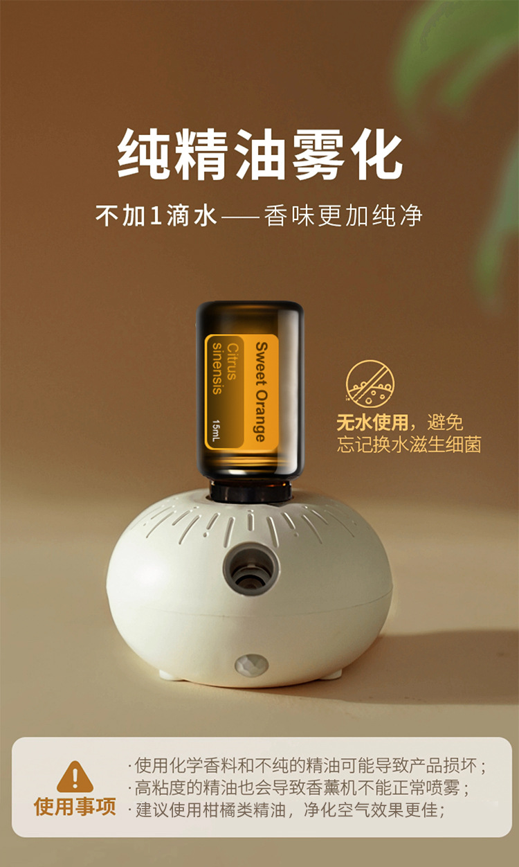 推荐搭配本店的植物精油,100%纯植物萃取,成分安全,专为微孔香薰机精准匹配的,雾化细腻,香气持久,纯净无杂质,有效避免堵塞,延长机器使用寿命。