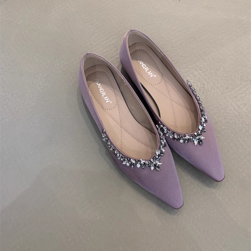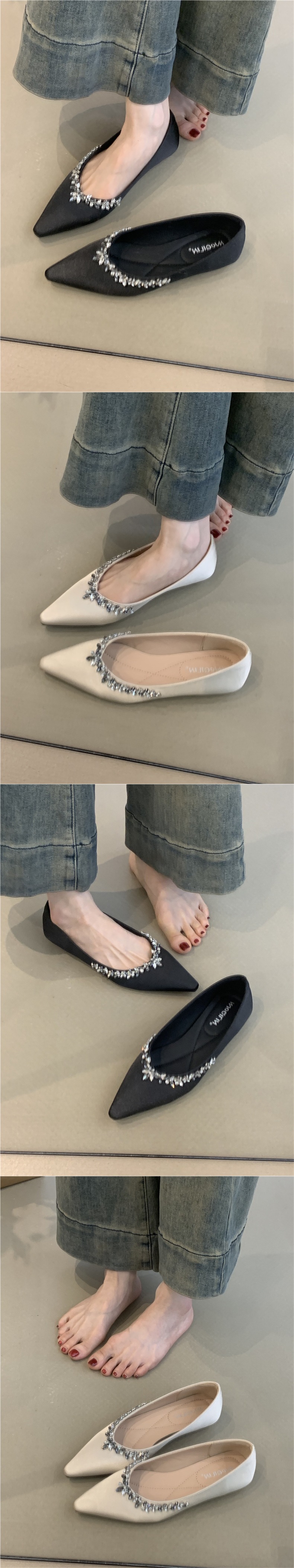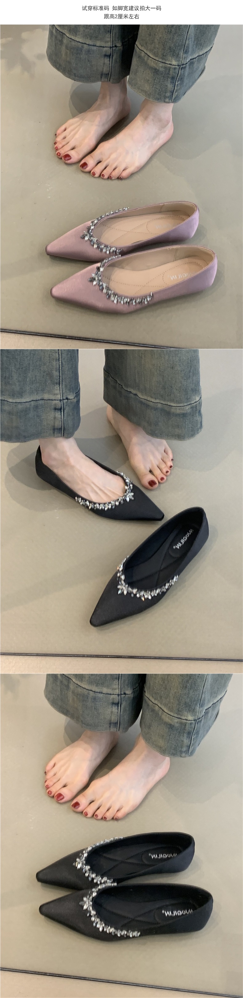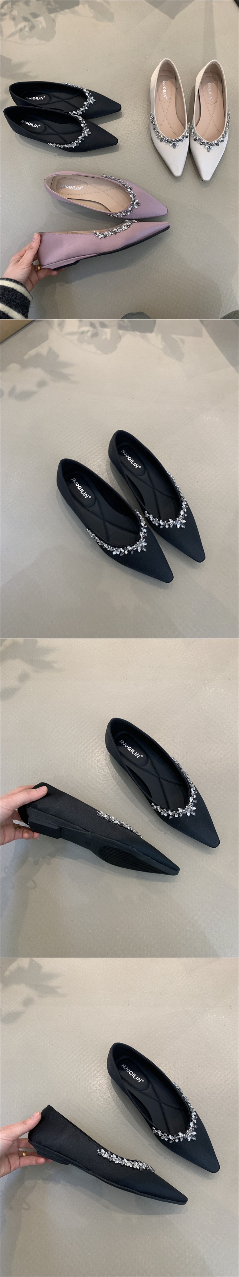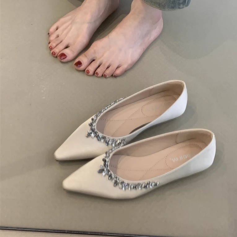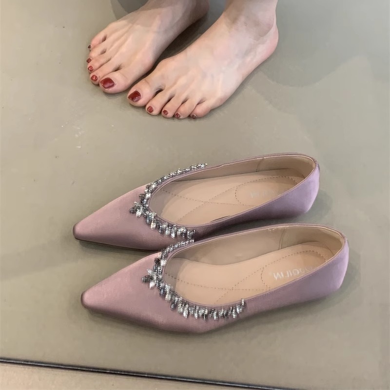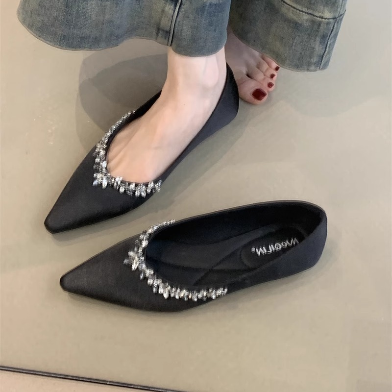기질 모조 다이아몬드 뾰족한 신발 여성 2025 봄 프랑스 달콤한 새틴 빨강 얕은 부드러운 바닥 저녁 신발