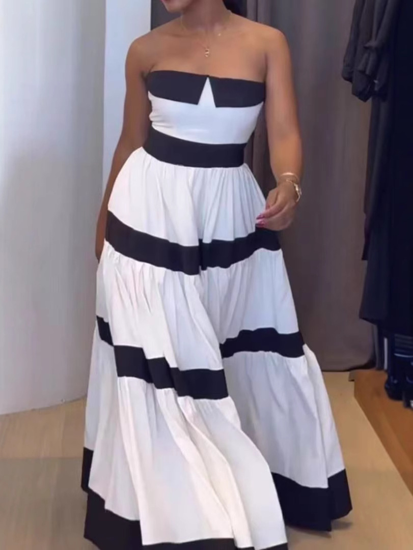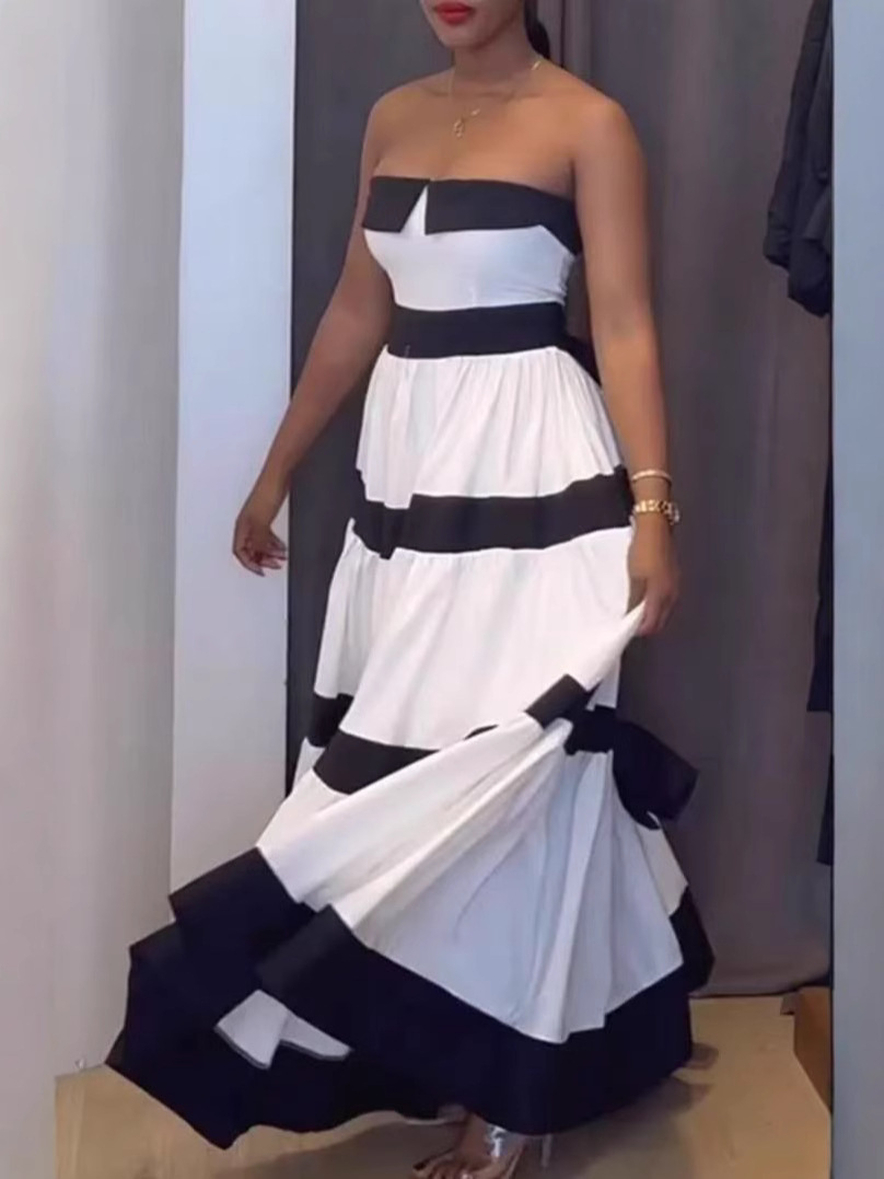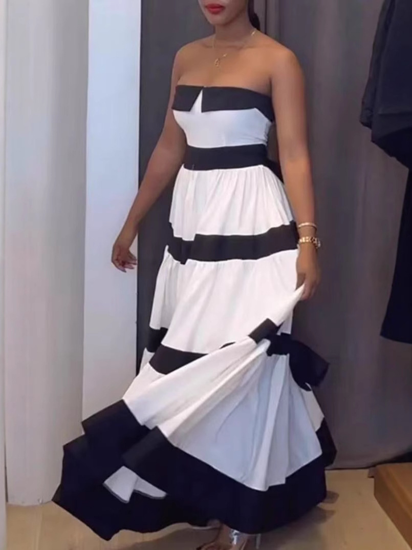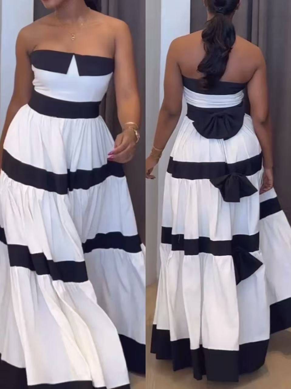 2025 여름 새로운 유럽과 미국의 국경 아마존 국경 패션 컬러 스티칭 줄무늬 활 원피스