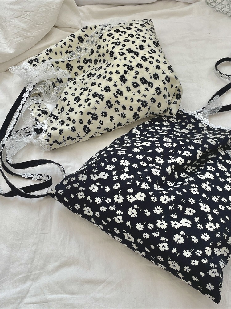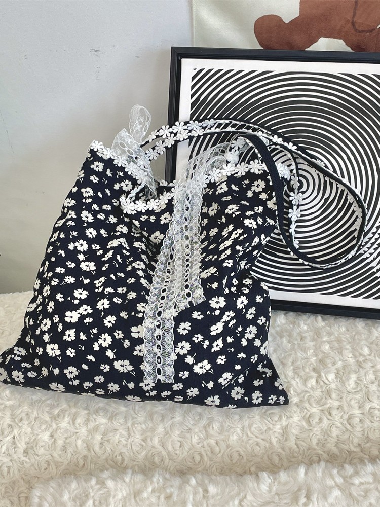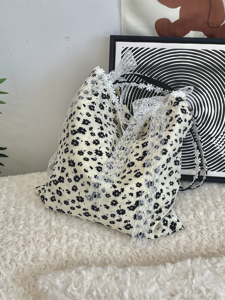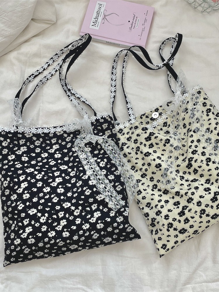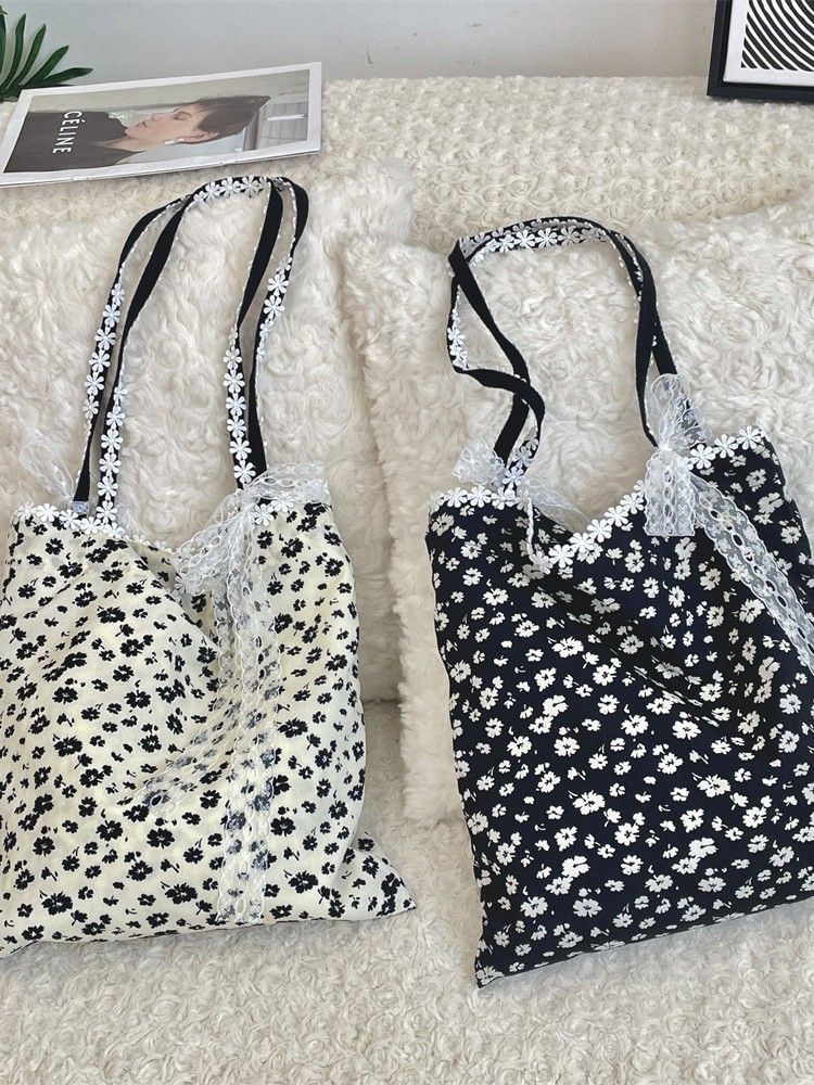 5322 부드러운 소녀의 심장 디자인 새로운 스타일 스티칭 레이스 활 어깨 가방 검은 꽃 캔버스 가방