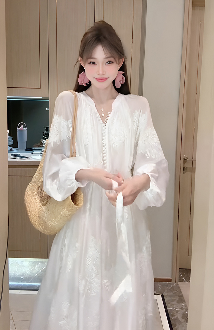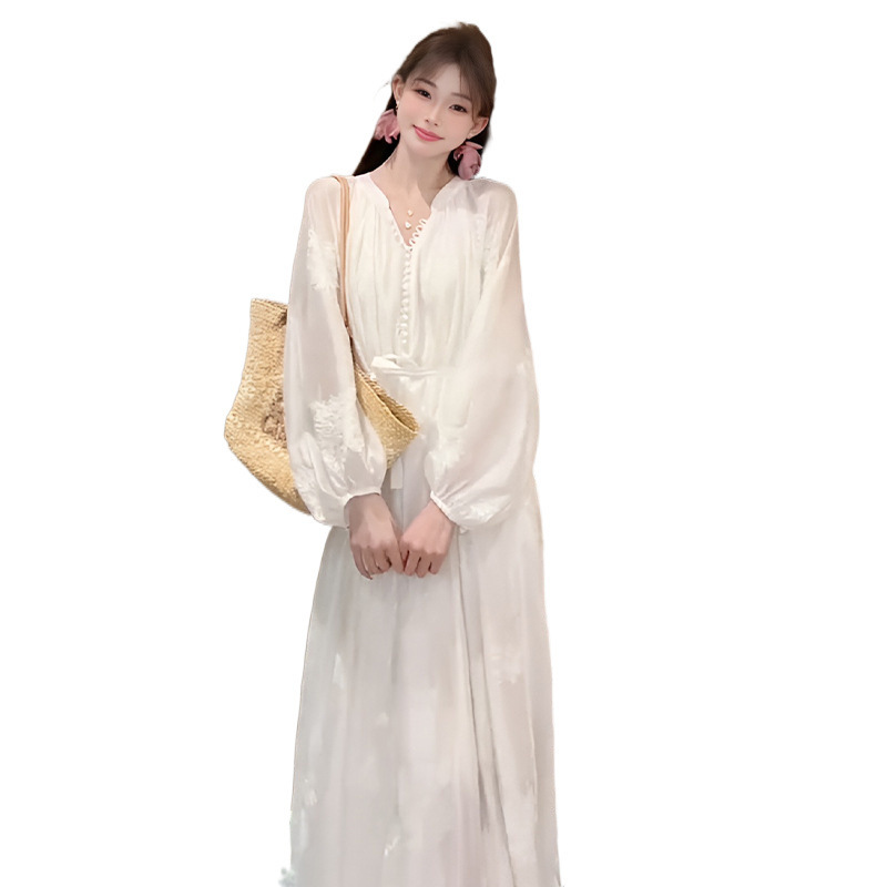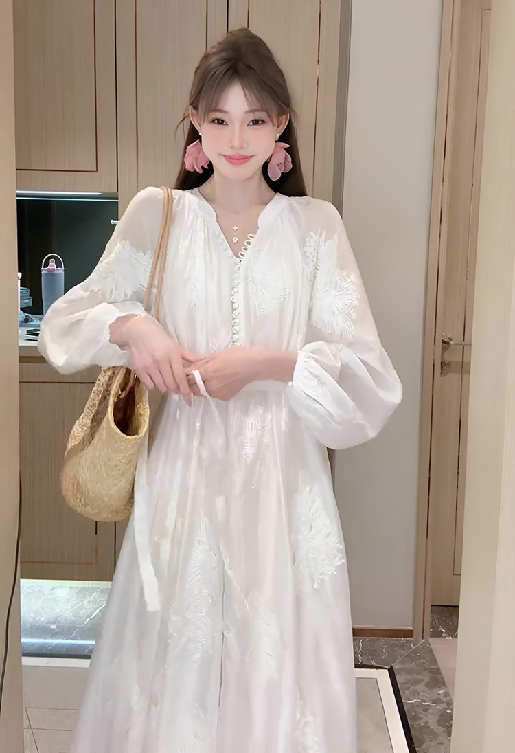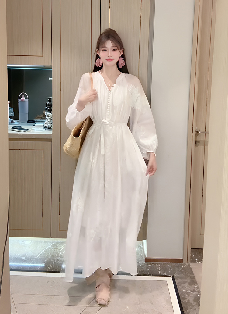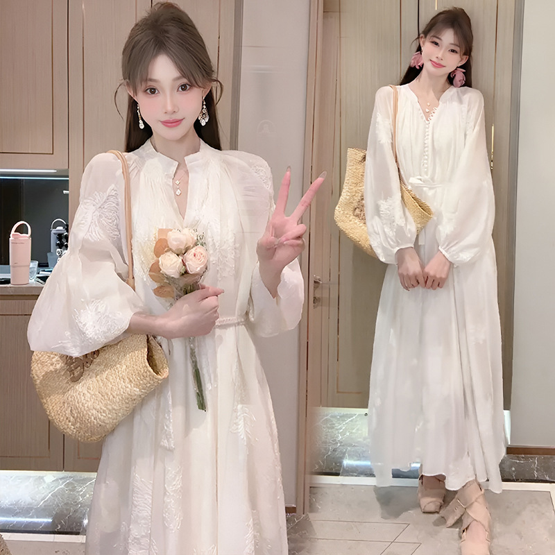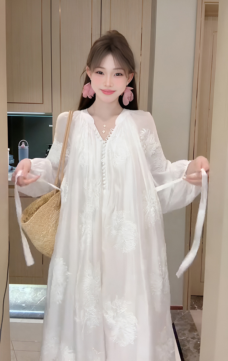 프랑스 하이 엔드 자수 텐셀 긴팔 원피스 2025 봄과 가을 느슨한 게으른 스타일 아름다운 베일 스커트 긴 스커트