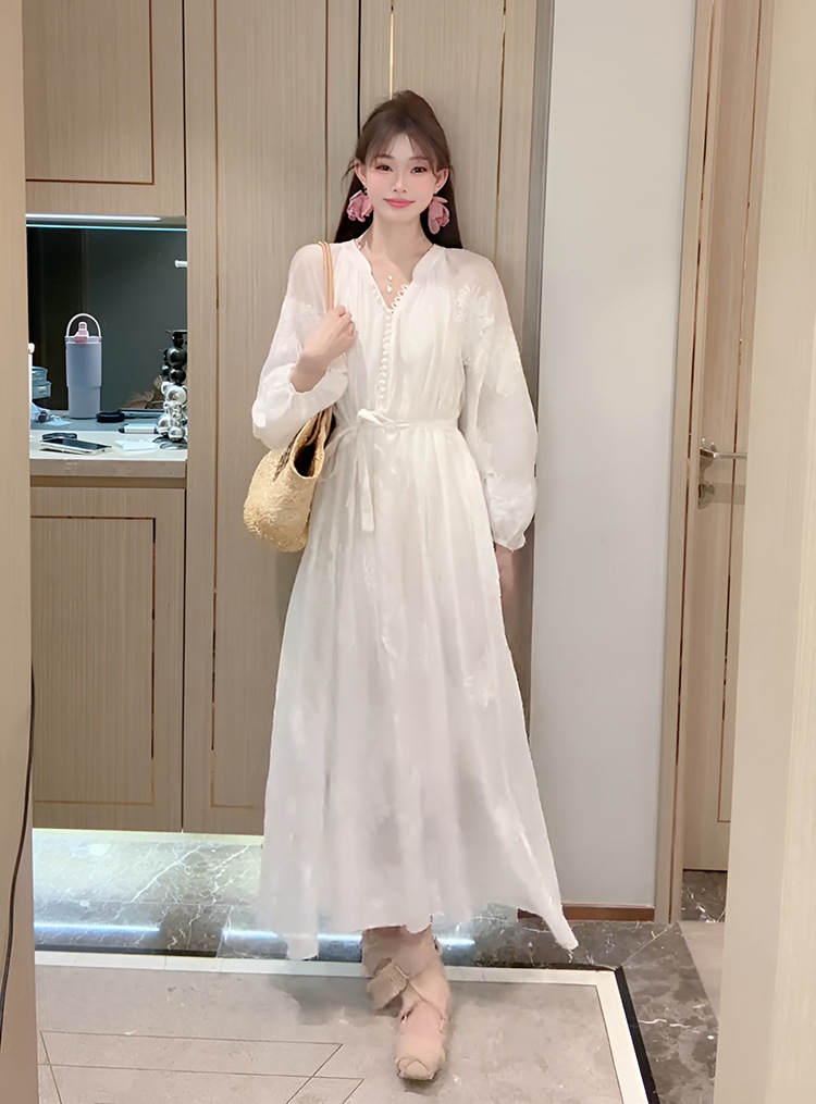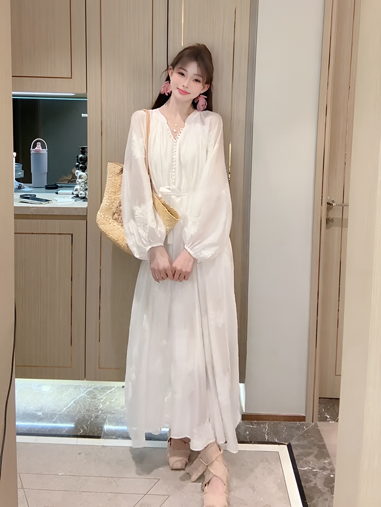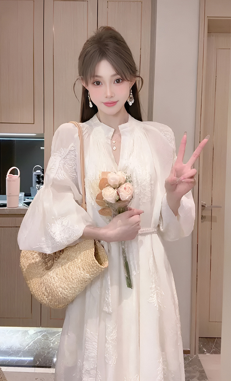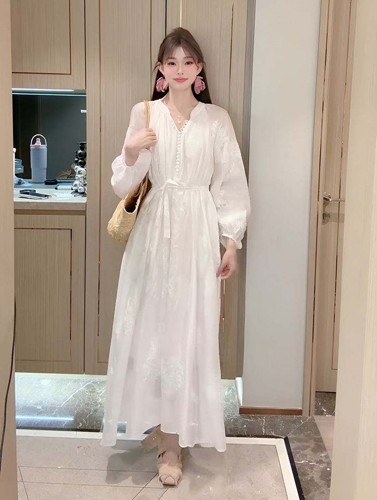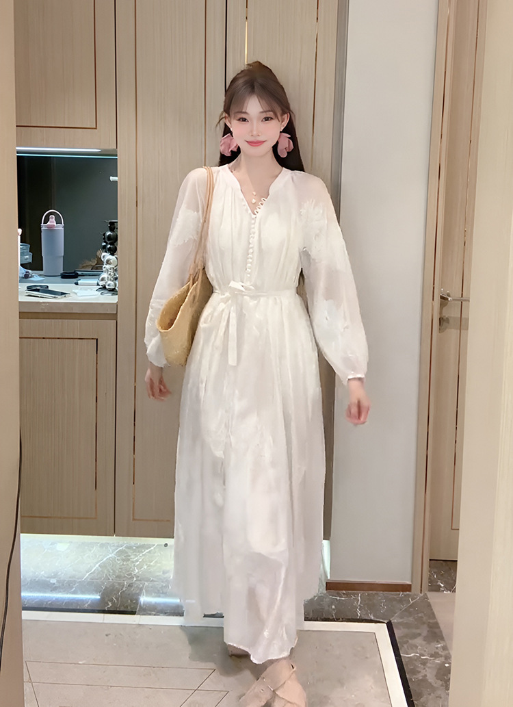 프랑스 하이 엔드 자수 텐셀 긴팔 원피스 2025 봄과 가을 느슨한 게으른 스타일 아름다운 베일 스커트 긴 스커트