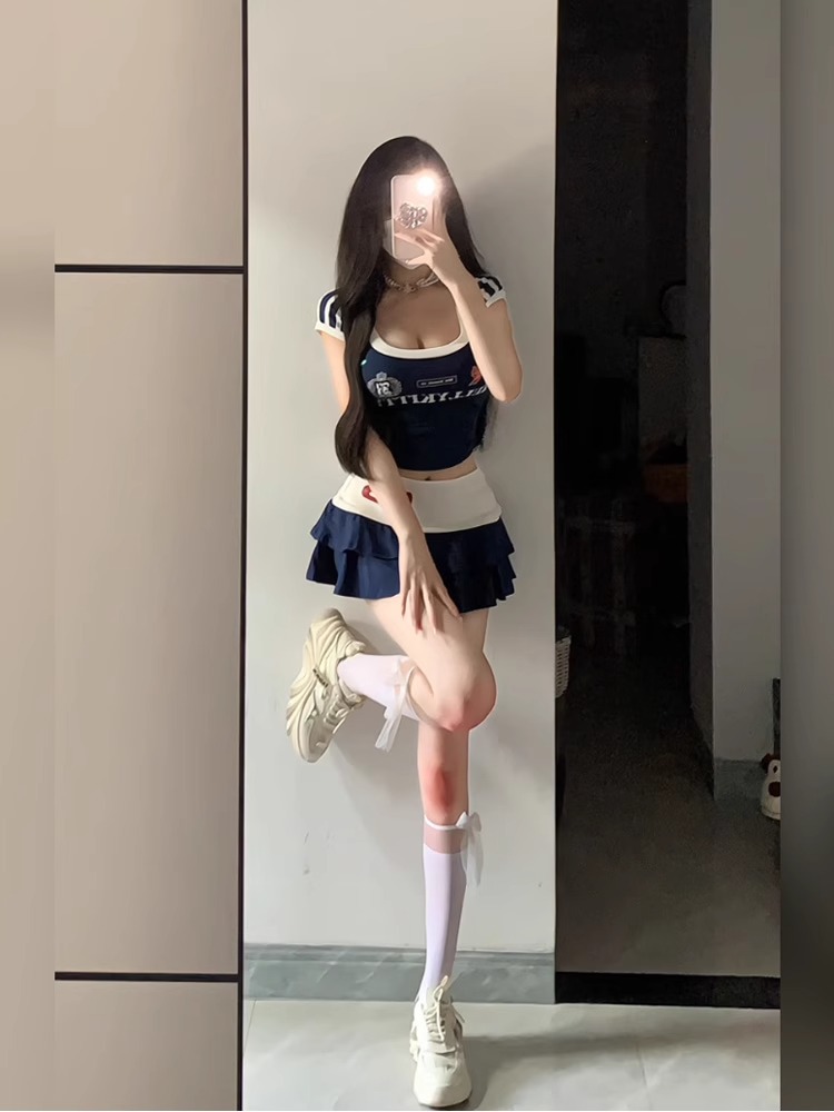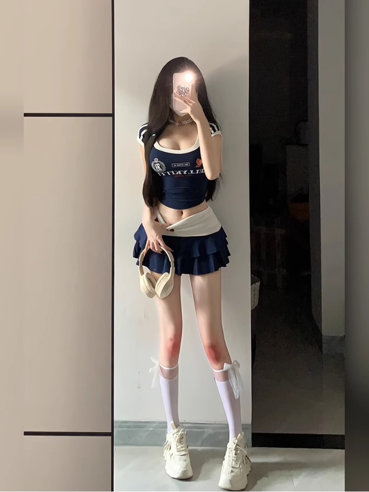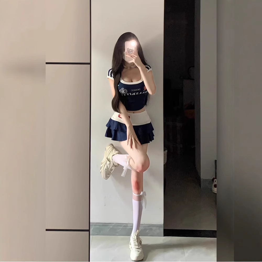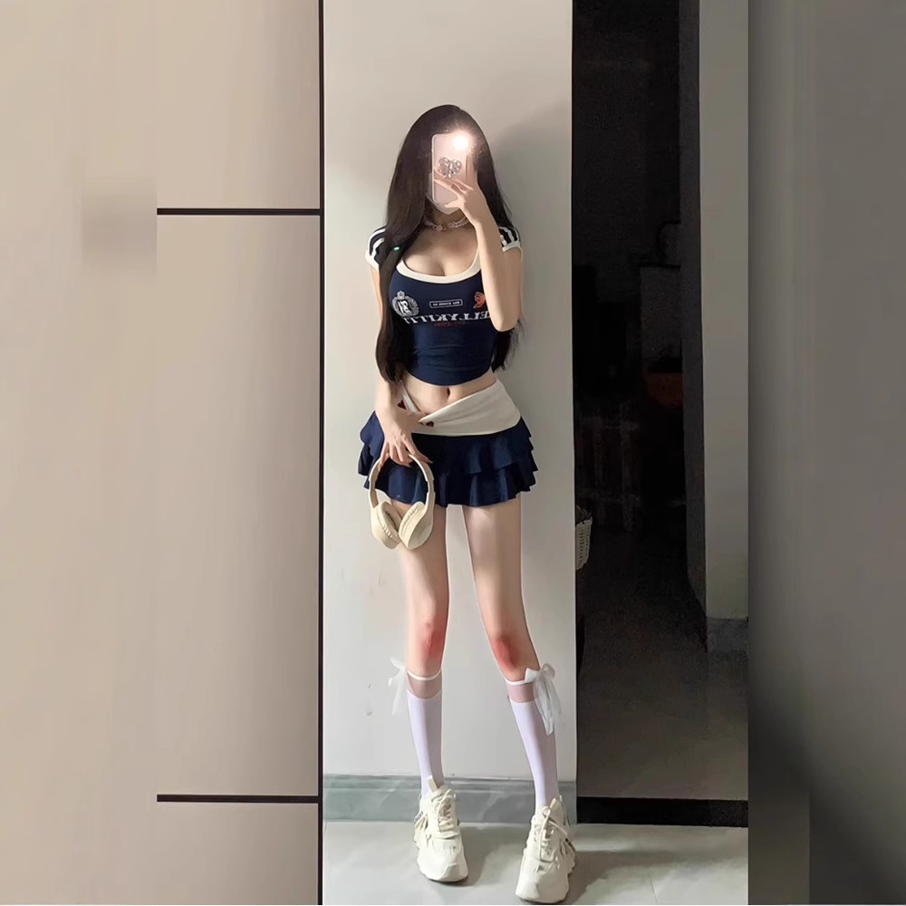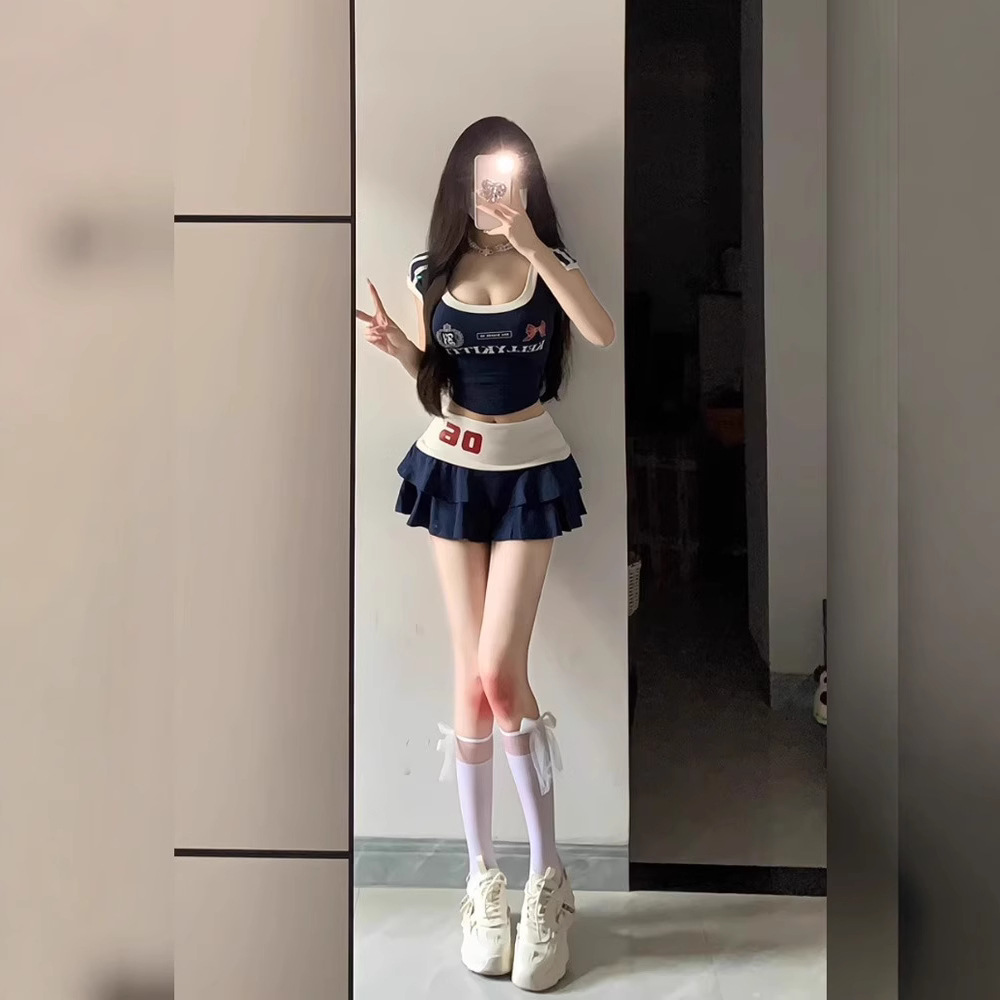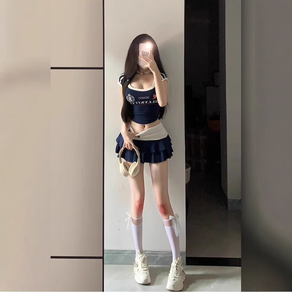 통통한 아메리칸 레트로 콘트라스트 컬러 슬리밍 반팔 티셔츠 최고 여성 여름 스파이스 소녀 스타일 섹시한 A 라인 스커트 스포츠 세트