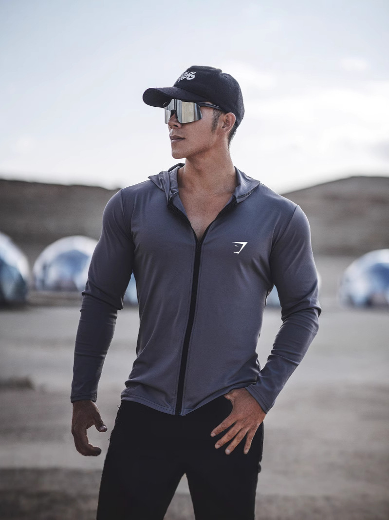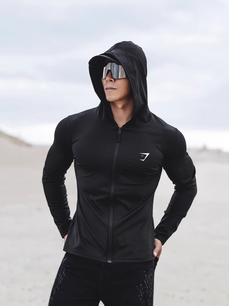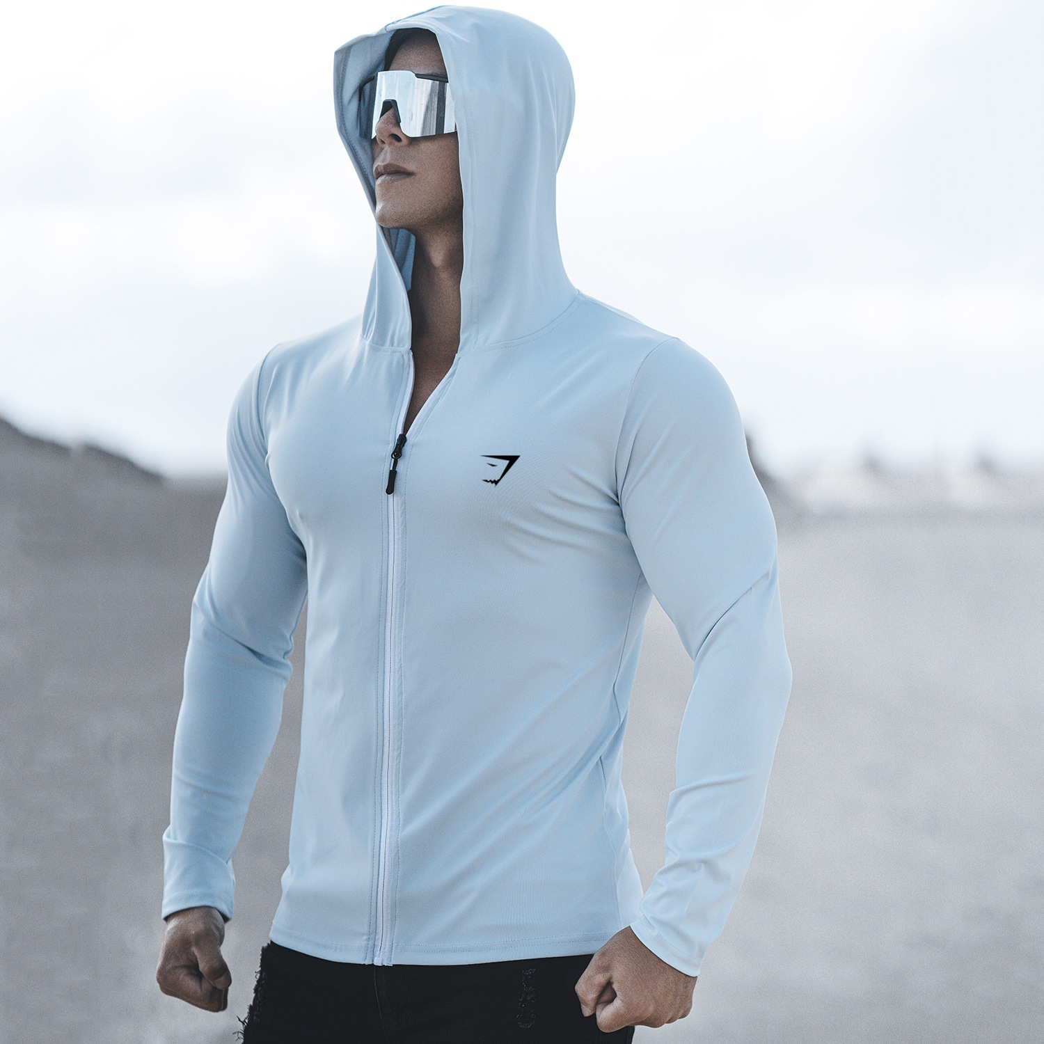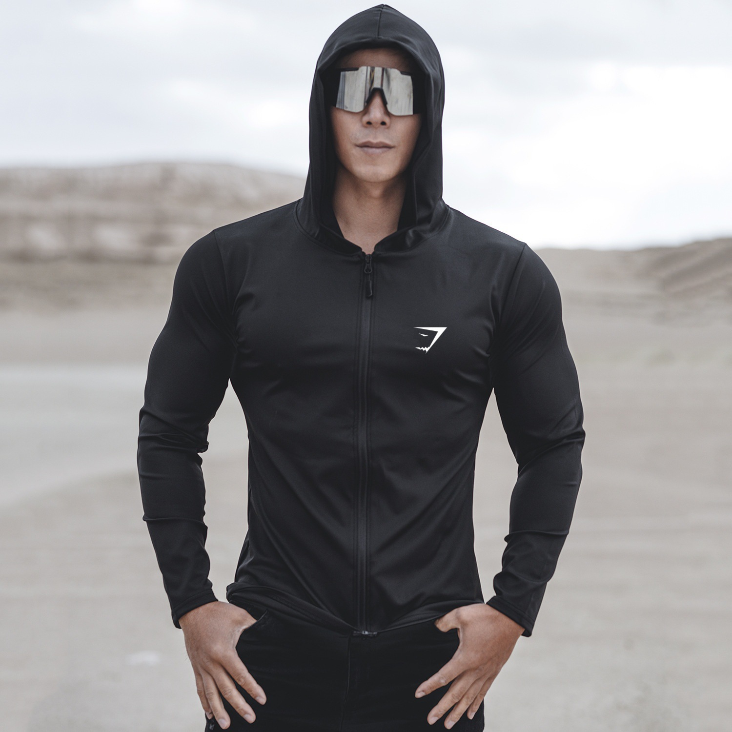 2025 신상품 크로스보더 후드 재킷 남성용 봄 여름 근육 운동 피트니스 얇은 타이트 후드 지퍼 긴팔 셔츠