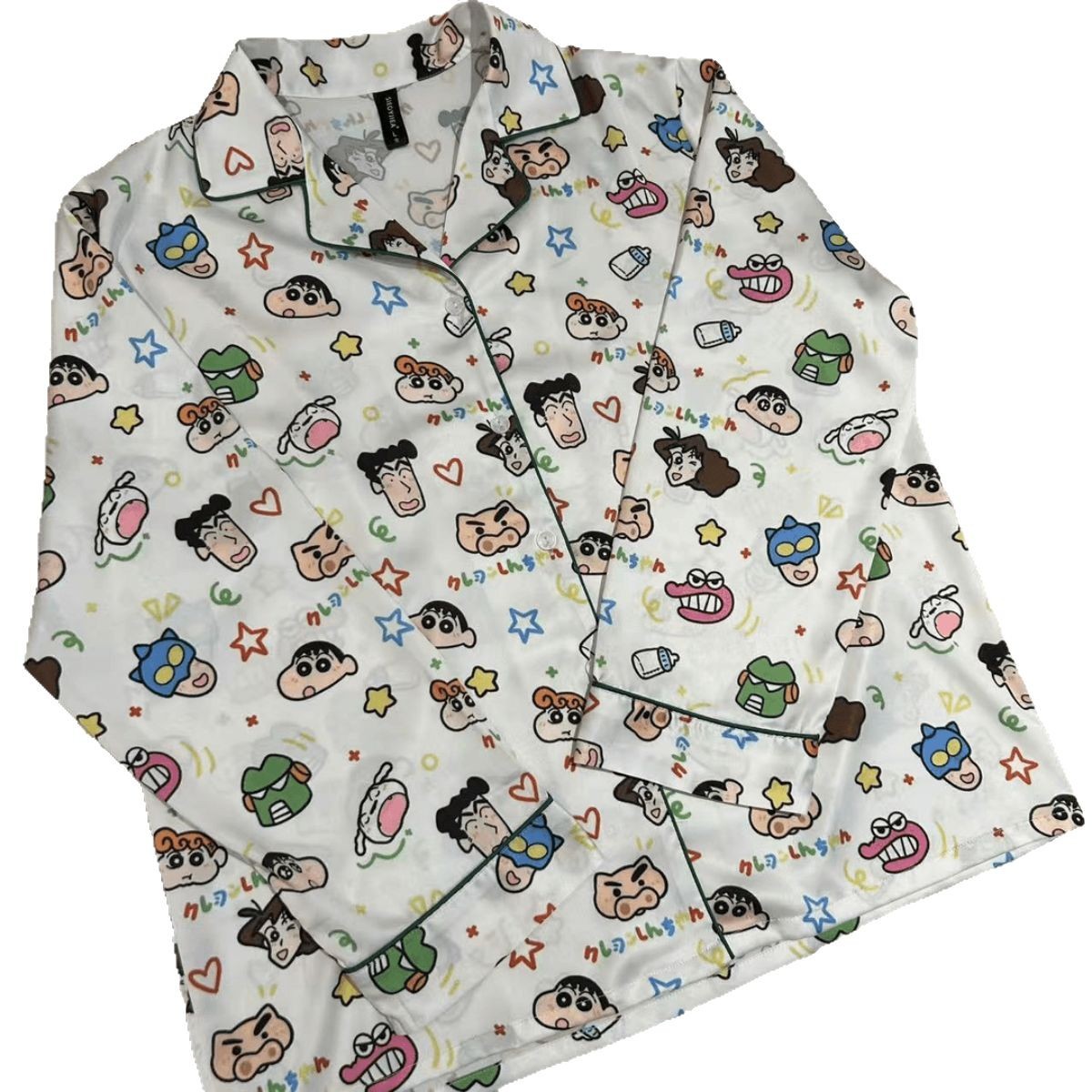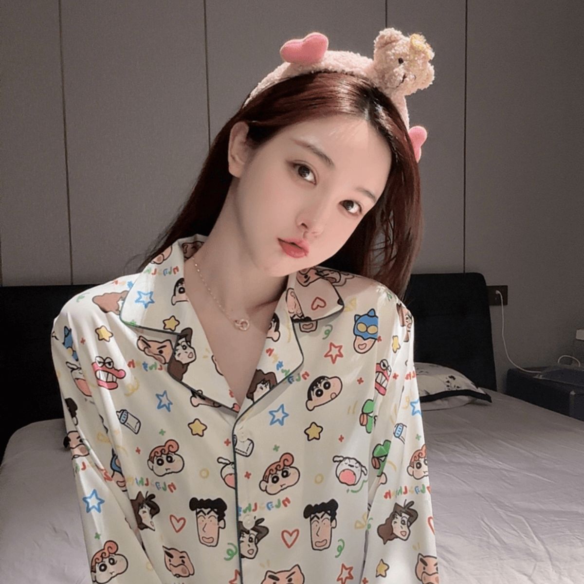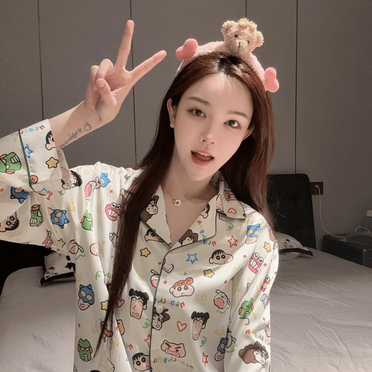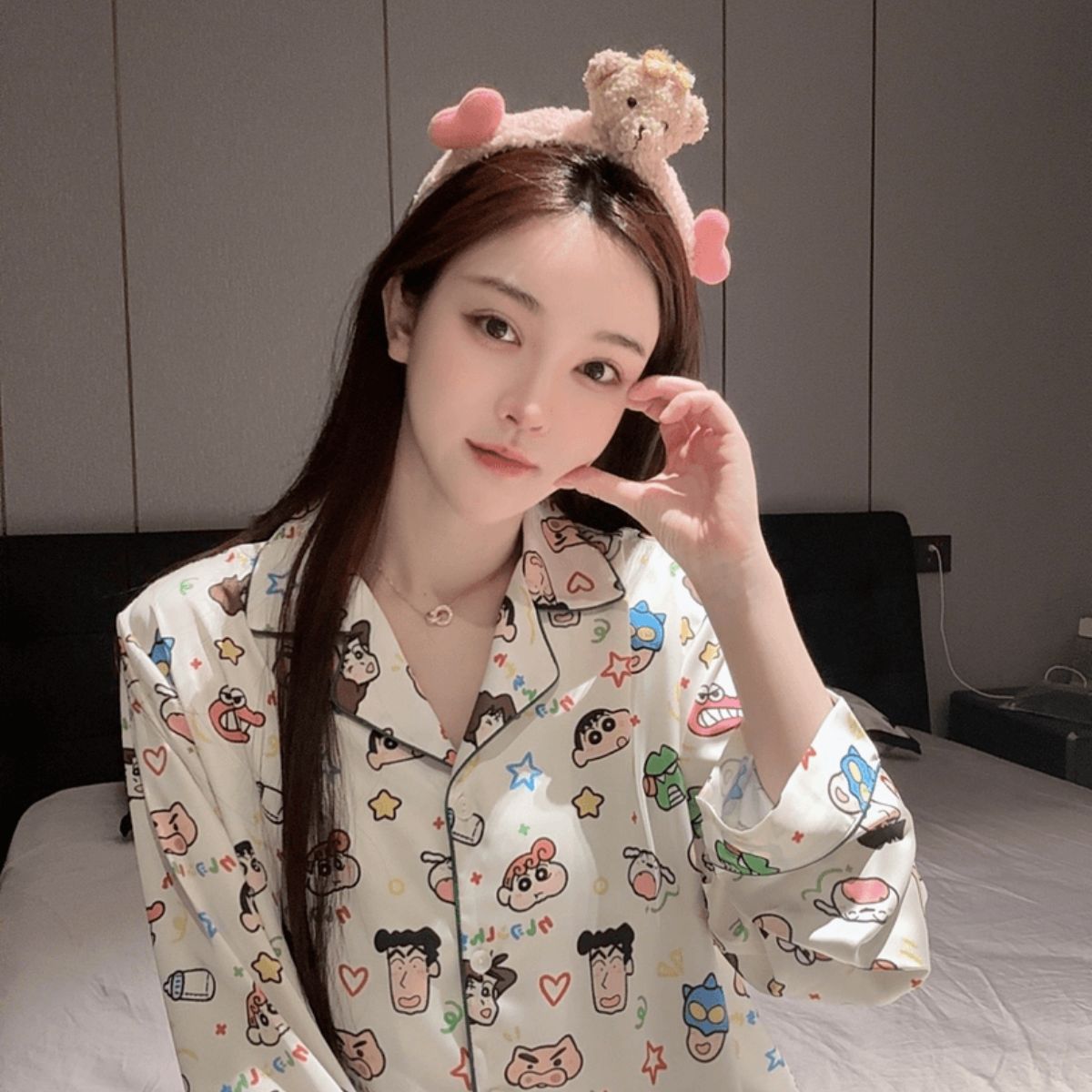 봄과 가을 새로운 아이스 실크 파자마 여성 슈퍼 소프트 위조 4 면 만화 인쇄 긴 소매 바지 홈 의류 세트