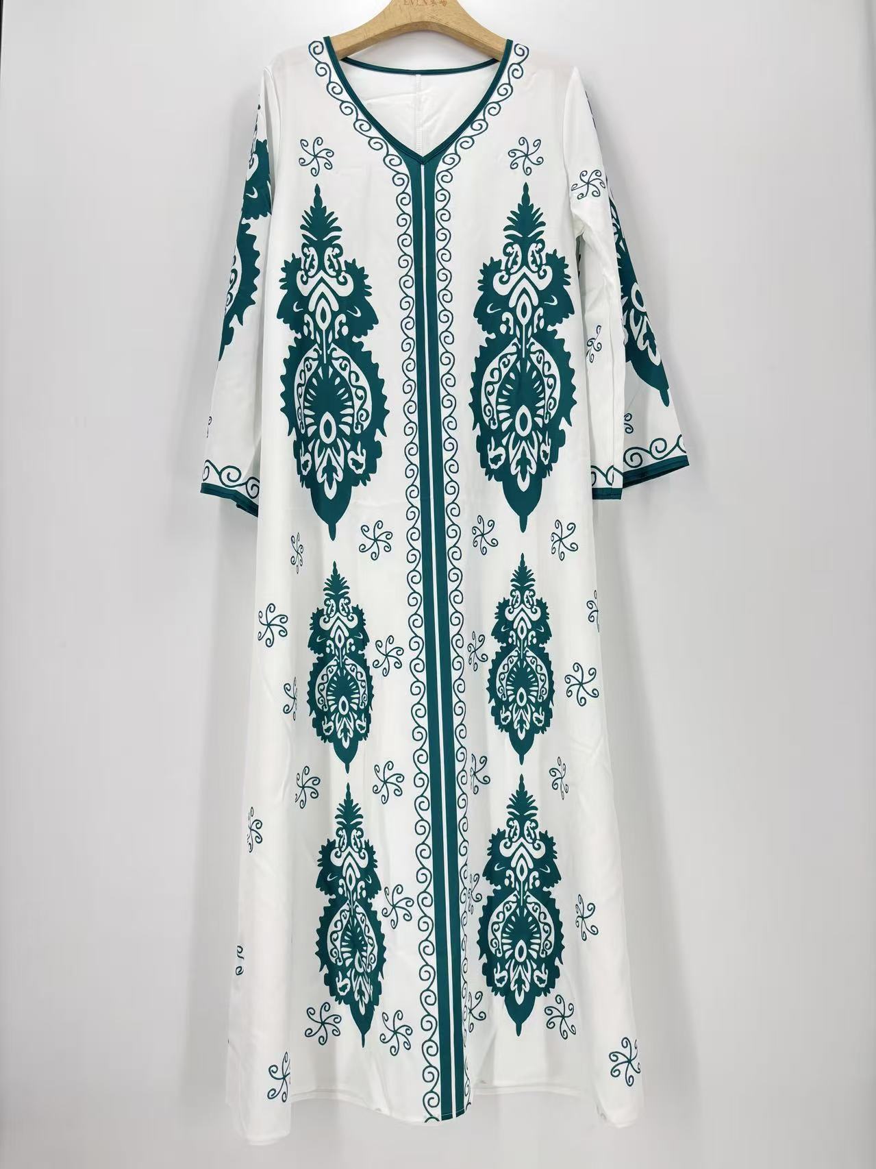 크로스보더 2025 신상 프린트 롱 드레스, 랜턴 슬리브 V넥 원피스, 캐주얼 레이스 비치 휴가 롱 드레스