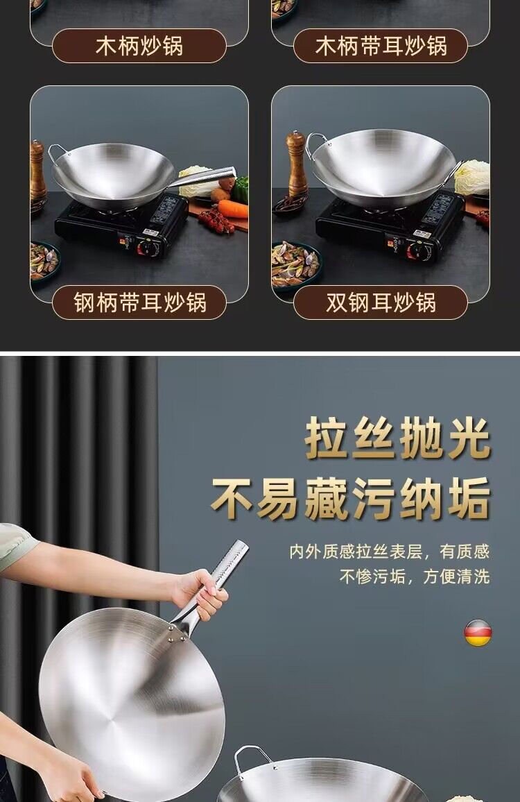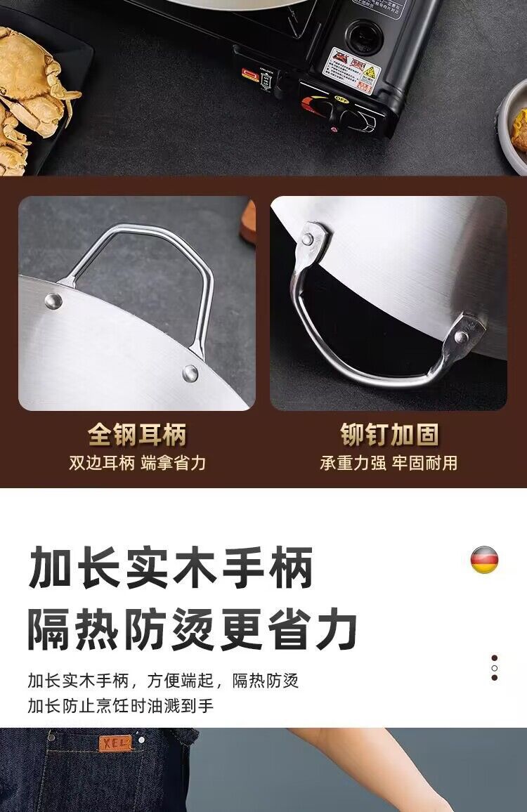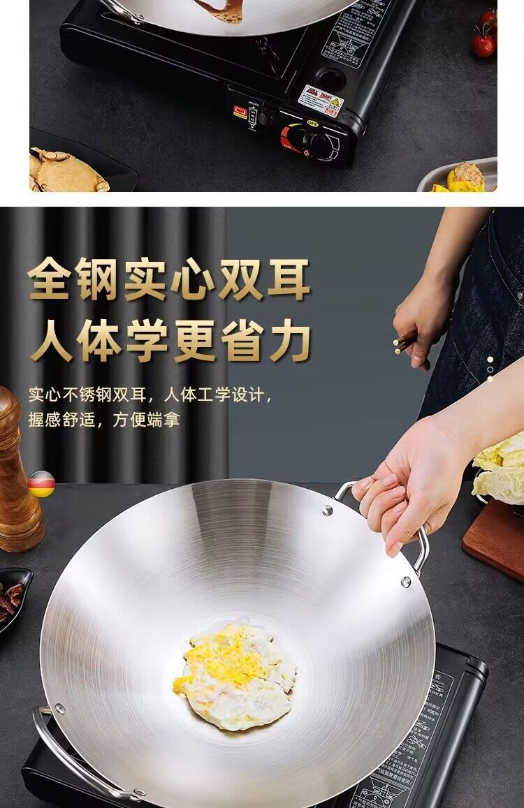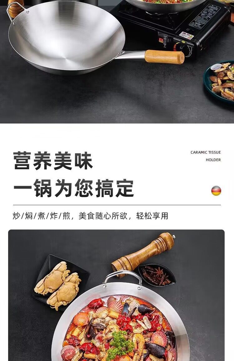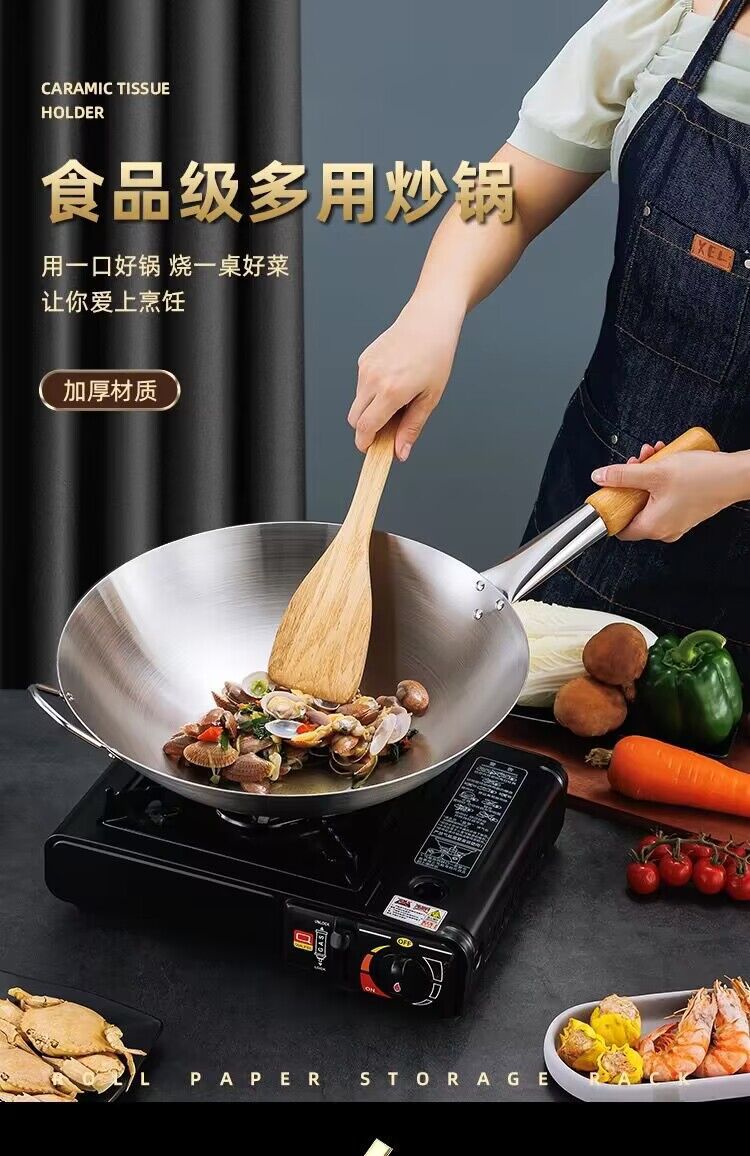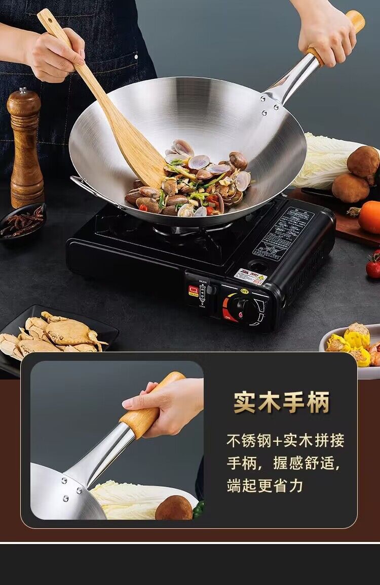 공장 직접 스테인레스 스틸 wok 비 자기 비 코팅 이중 귀 두꺼운 가정용 단일 핸들 나무 손잡이 비 스틱 웍