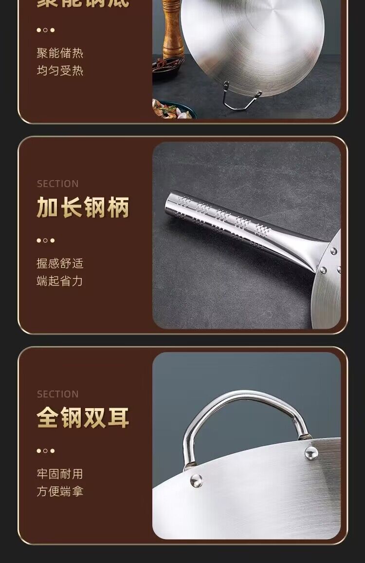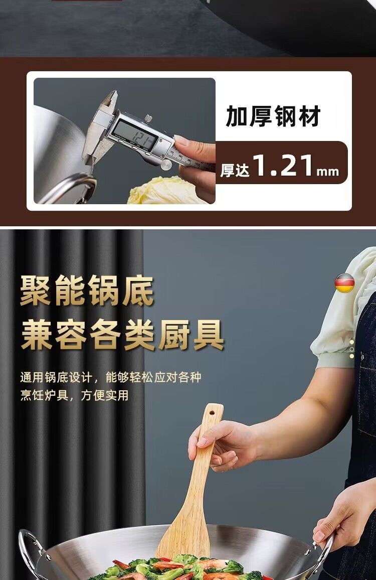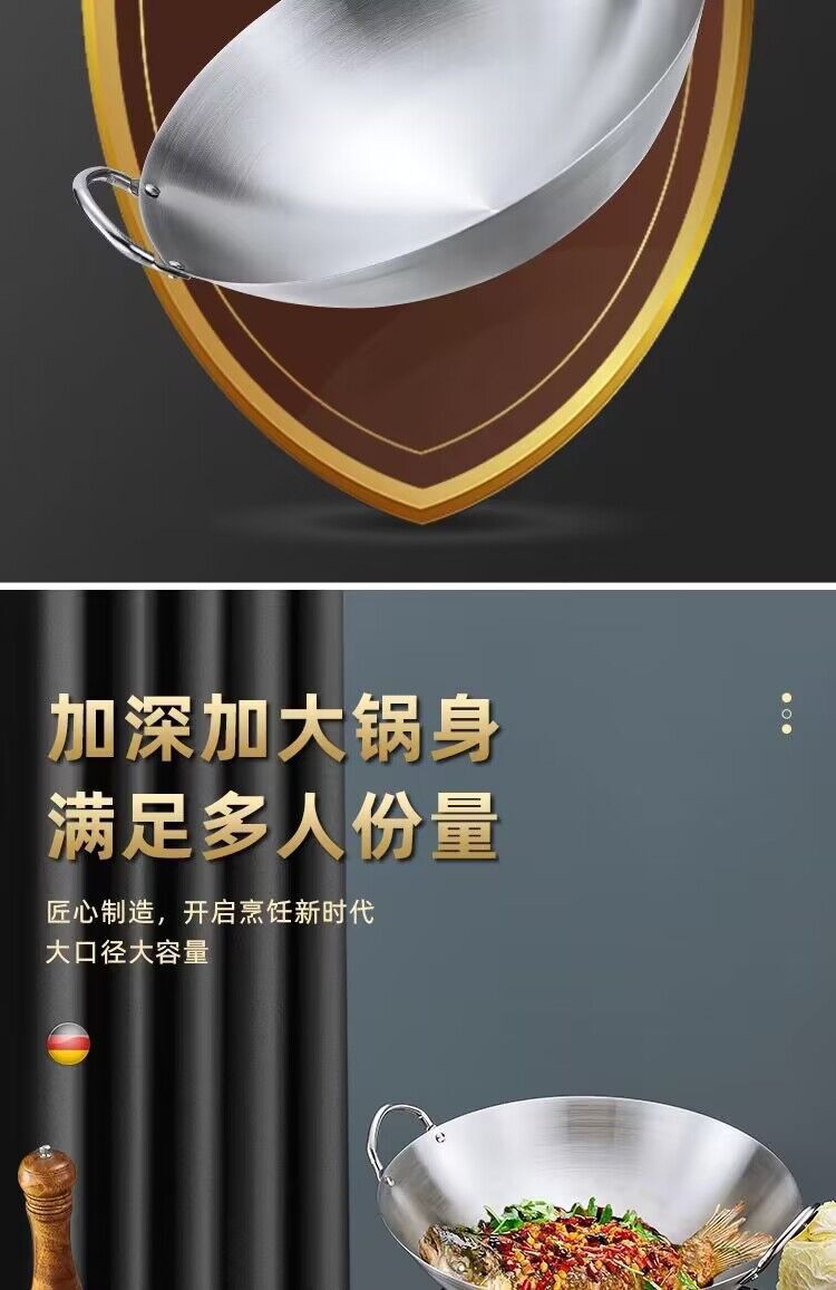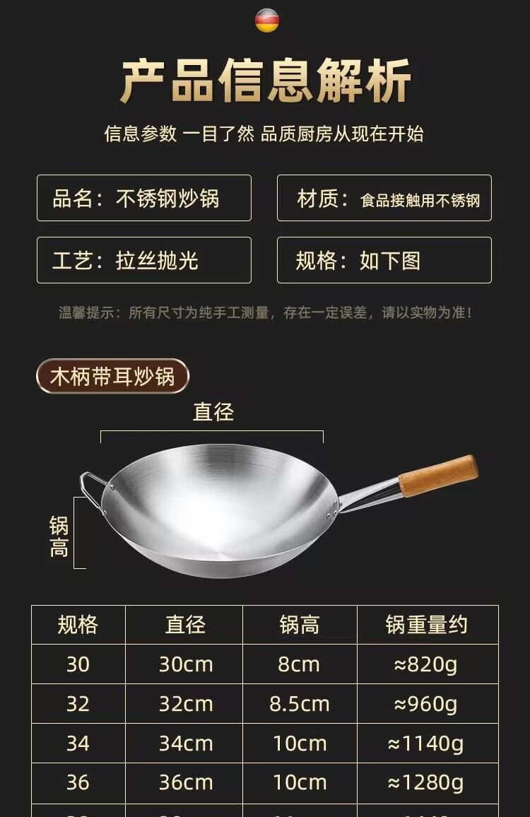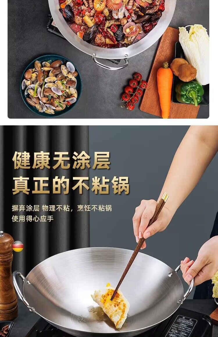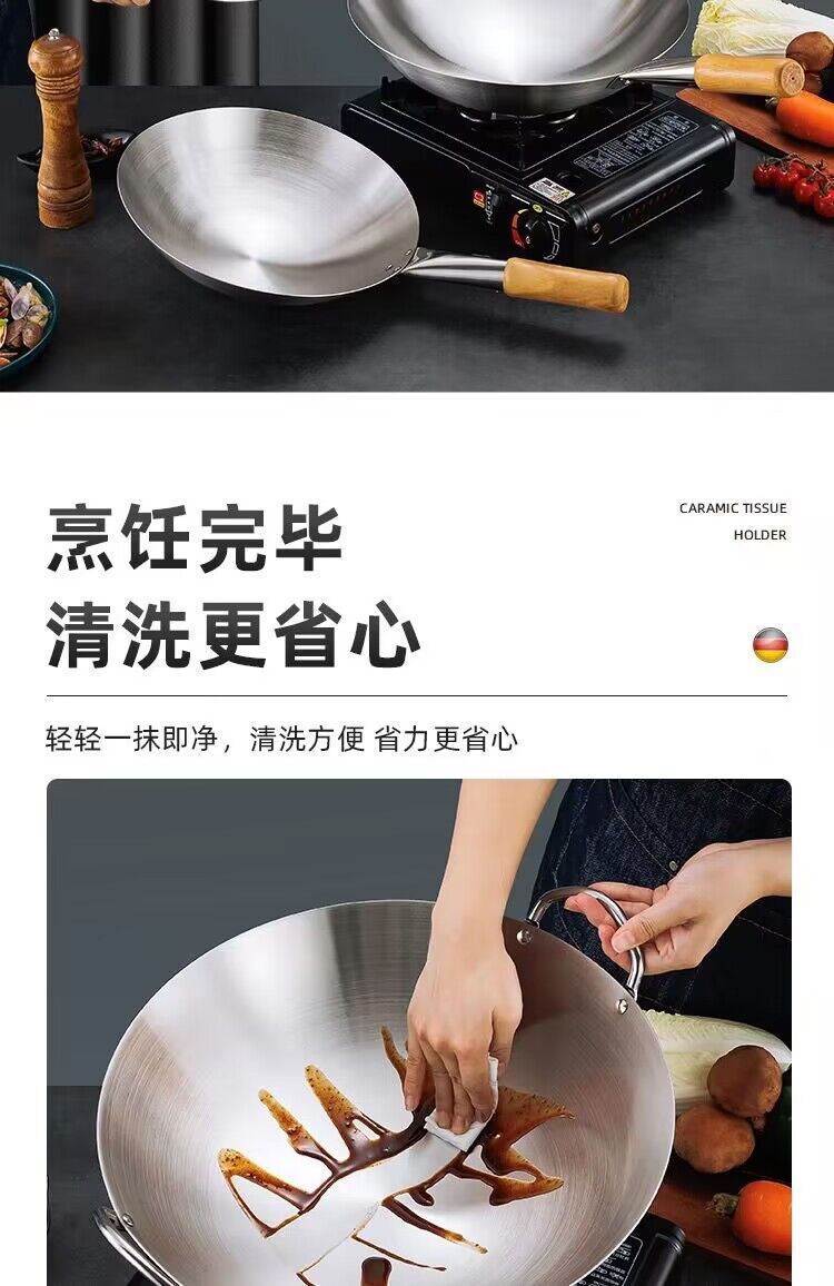 공장 직접 스테인레스 스틸 wok 비 자기 비 코팅 이중 귀 두꺼운 가정용 단일 핸들 나무 손잡이 비 스틱 웍