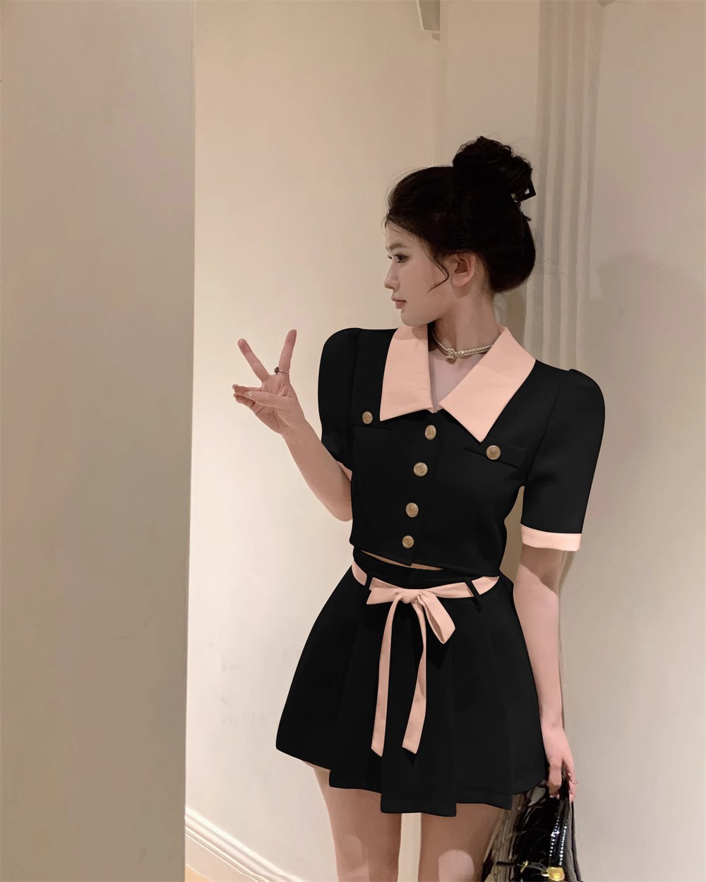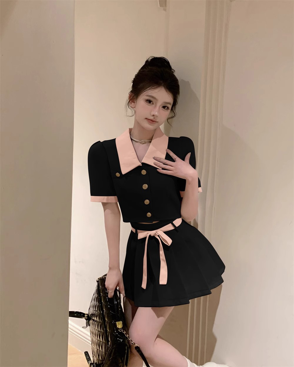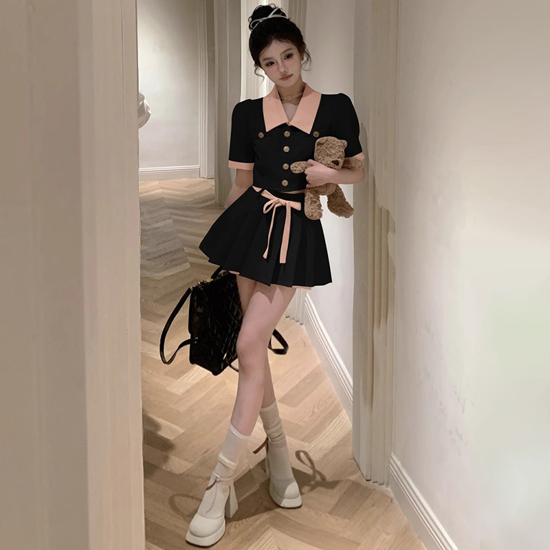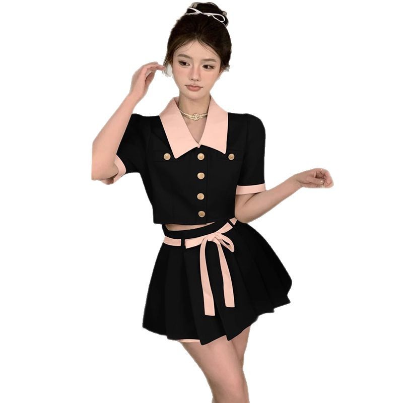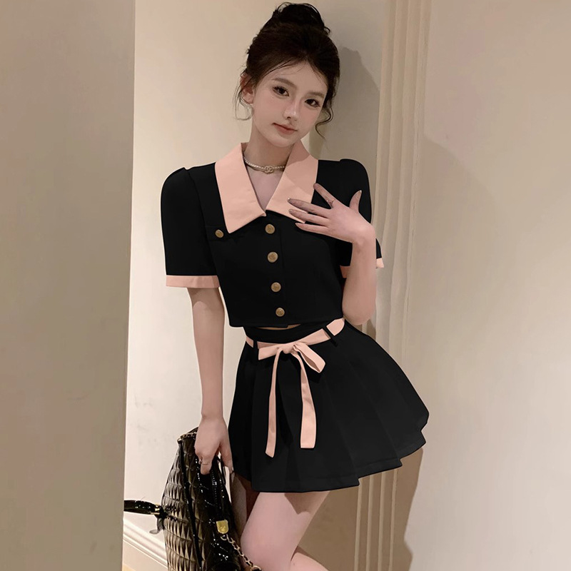 달콤한 분위기 감각 대비 옷깃 반팔 최고 여성 여름 새로운 높은 허리 슬리밍 캐주얼 스커트 투피스 세트