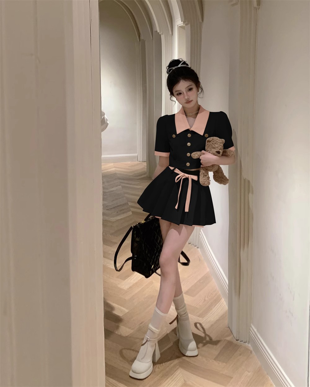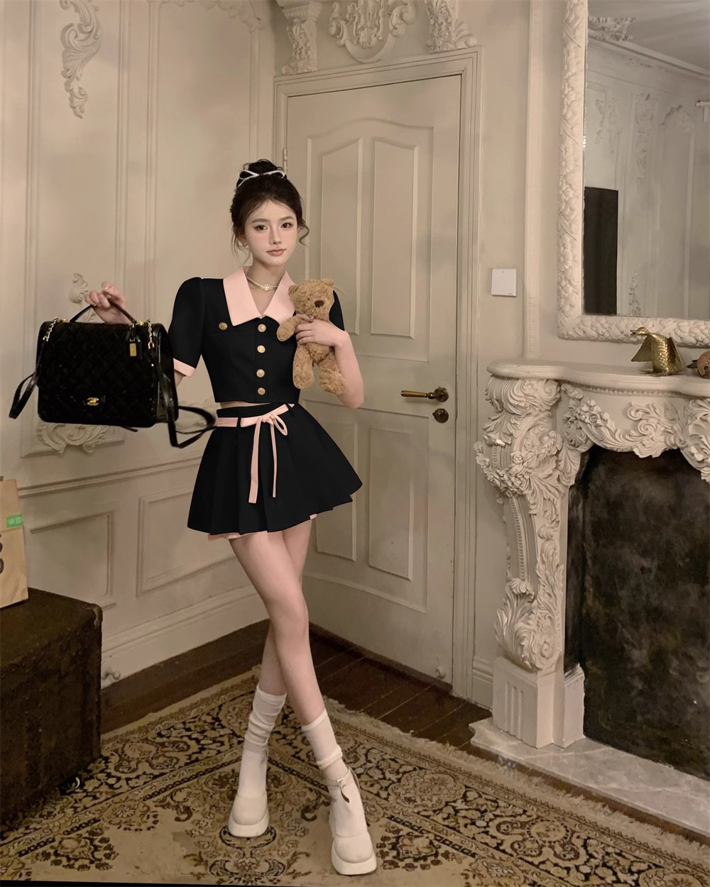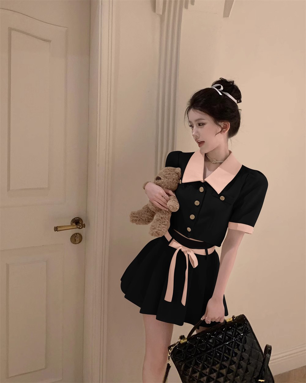 달콤한 분위기 감각 대비 옷깃 반팔 최고 여성 여름 새로운 높은 허리 슬리밍 캐주얼 스커트 투피스 세트