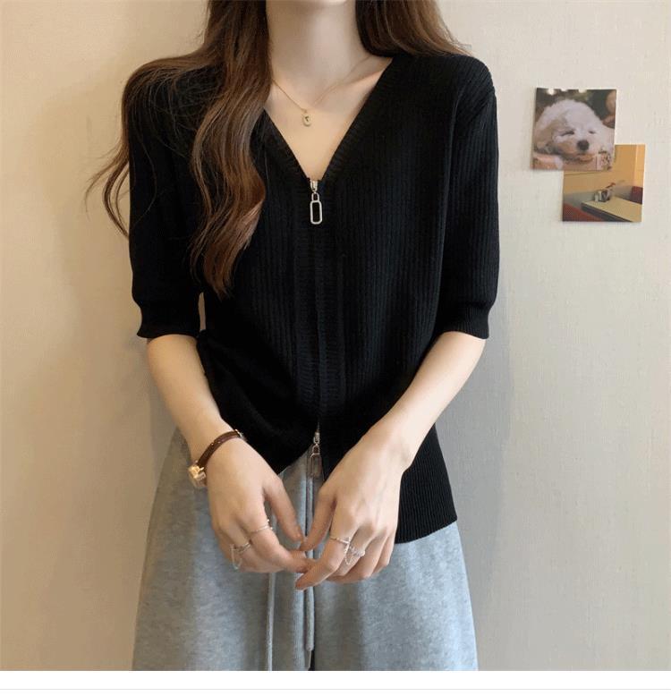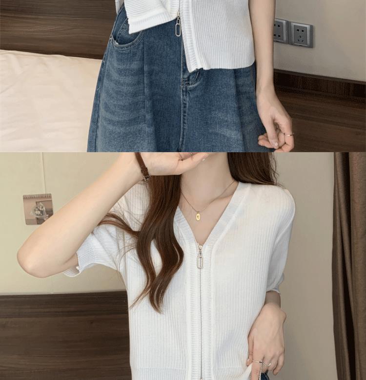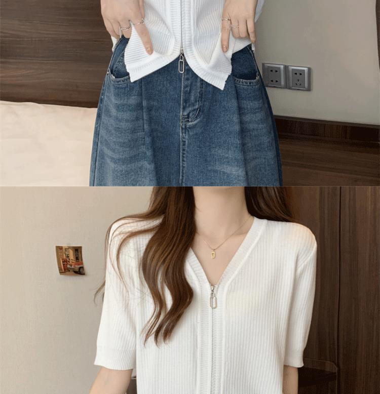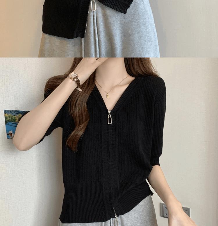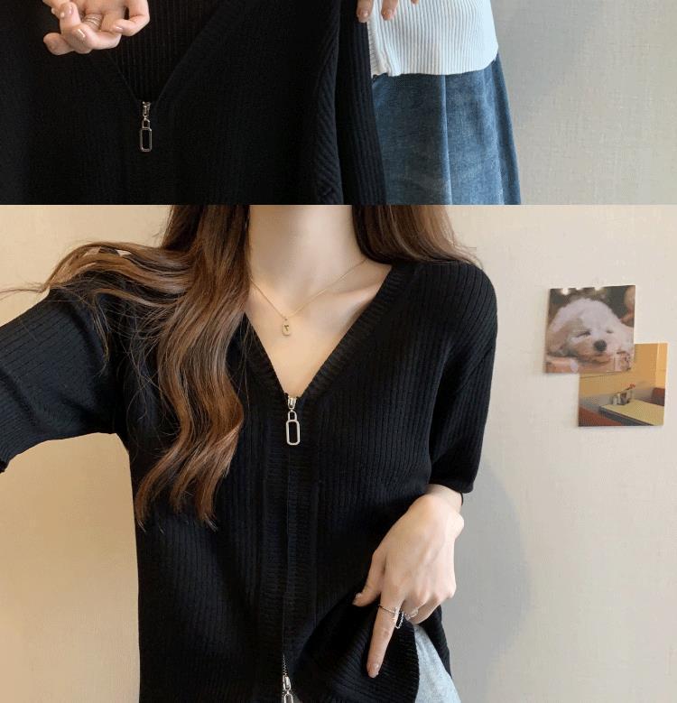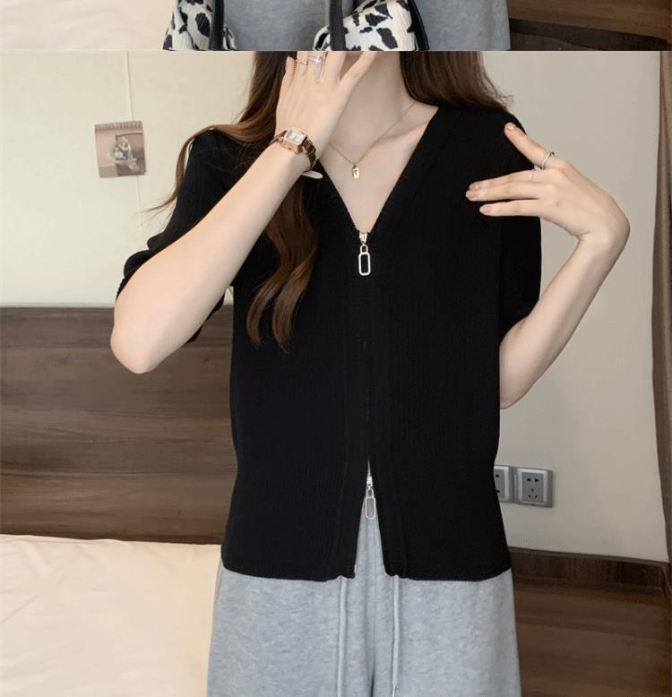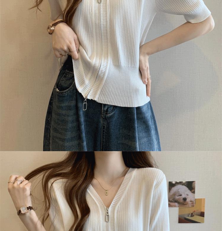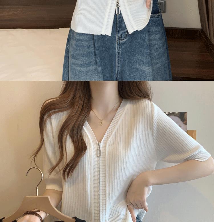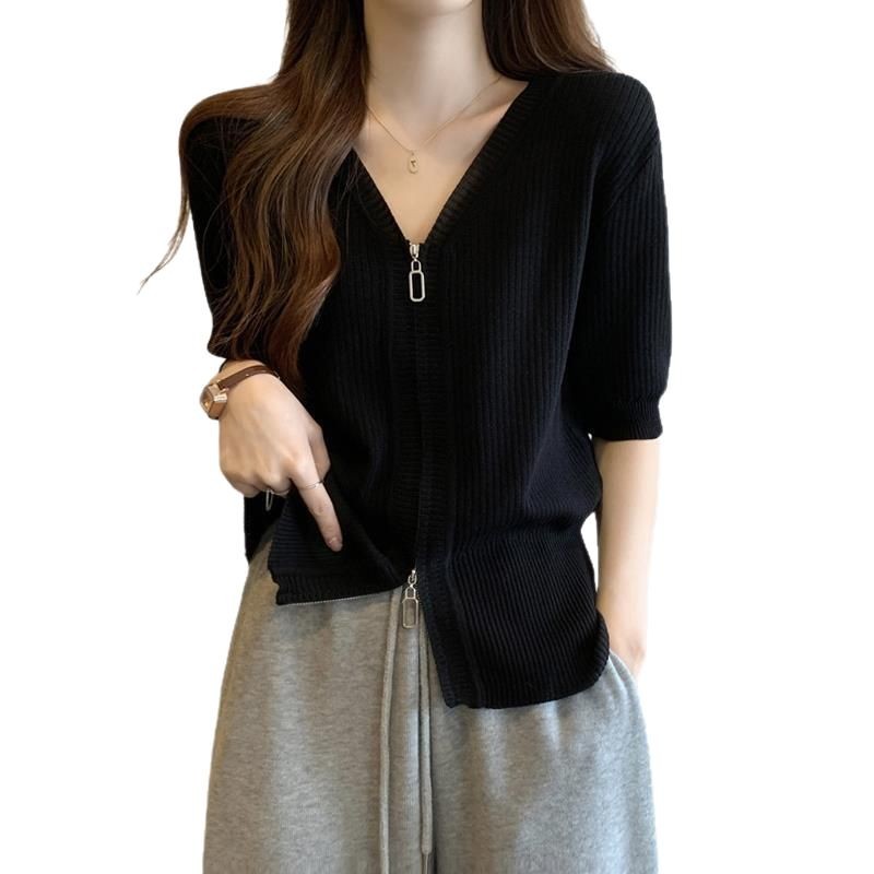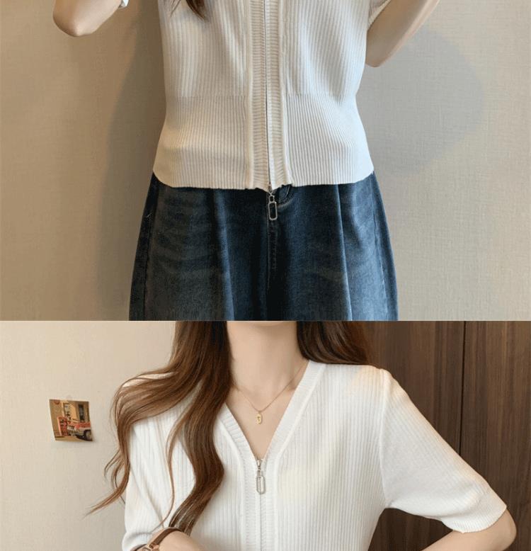 플러스 사이즈 여성 한국식 배꼽 덮음 아이스 실크 반소매 베이스 모조 니트웨어 여성 여름 통통녀 슬리밍 지퍼 어깨
