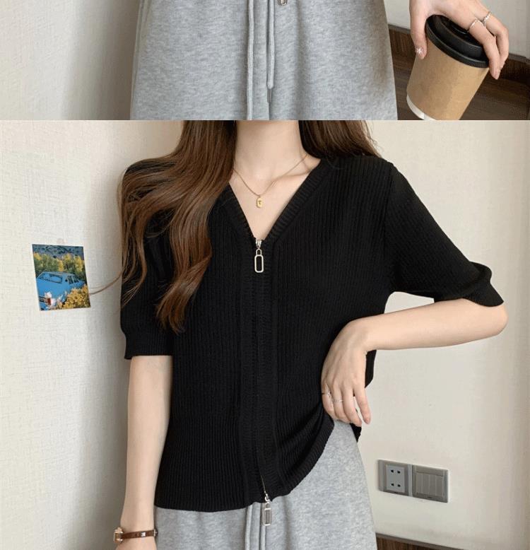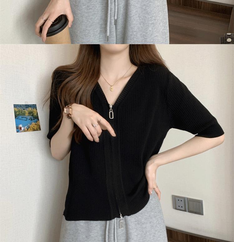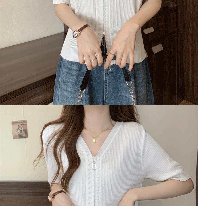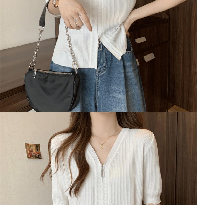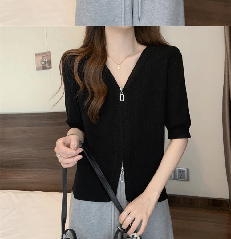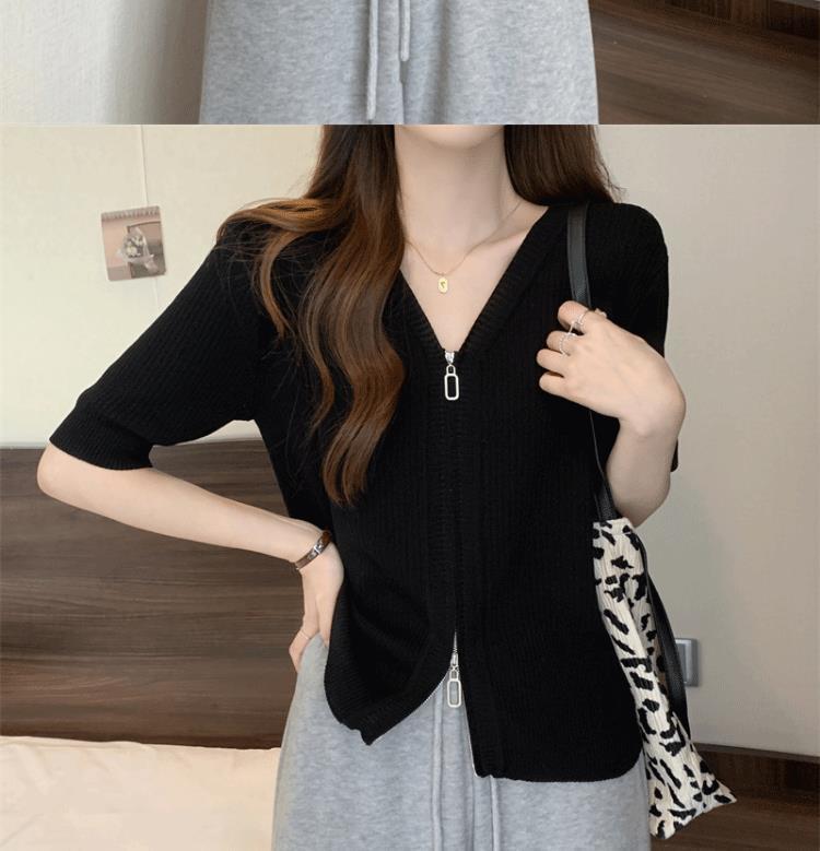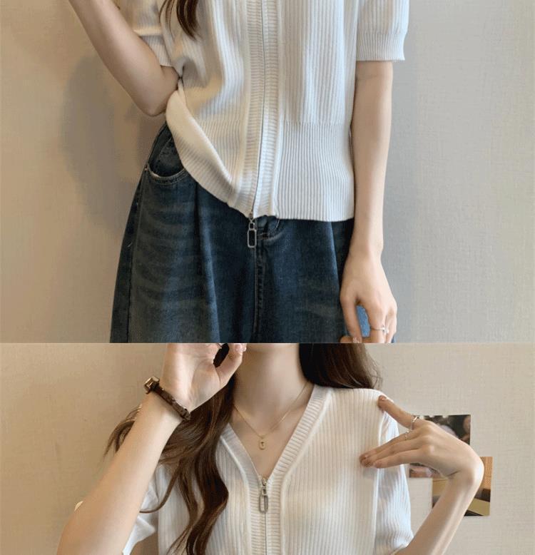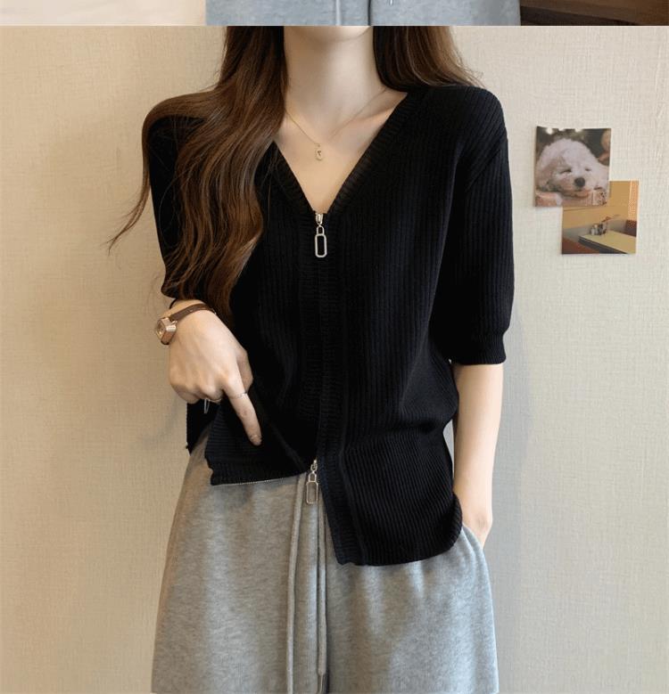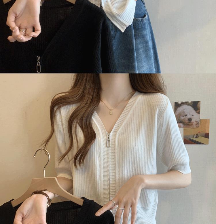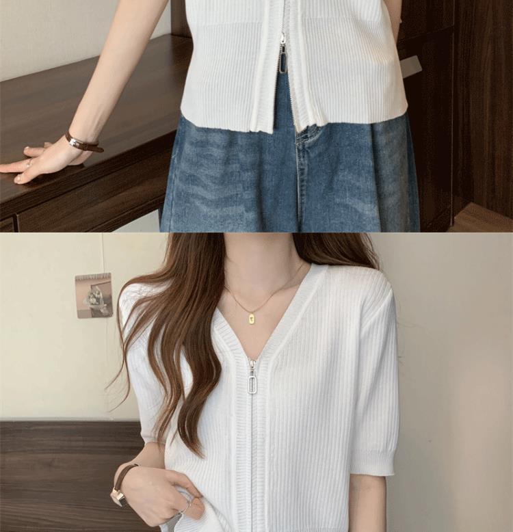 플러스 사이즈 여성 한국식 배꼽 덮음 아이스 실크 반소매 베이스 모조 니트웨어 여성 여름 통통녀 슬리밍 지퍼 어깨