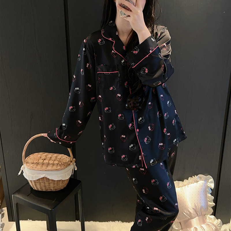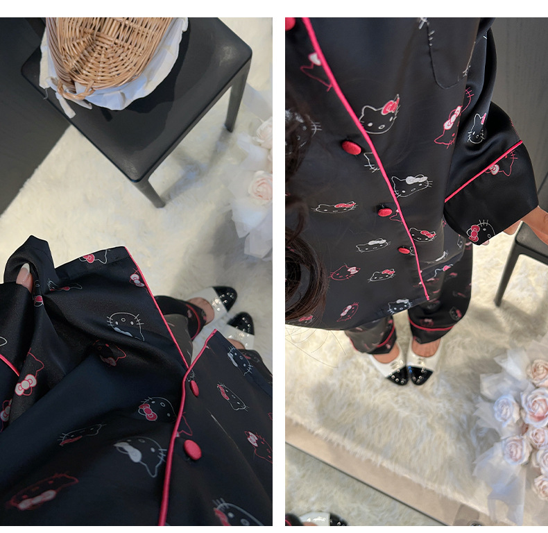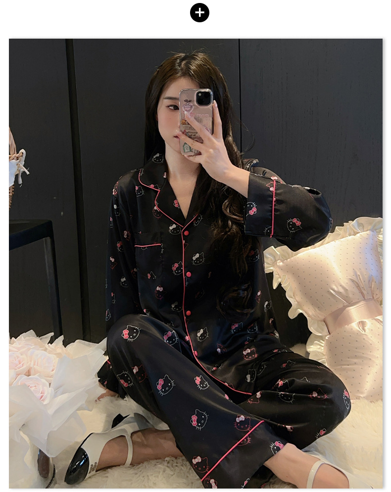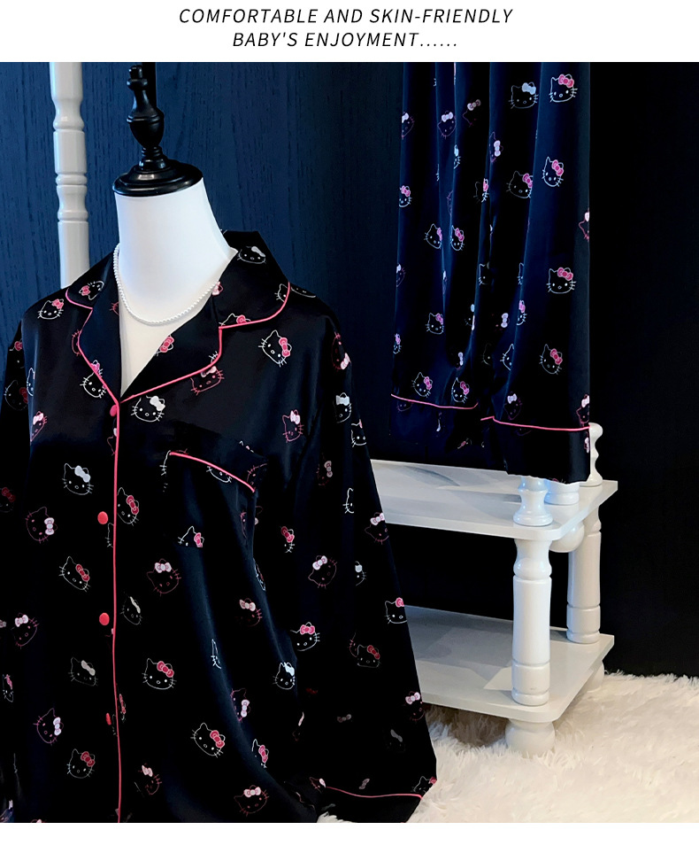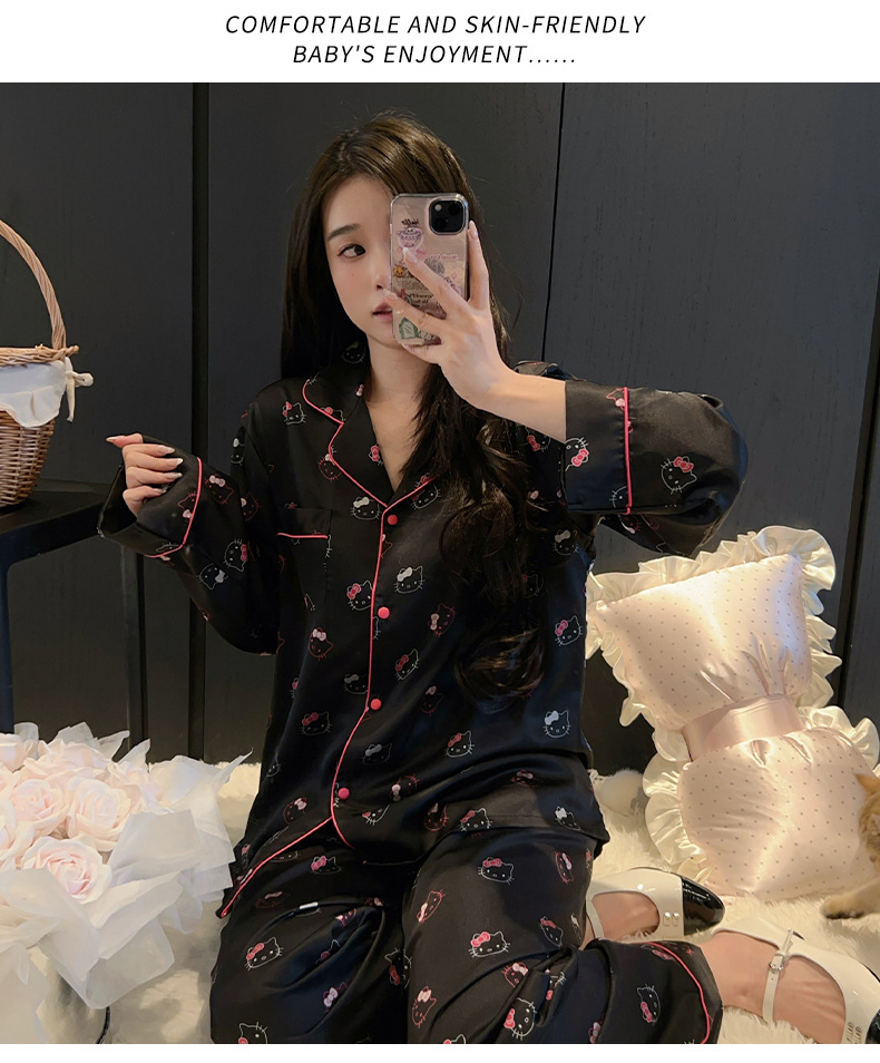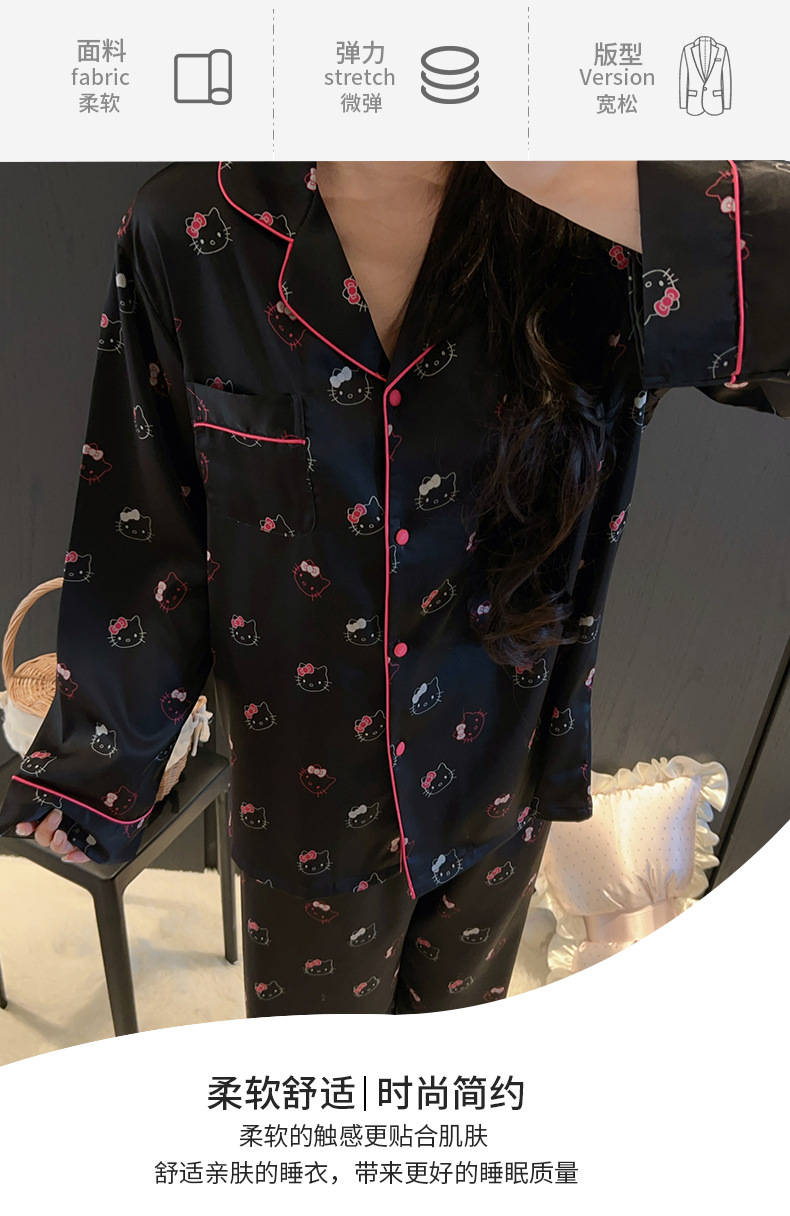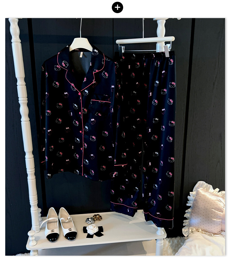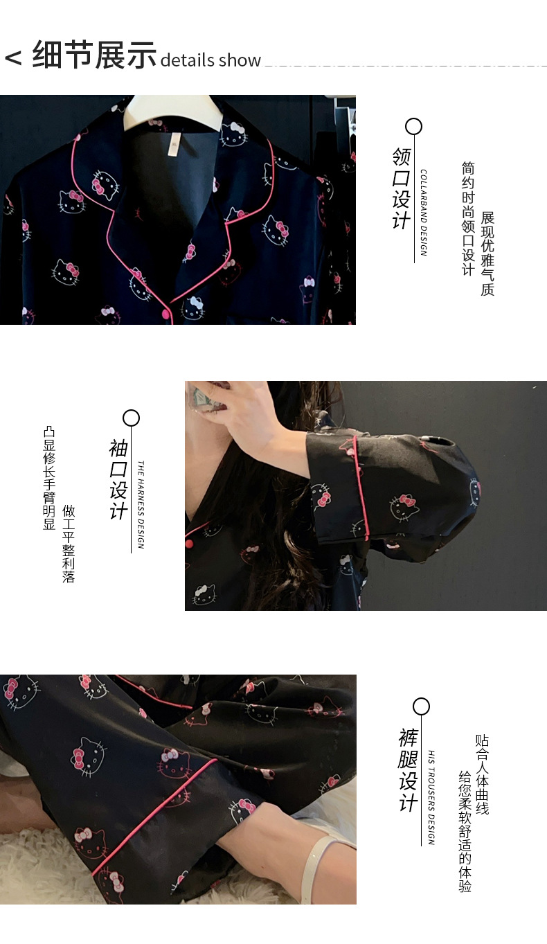 하이 엔드 KT 고양이 아이스 실크 파자마 여성 3 종 세트 봄 실크 만화 달콤한 소녀의 홈 옷 세트 얇은