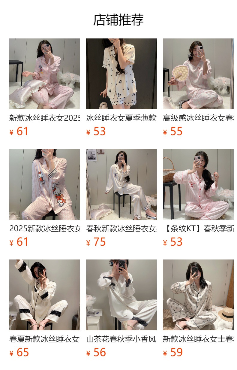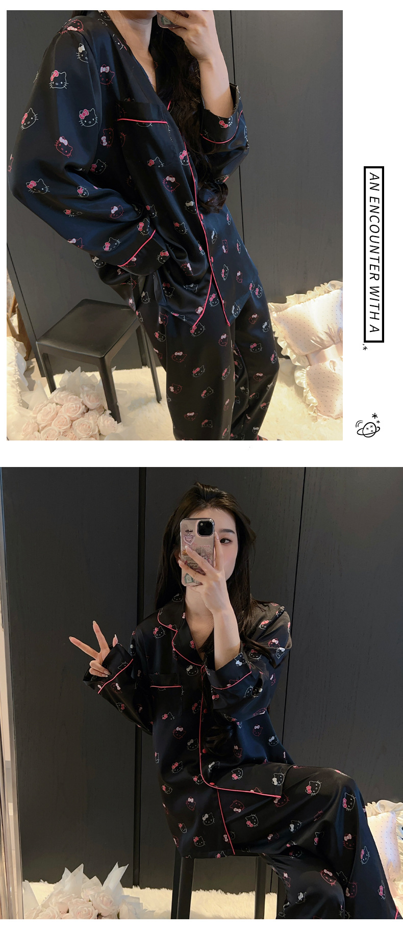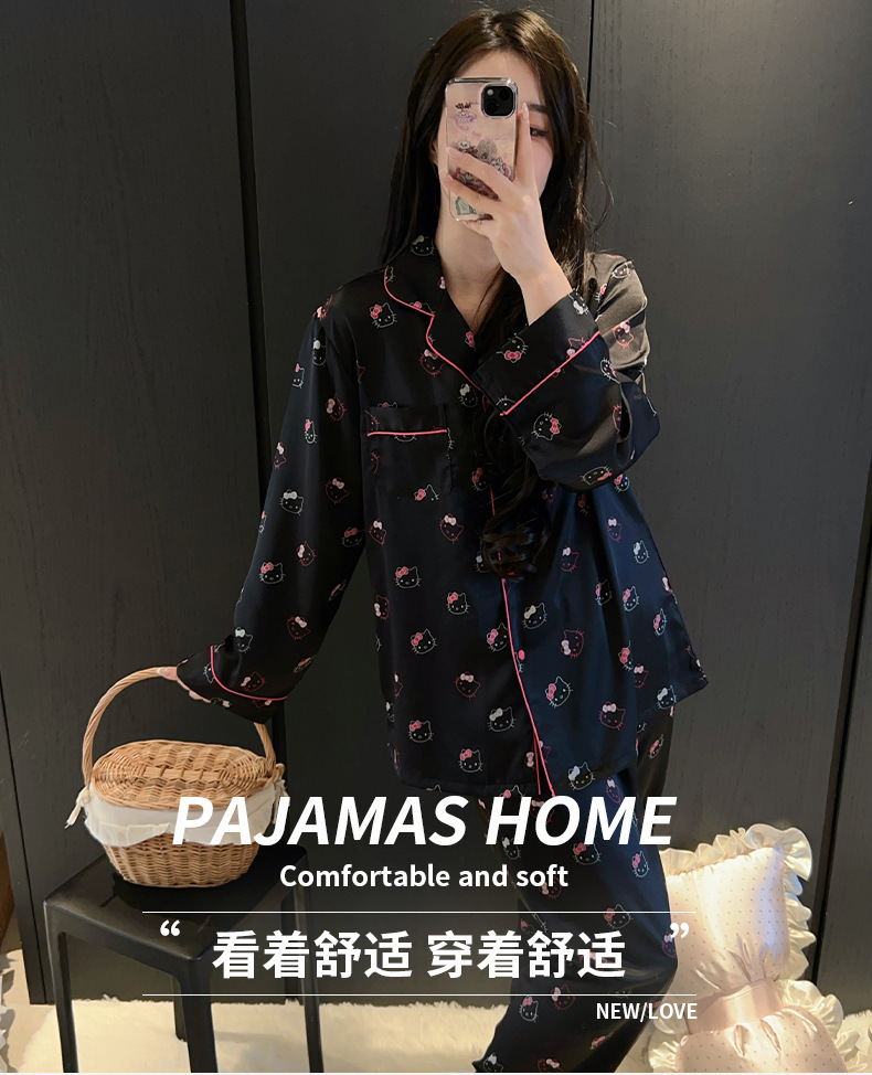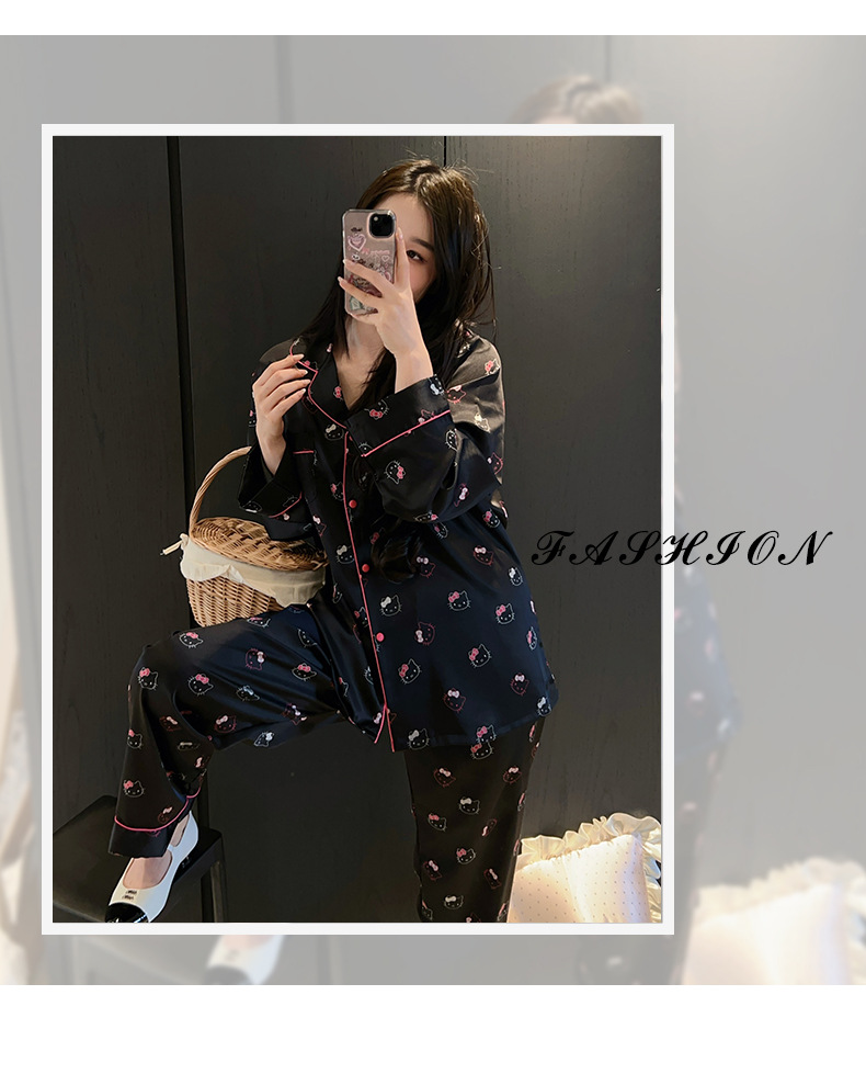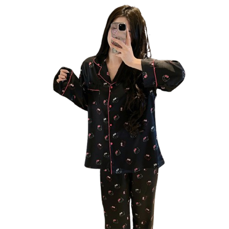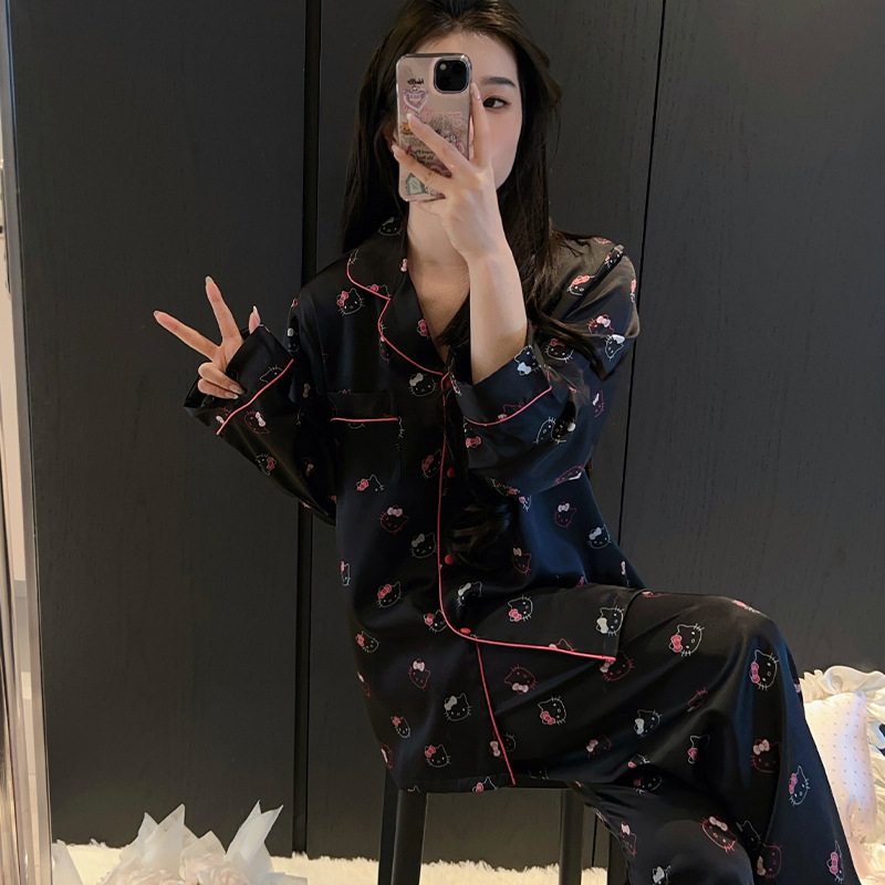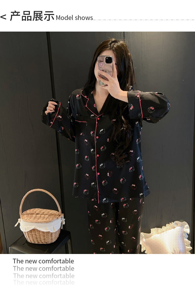 하이 엔드 KT 고양이 아이스 실크 파자마 여성 3 종 세트 봄 실크 만화 달콤한 소녀의 홈 옷 세트 얇은