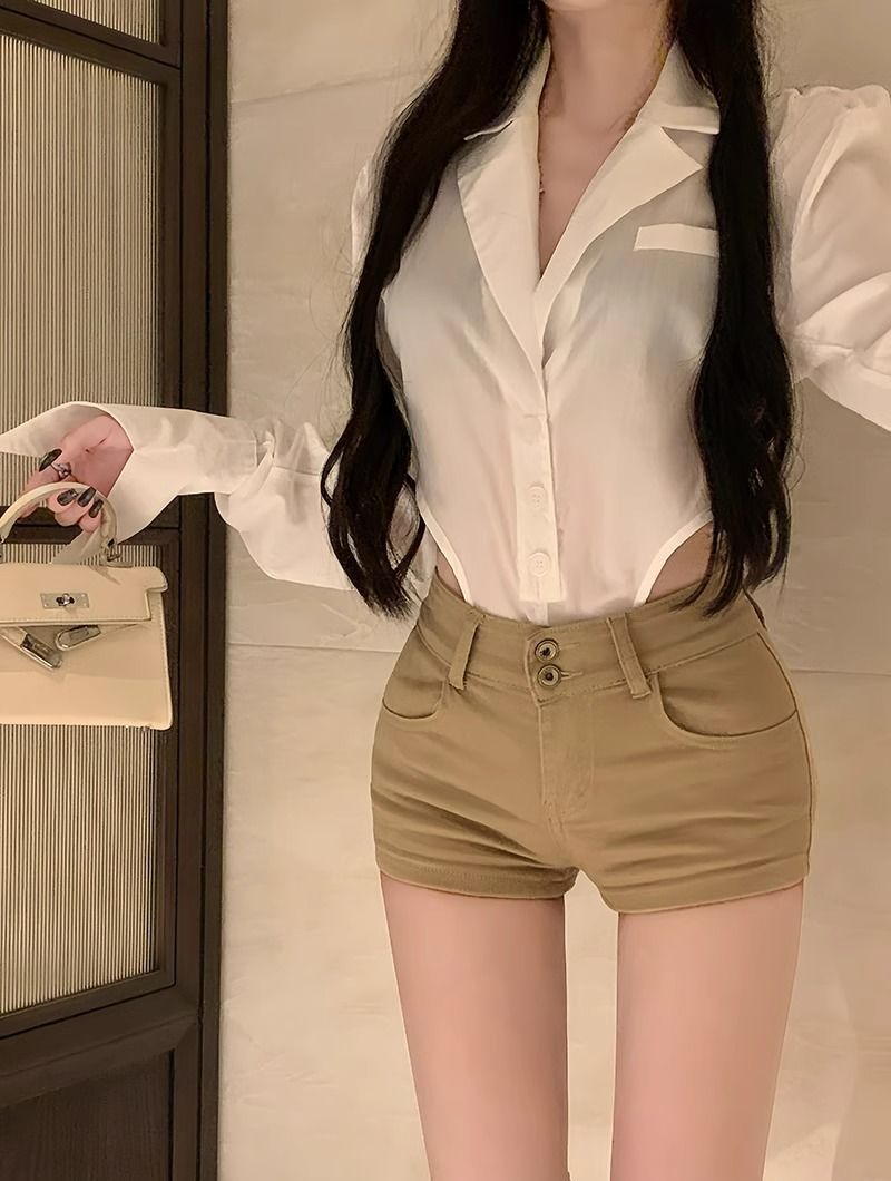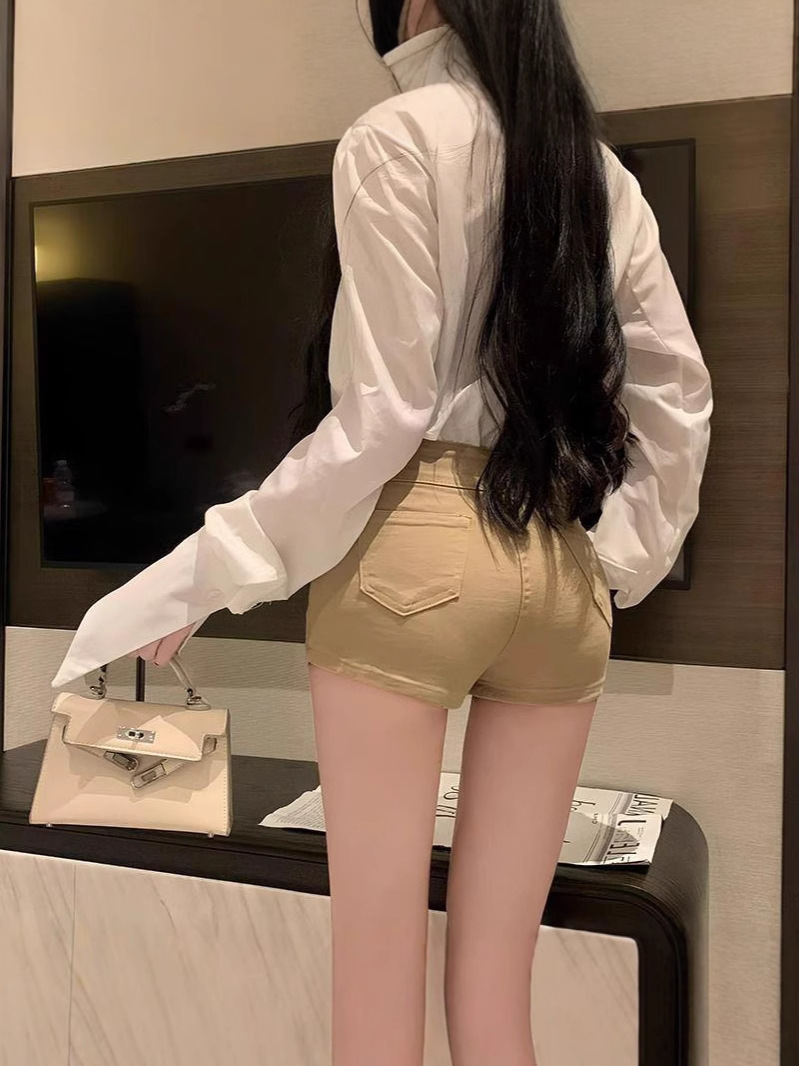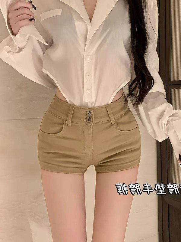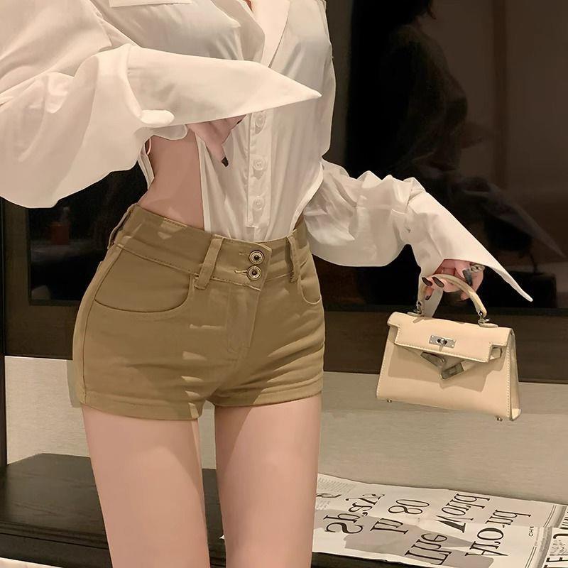 카키 높은 허리 풀 엉덩이 데님 반바지 여성용 봄 슬림 핏 여름 핫 바지 핫 바지 엉덩이 바지 xs