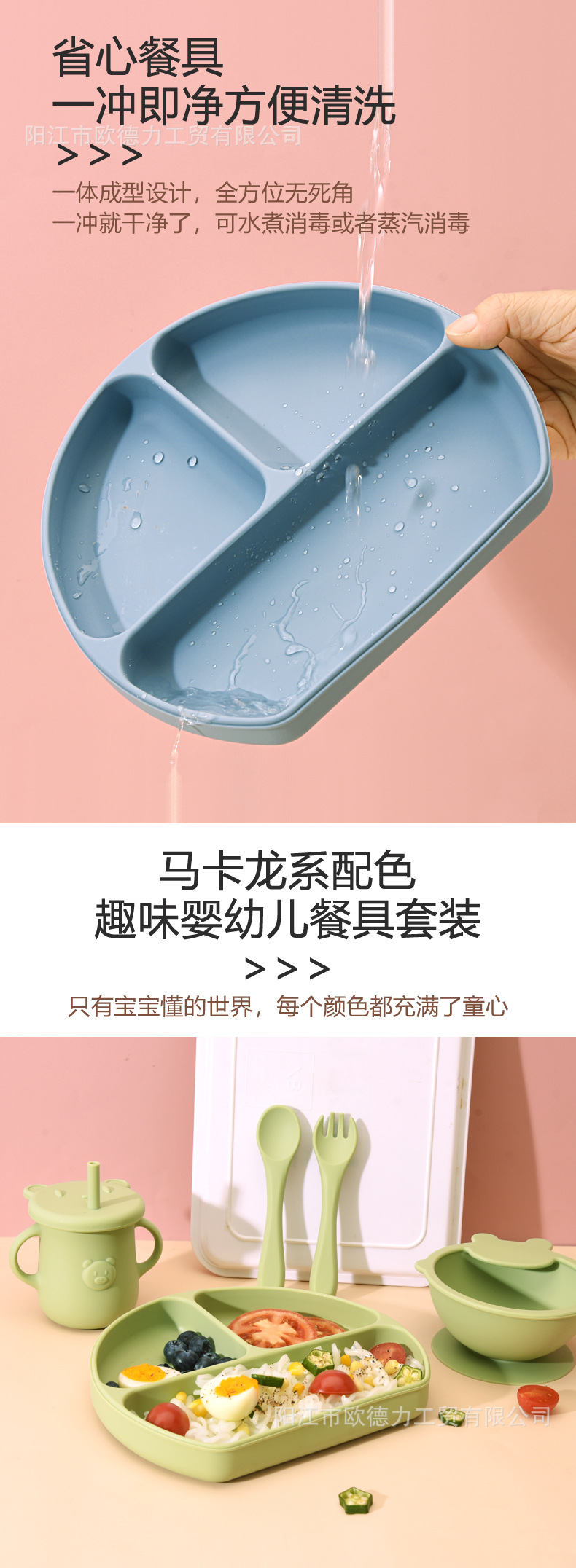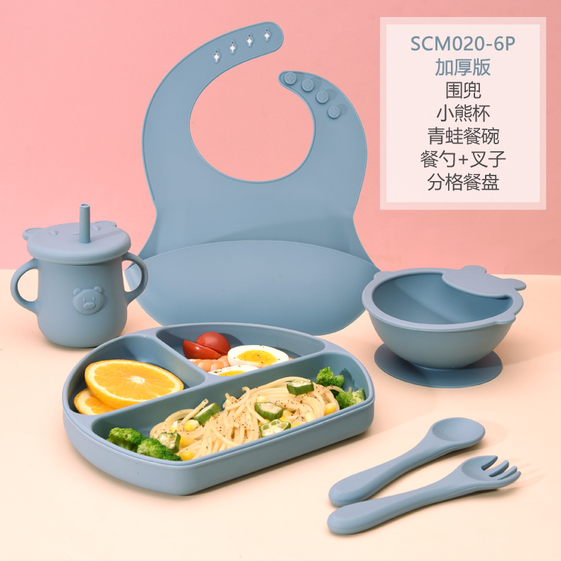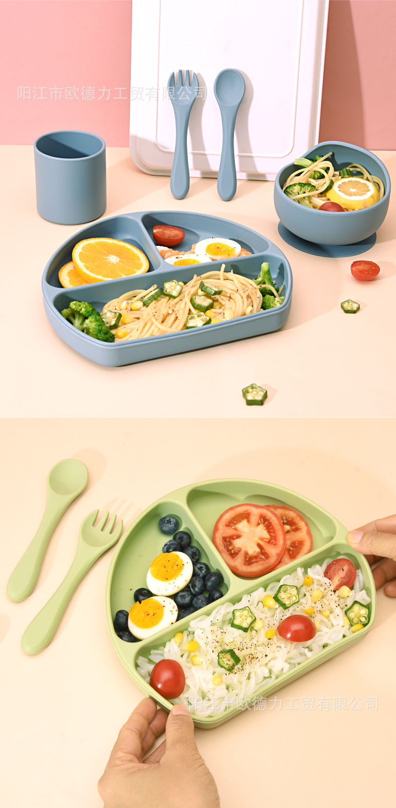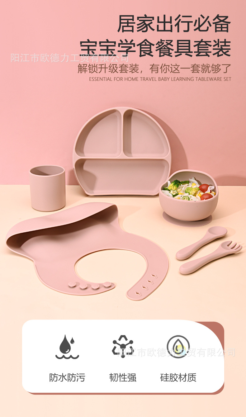 실리콘 아기 식기 7종 세트 식품 등급 어린이용 실리콘 분할 접시 턱받이 밥숟가락 낙하 방지 실리콘 그릇