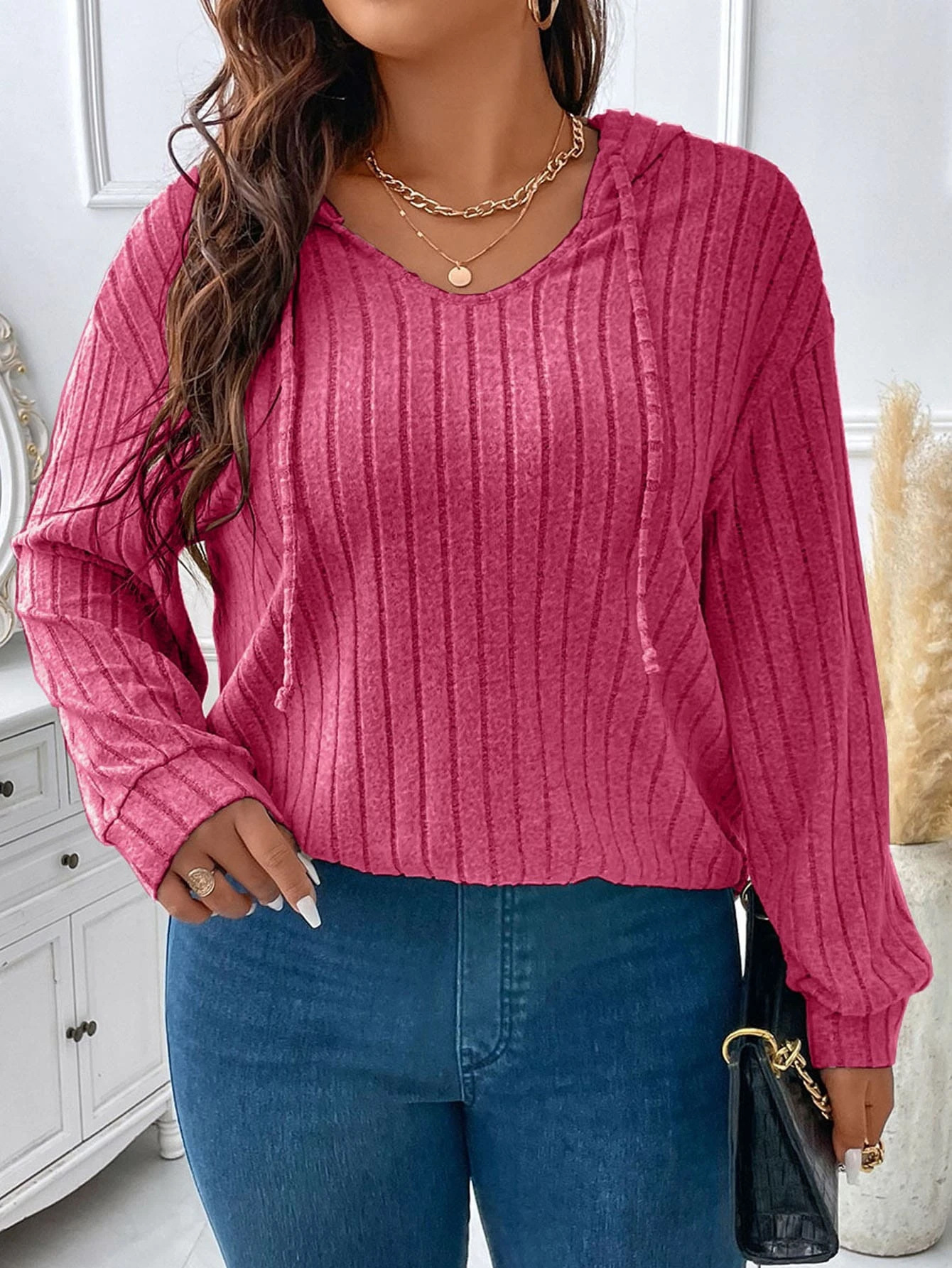 2024 아마존 가을/겨울 새로운 솔리드 컬러 플러스 사이즈 여성 탑 V-넥 후드 긴 소매 핏 샌딩 티셔츠 루즈