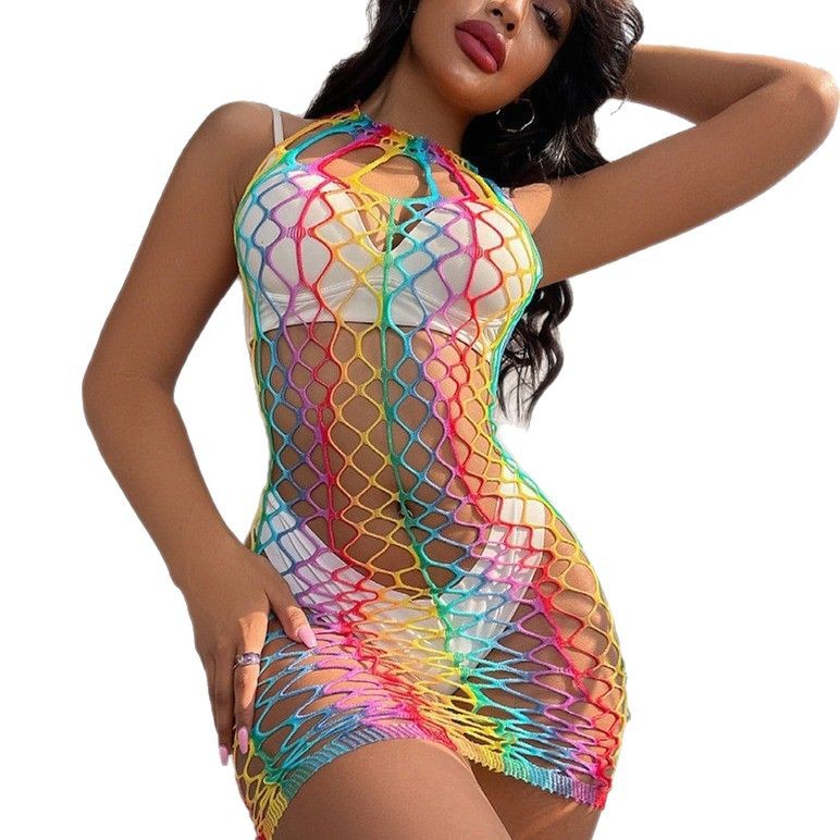 유럽과 미국의 섹시한 속옷 여성용 파자마 다채로운 메쉬 할로우 가방 힙합 원피스 섹시한 유니폼 유혹 비치 메쉬 원피스