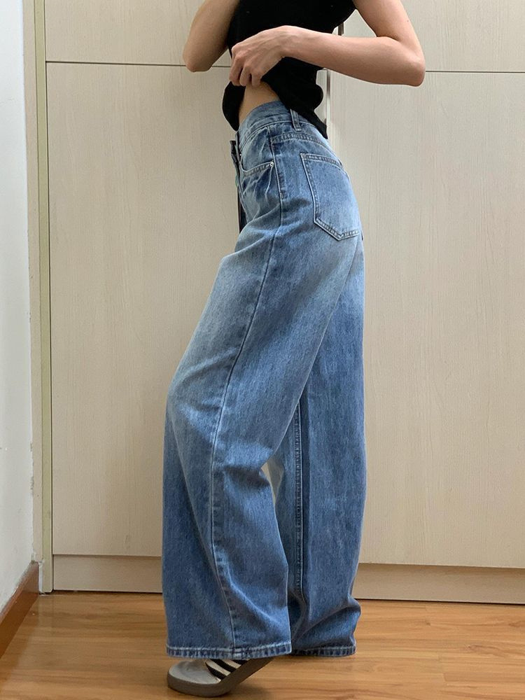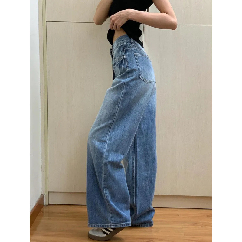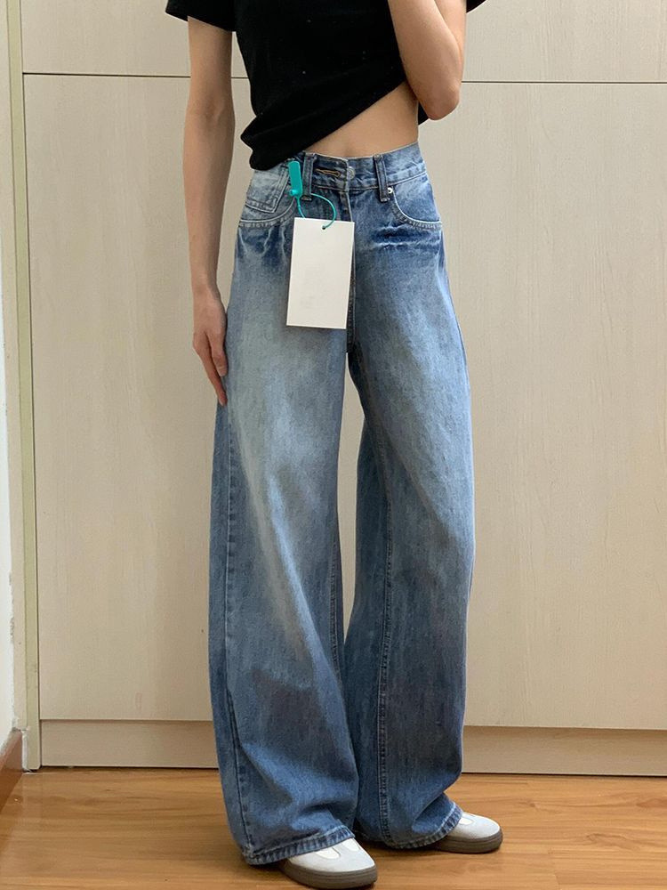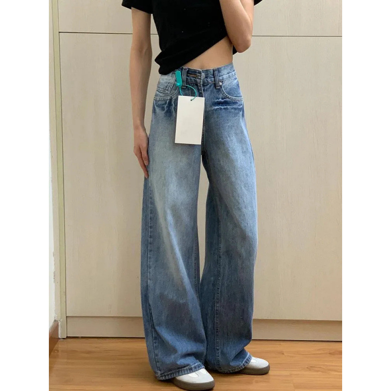 빈티지 블루 와이드 레그 청바지 여성용 2025 년 여름 새로운 미국 스타일 하이 웨이스트 루즈 슬림 룩 아메리칸 스타일 스트레이트 바지