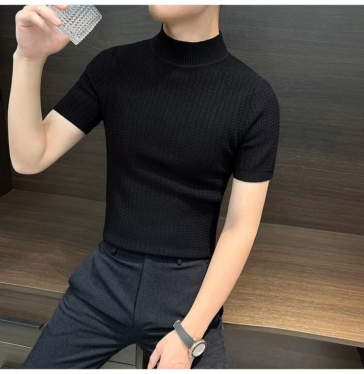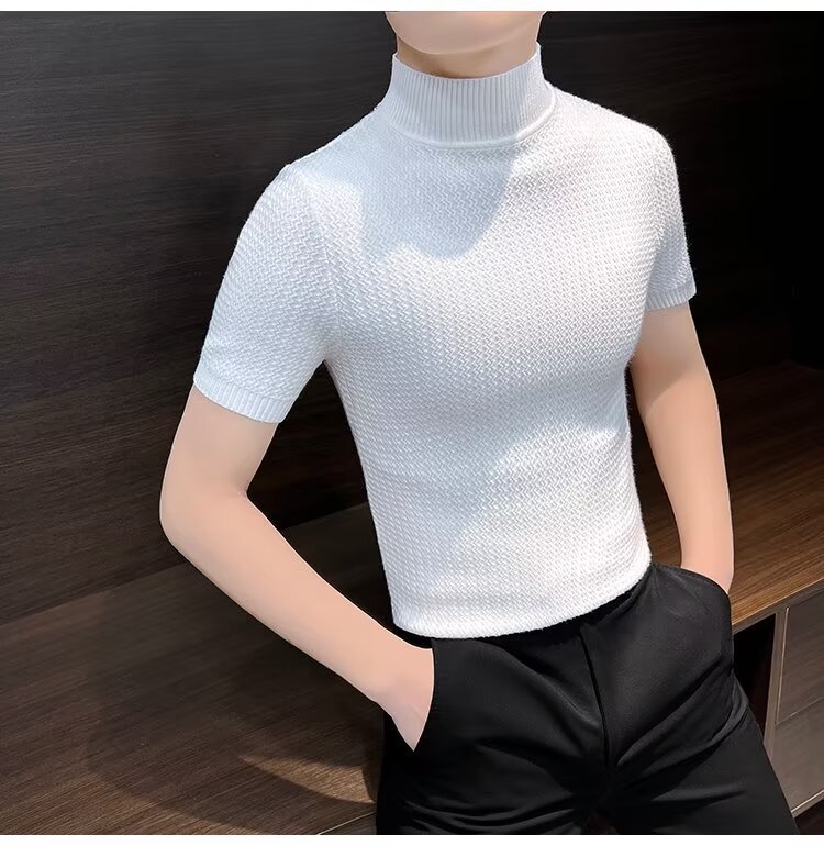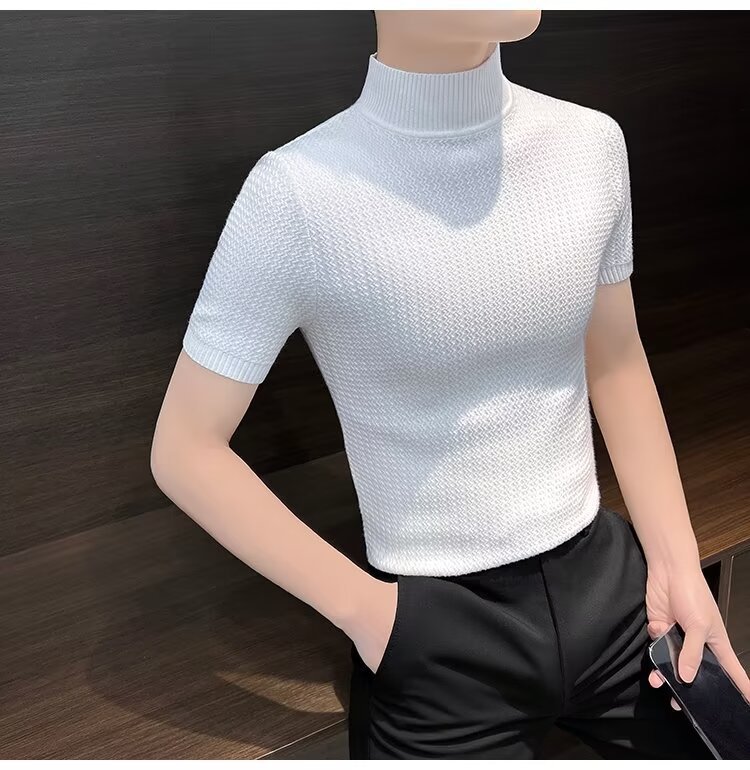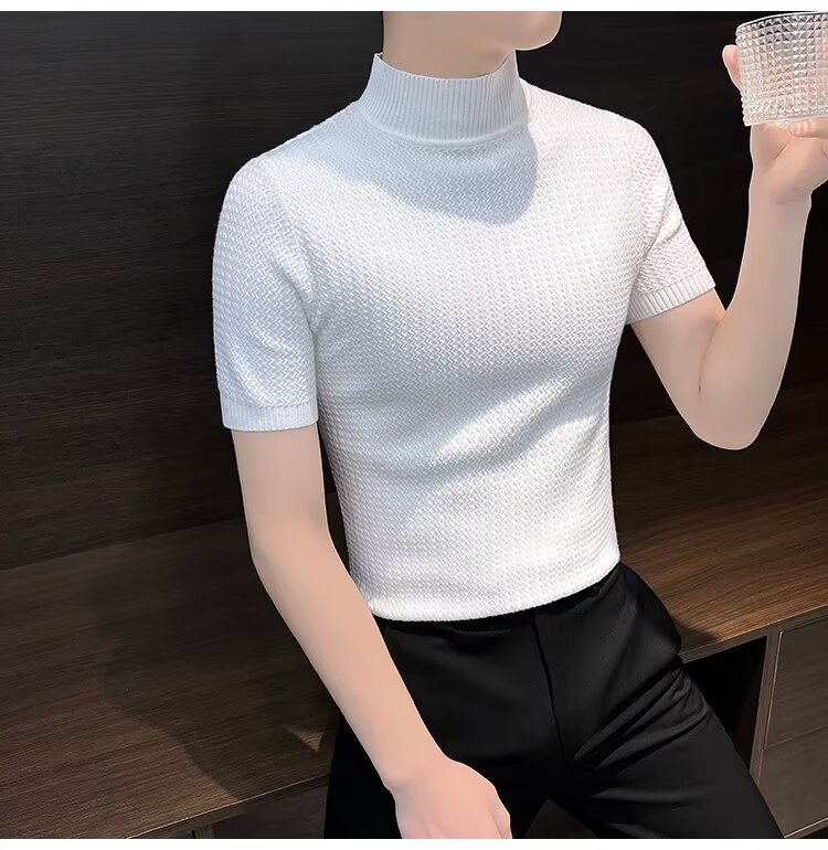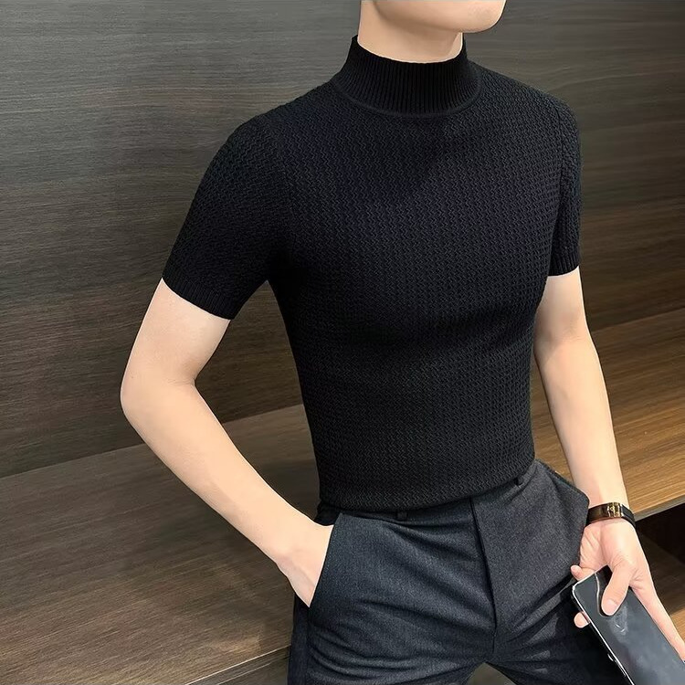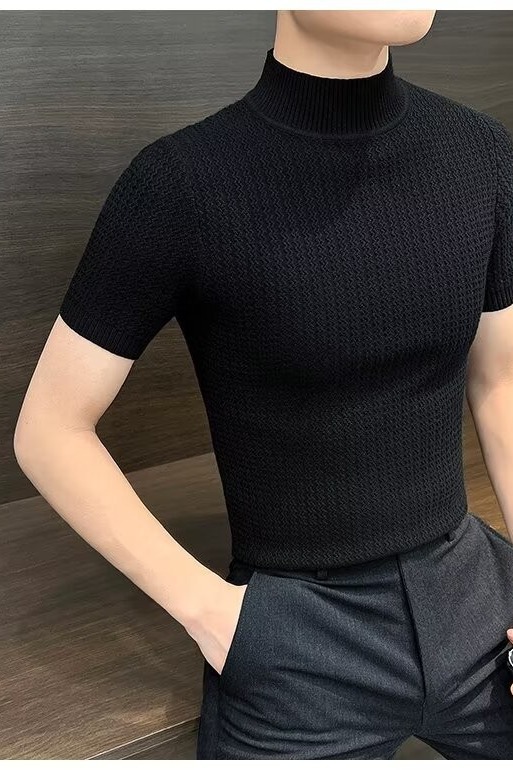 남성용 미드 하이 칼라 반팔 티셔츠 봄과 여름 2025 새로운 하이 엔드 센스 이너 슬림 핏 니트베이스 셔츠
