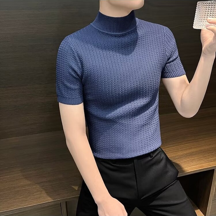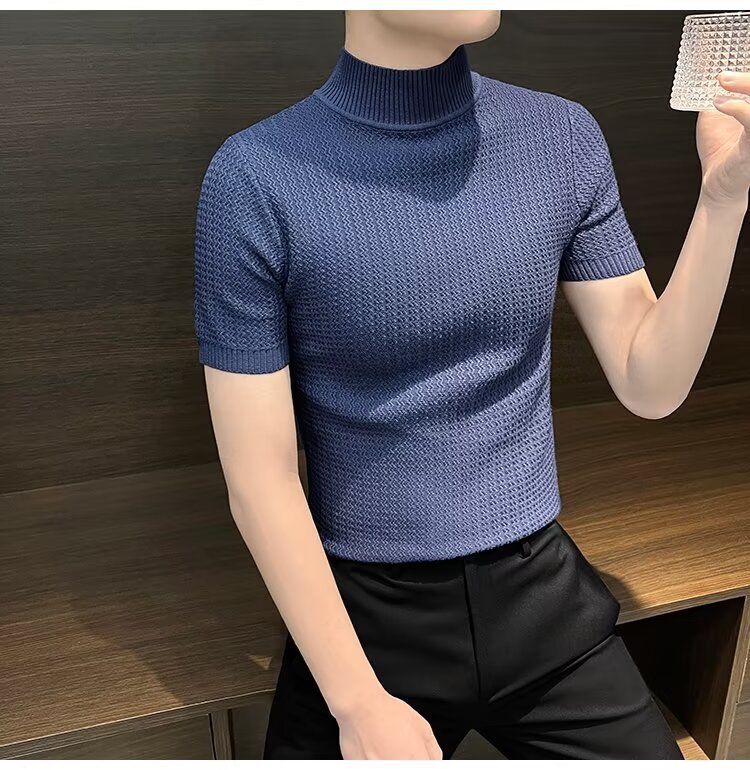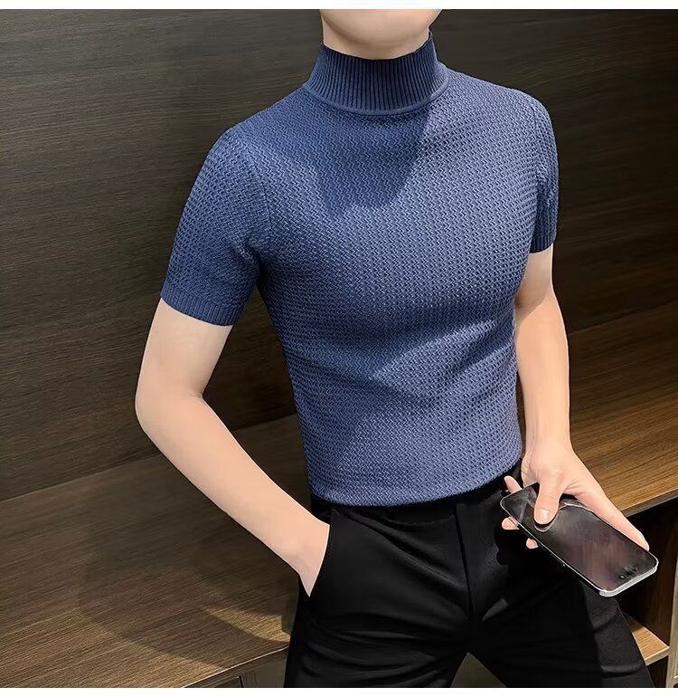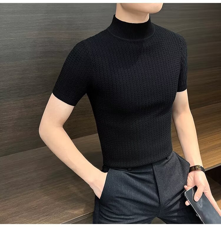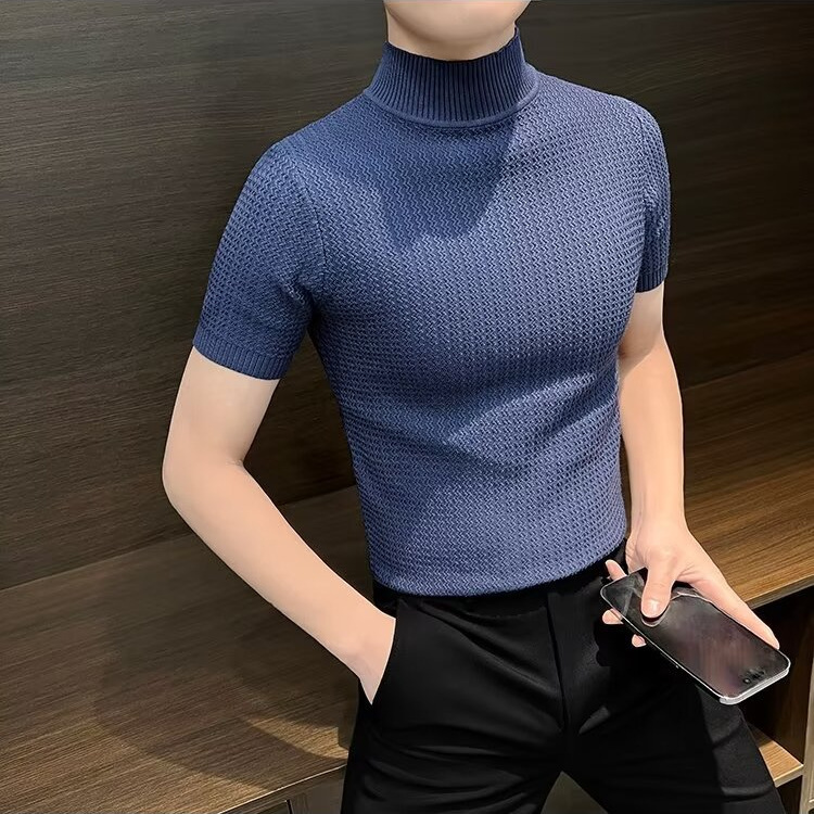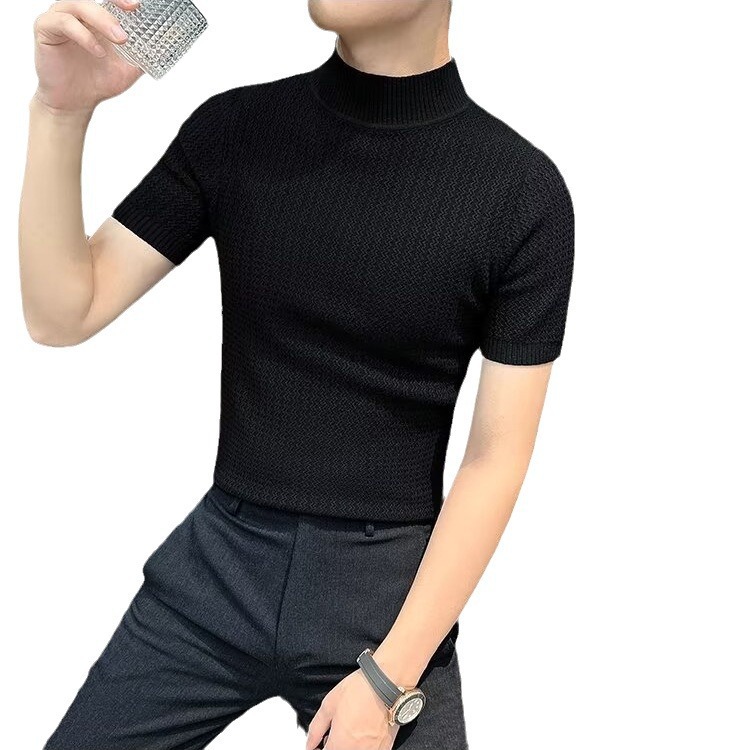 남성용 미드 하이 칼라 반팔 티셔츠 봄과 여름 2025 새로운 하이 엔드 센스 이너 슬림 핏 니트베이스 셔츠
