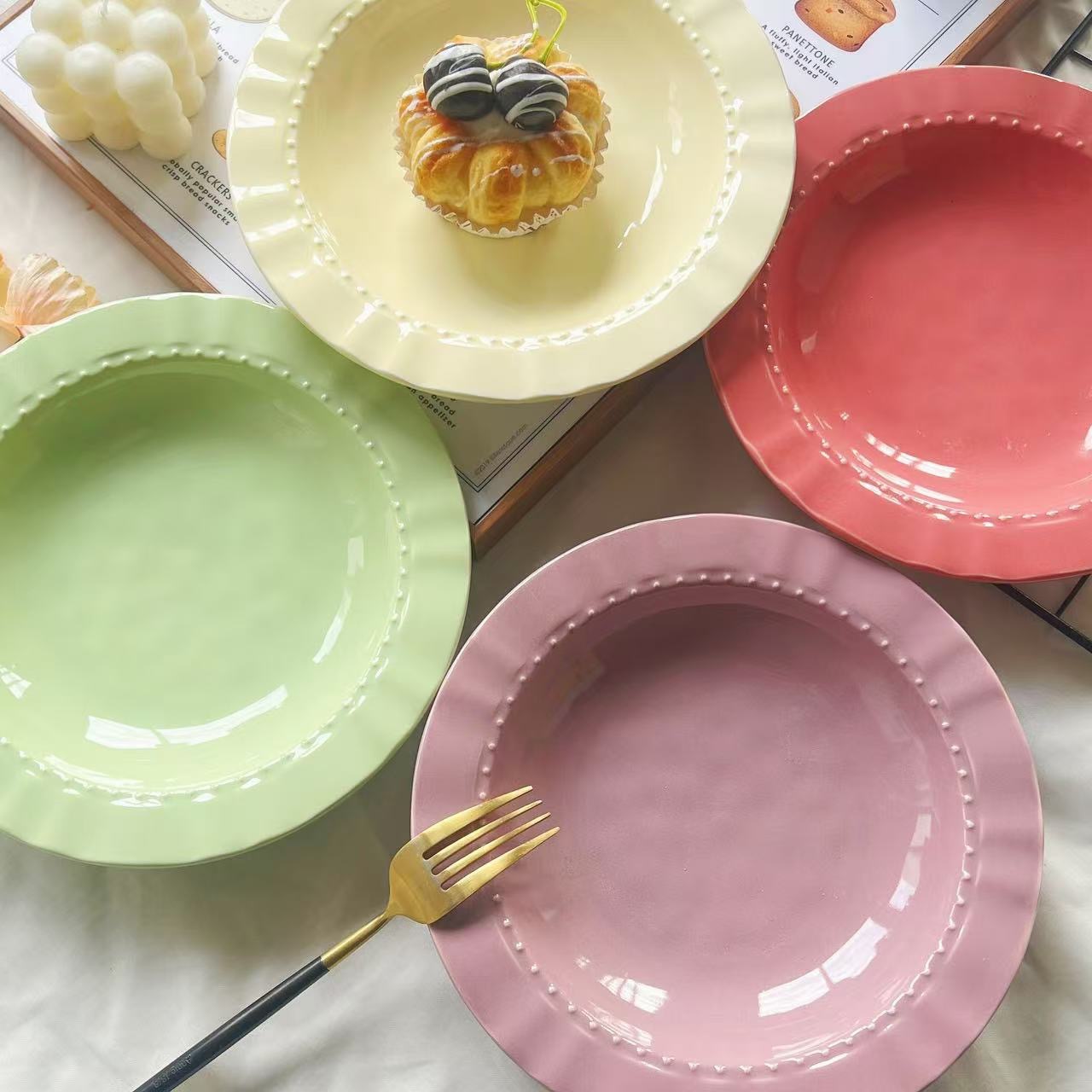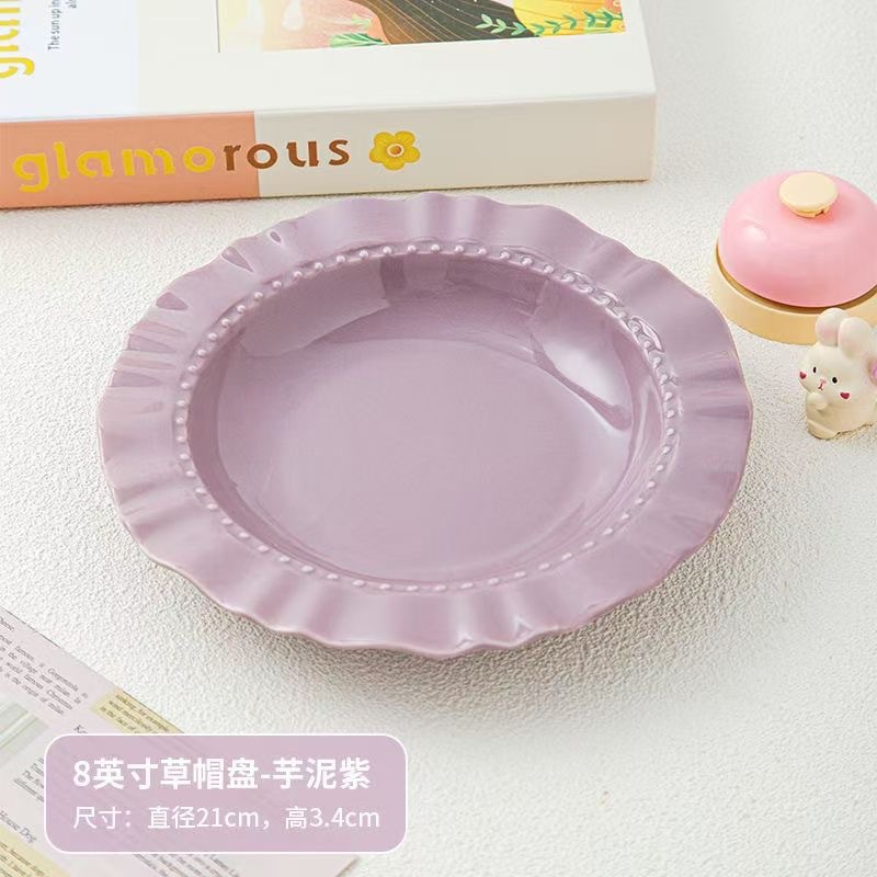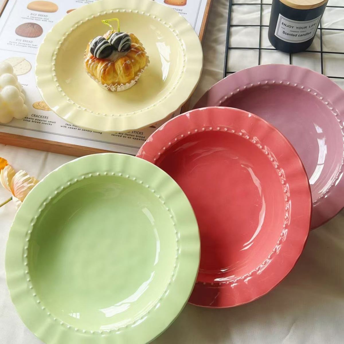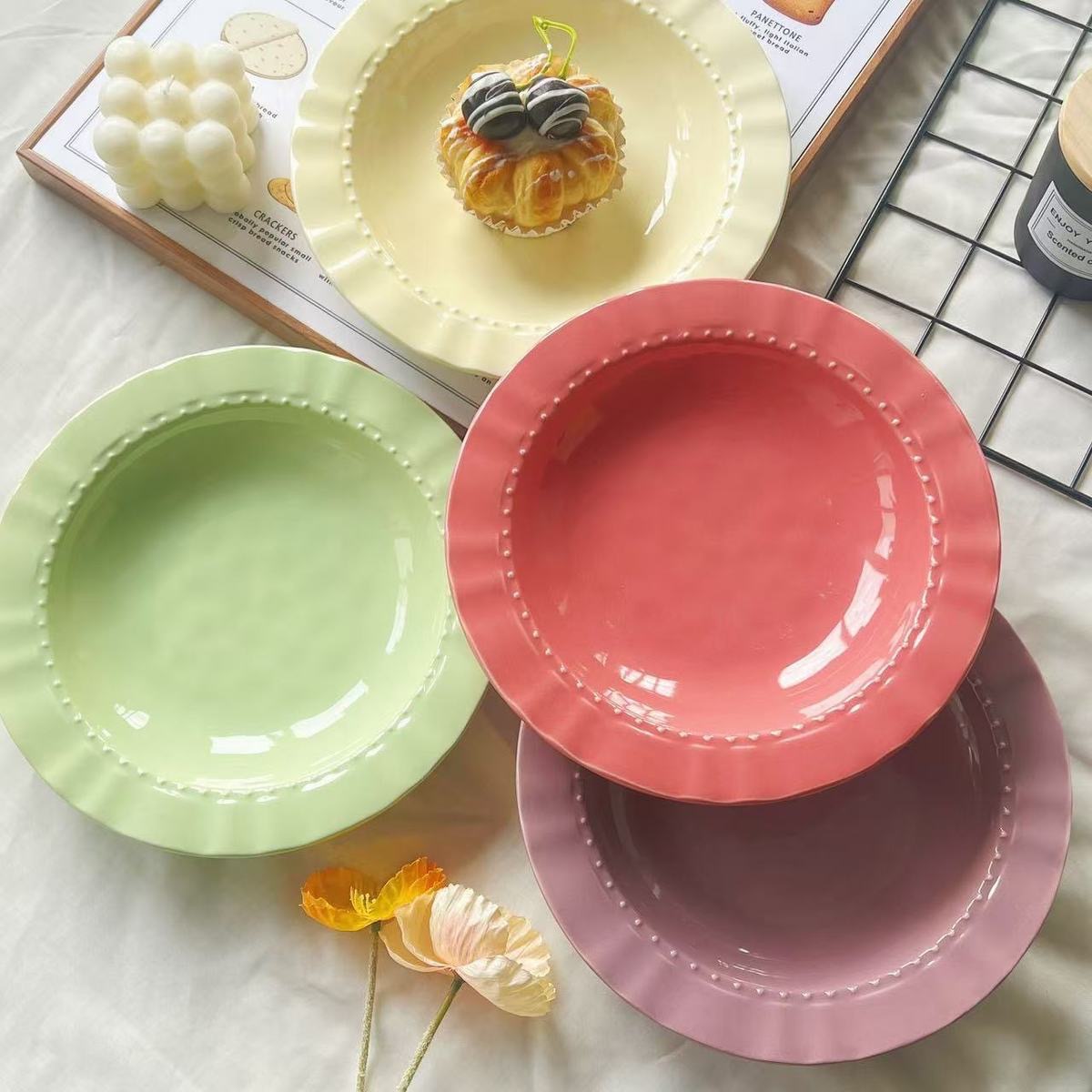 마카롱 크림 스타일 아침 식사 플레이트 높은 색상 프랑스 레트로 스커트 플레이트 세라믹 컬러 유약 식기