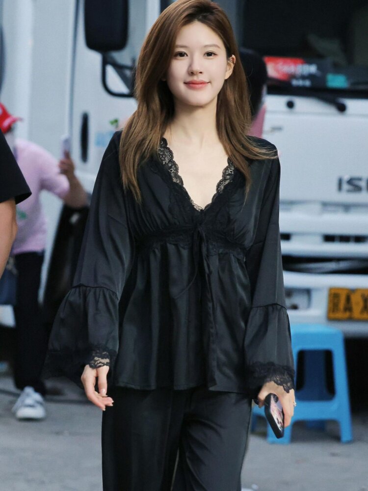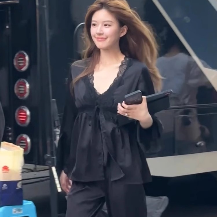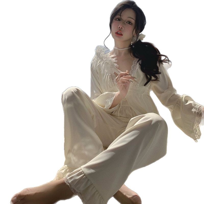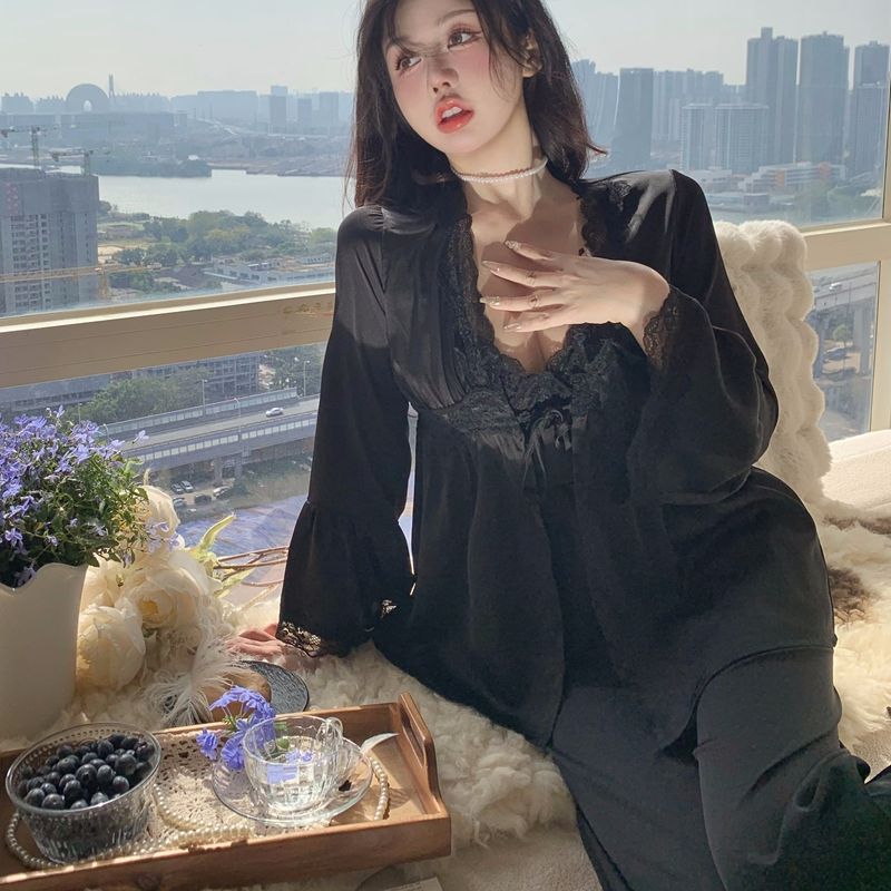 프랑스 스타일 순수한 욕망 스타일 아이스 실크 새틴 파자마 여성 여름 봄 가을 슬링 홈 의류 3 종 세트 가슴 패드 홈 의류