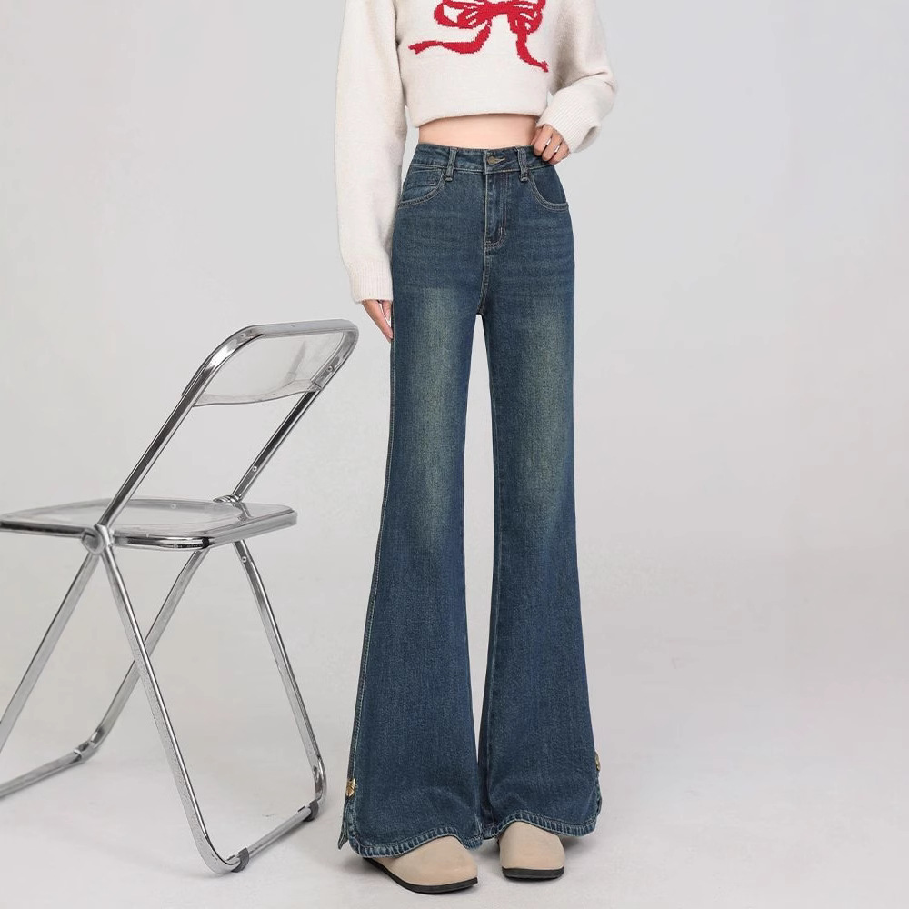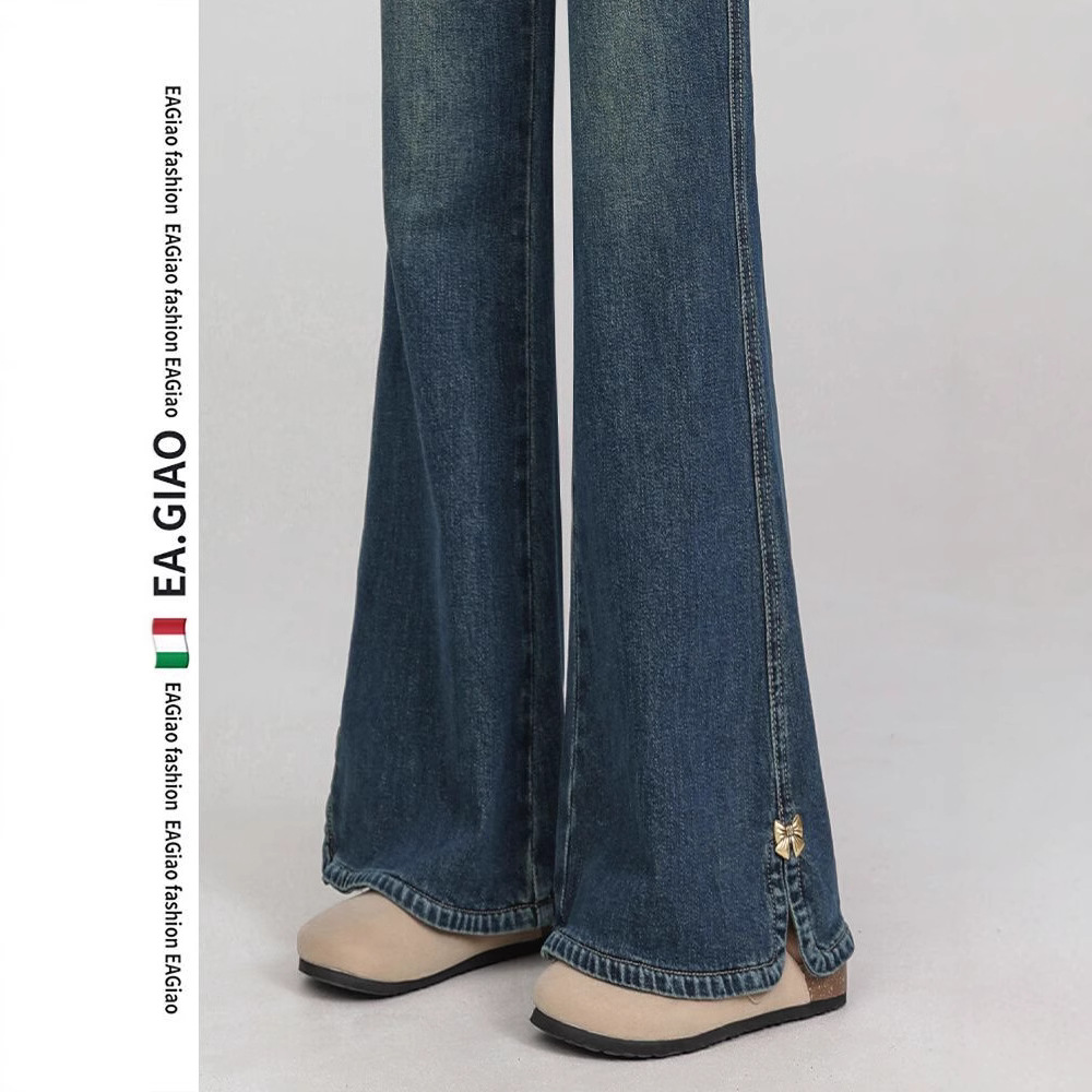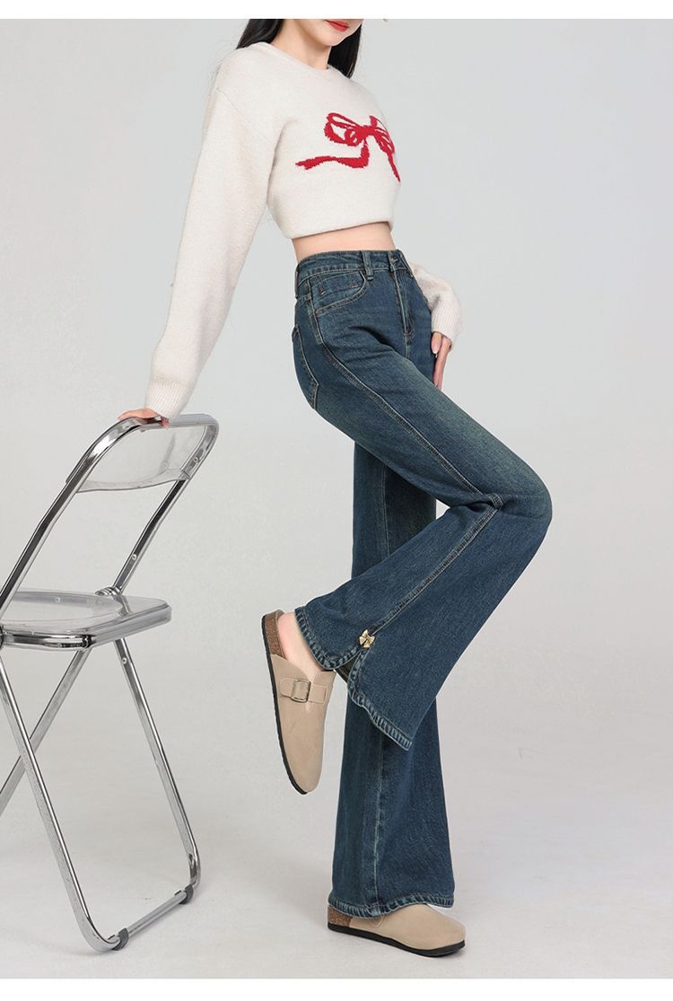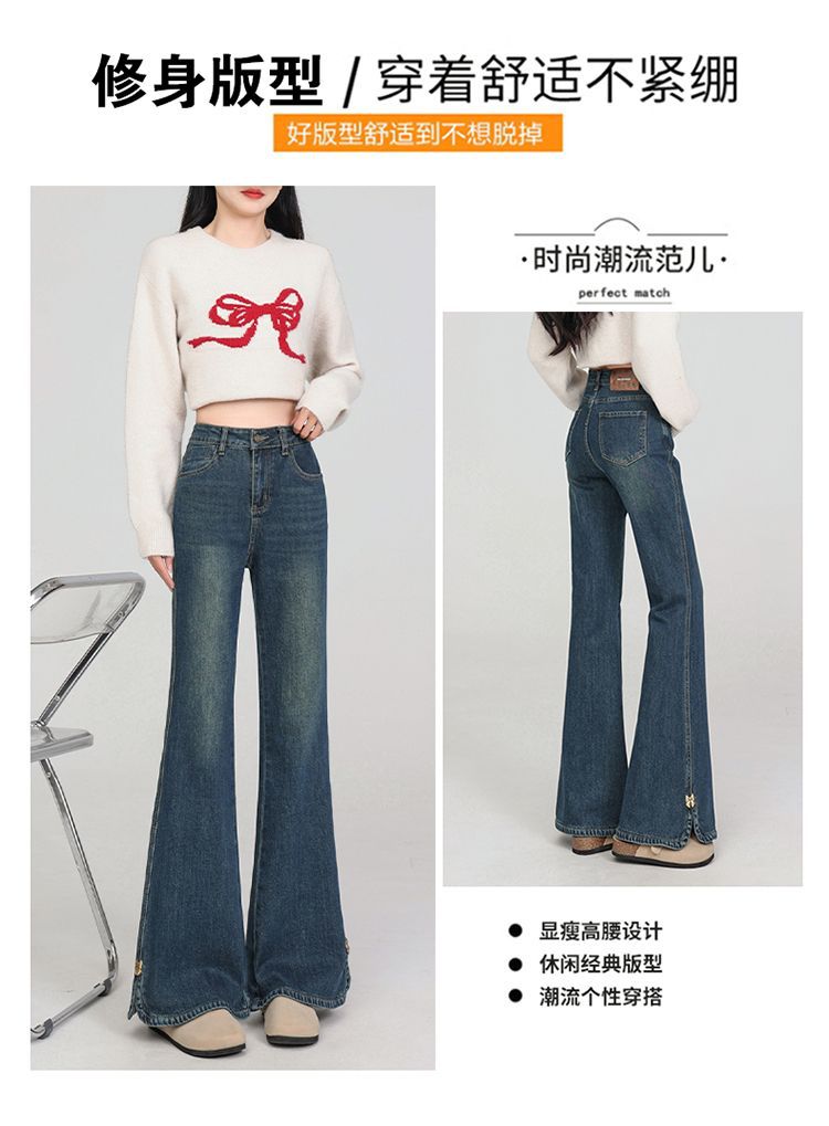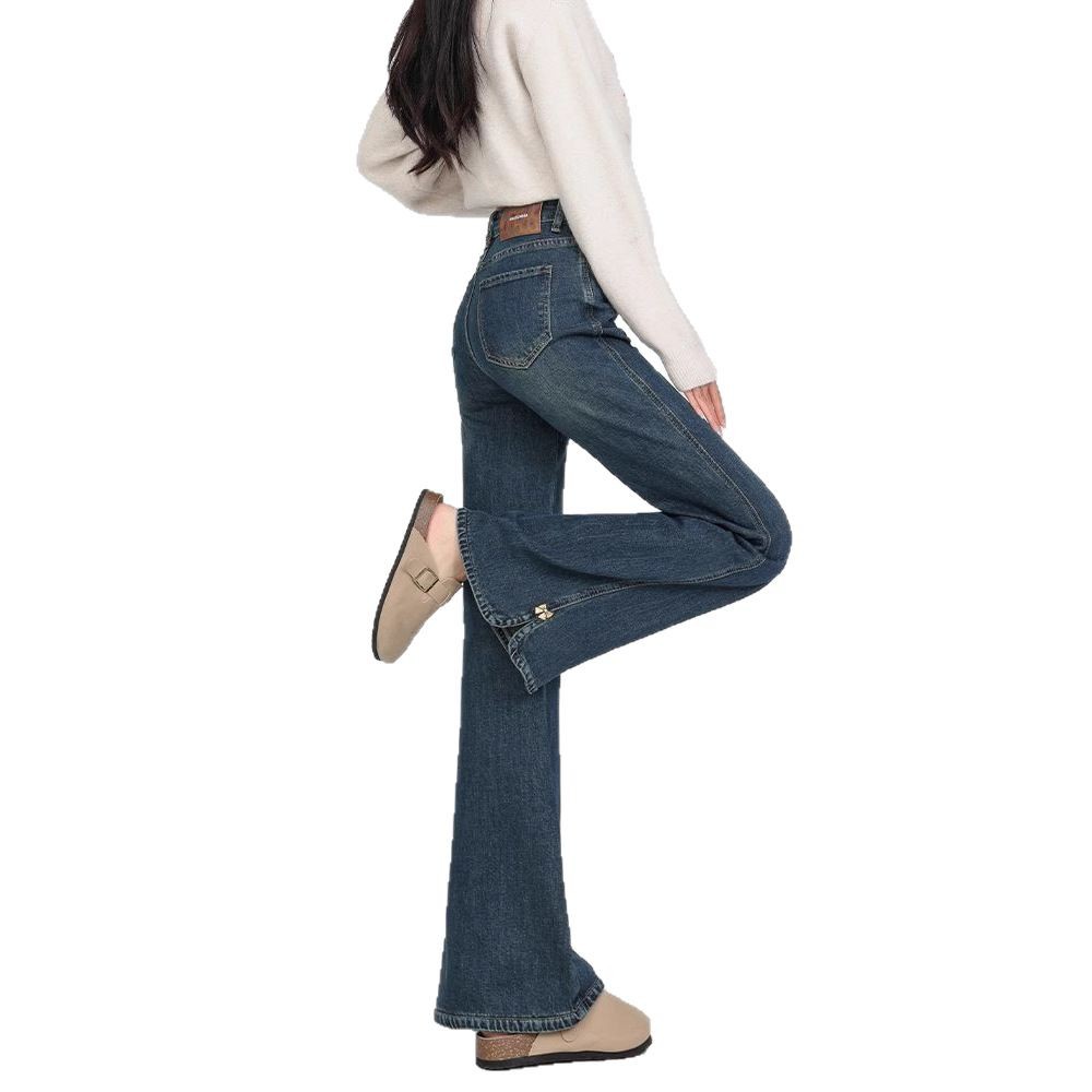 봄 뉴 블루 스플릿 하이 웨이스트 청바지 여성 한국식 슬림 룩 올매치 마이크로 혼 말굽 바지