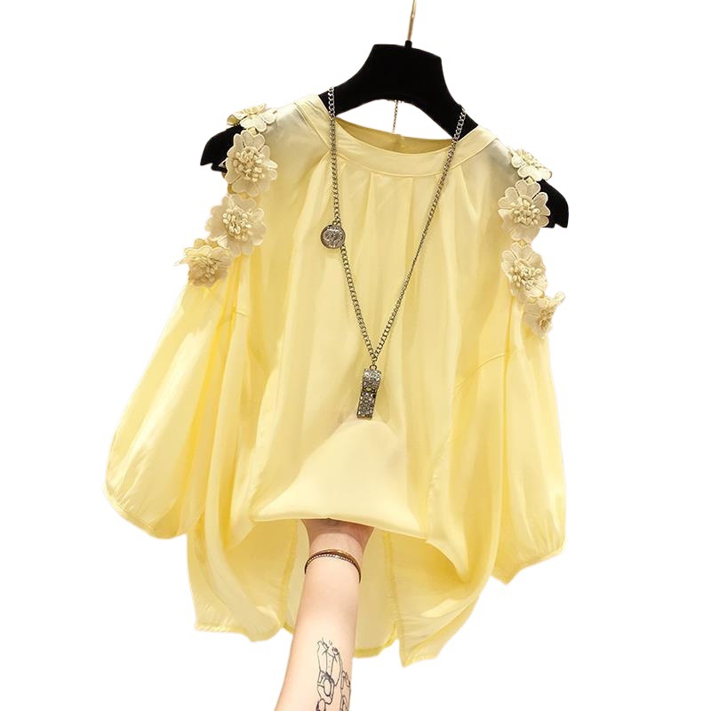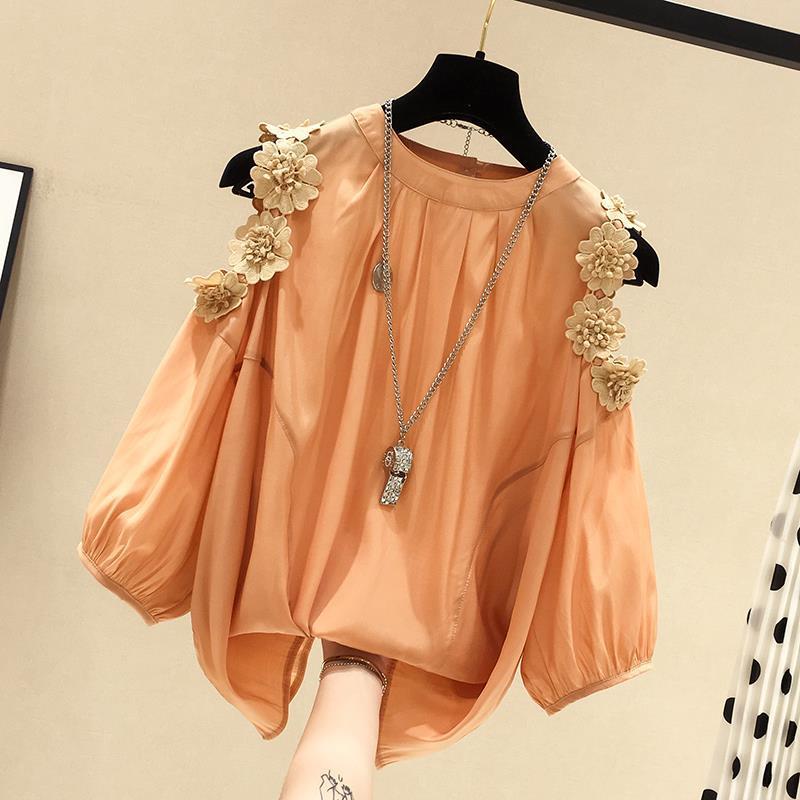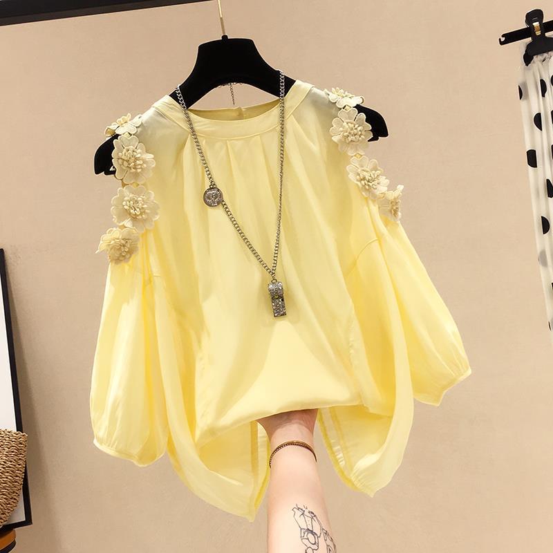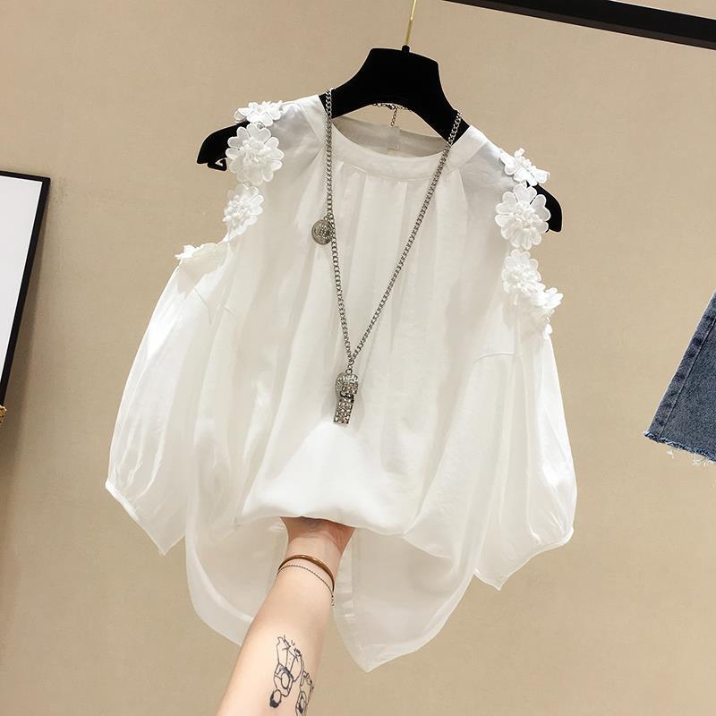 플라워 오프숄더 쉬폰 셔츠 여성 반팔 2026 봄 여름 신상 한국 스타일 패셔너블 루즈핏 배 가리개 페어리 탑