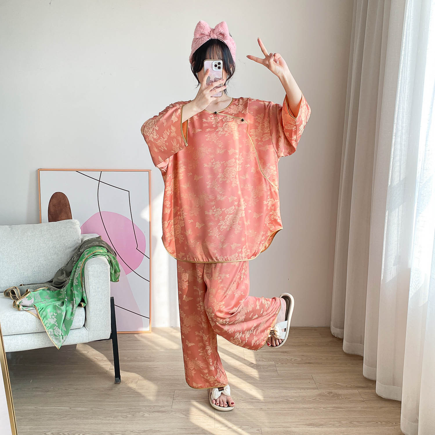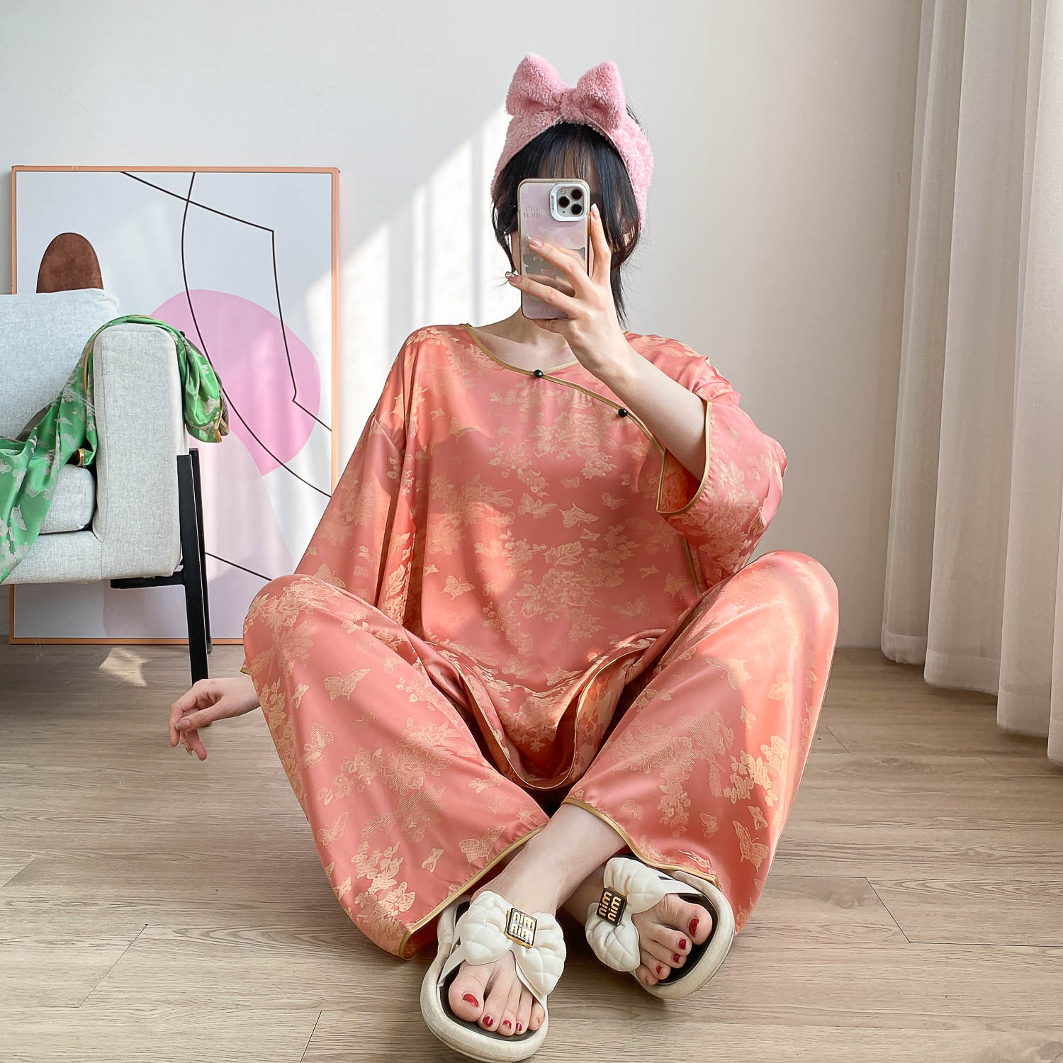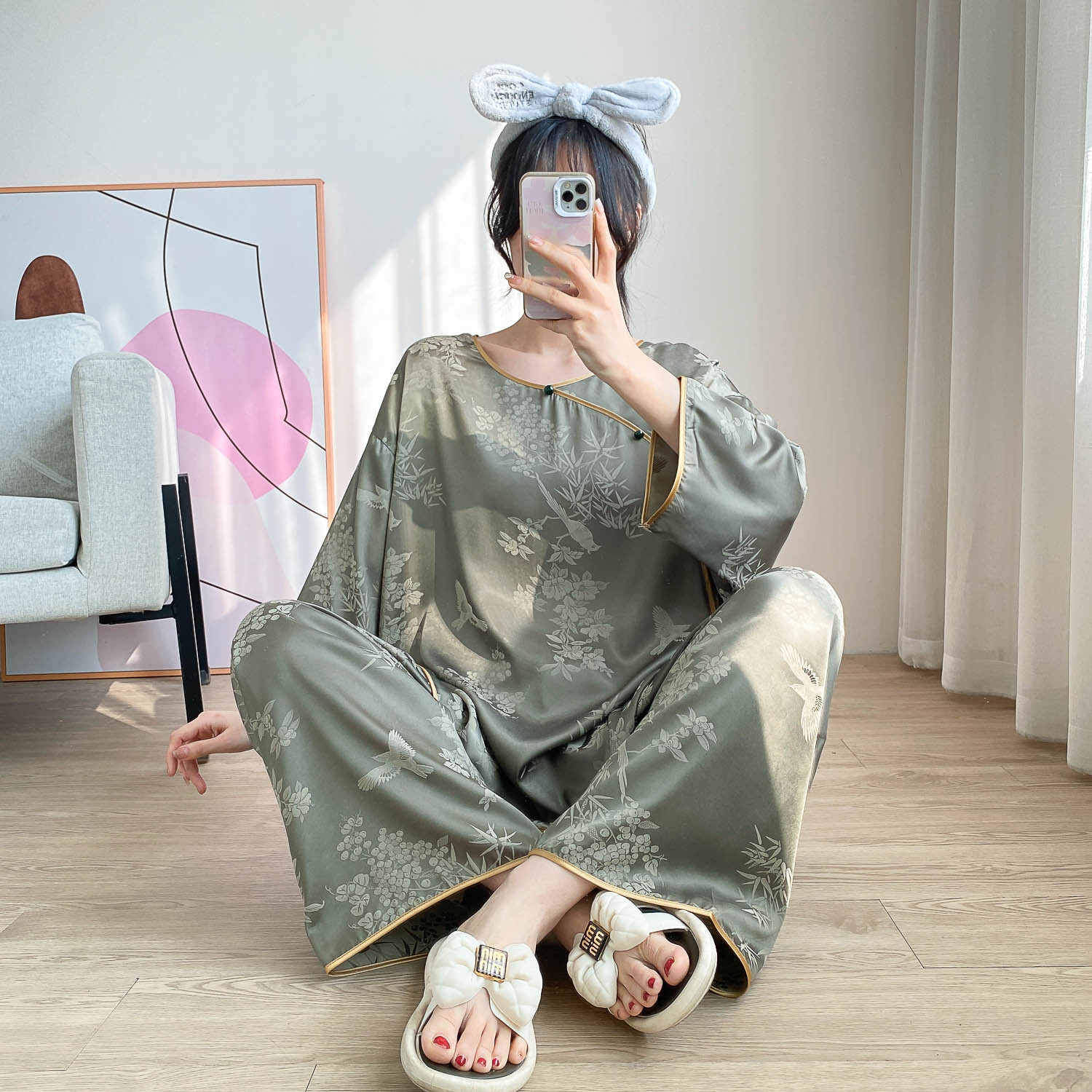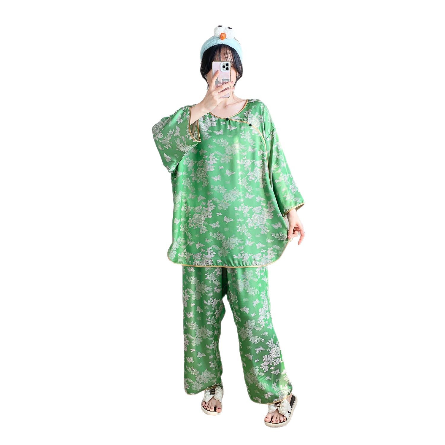 중국 스타일 중국 스타일 통통녀 플러스 사이즈 아이스 실크 파자마 여성 여름 얇은 실크 느슨한 홈 옷 세트 200 진