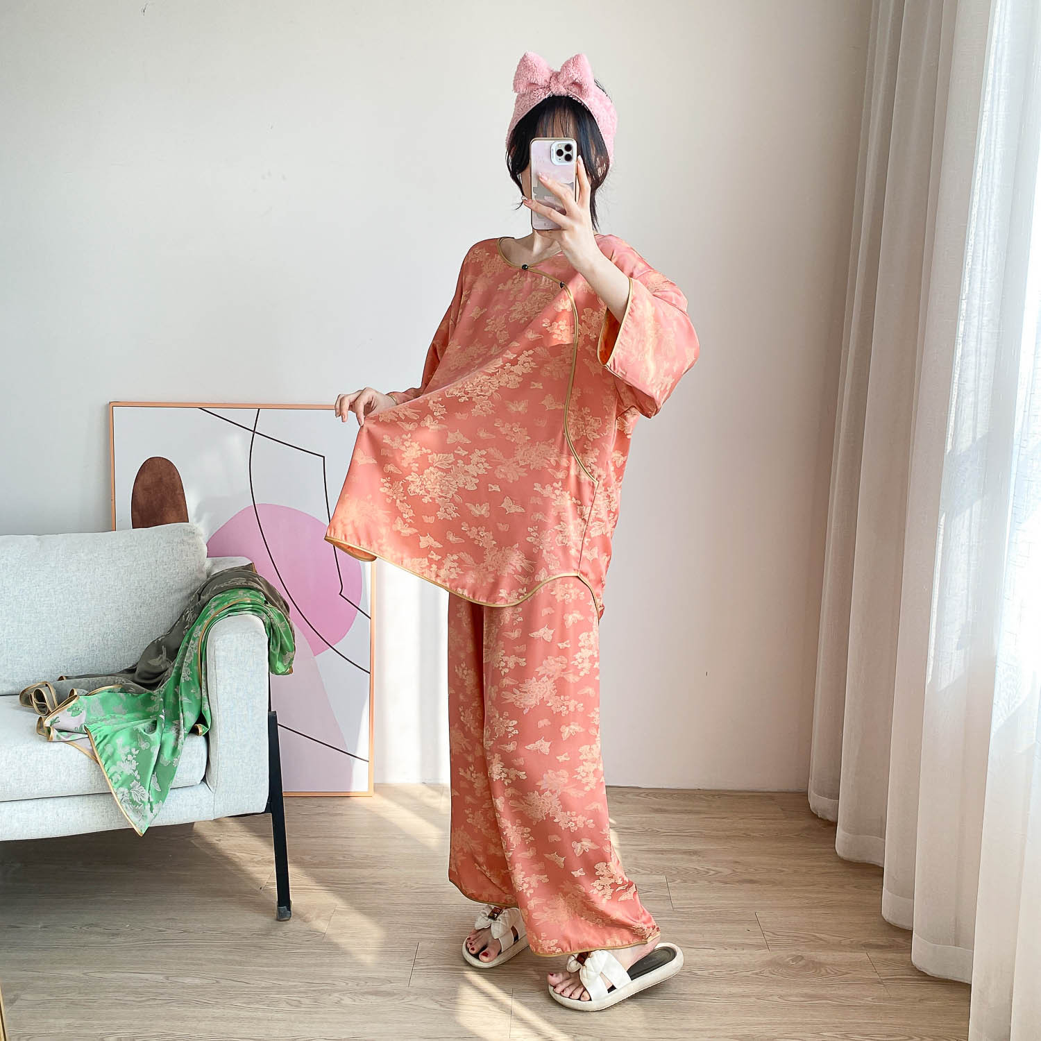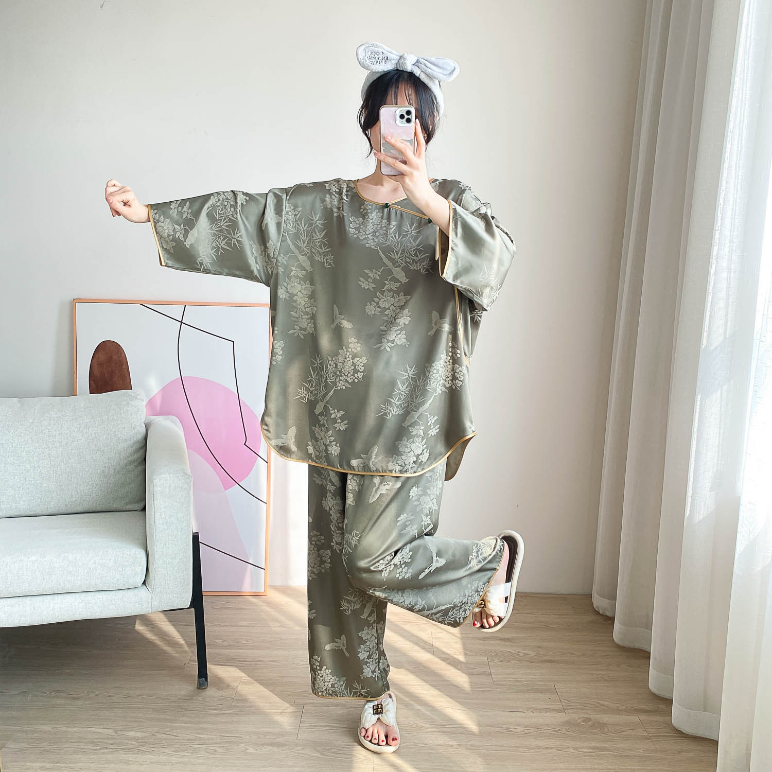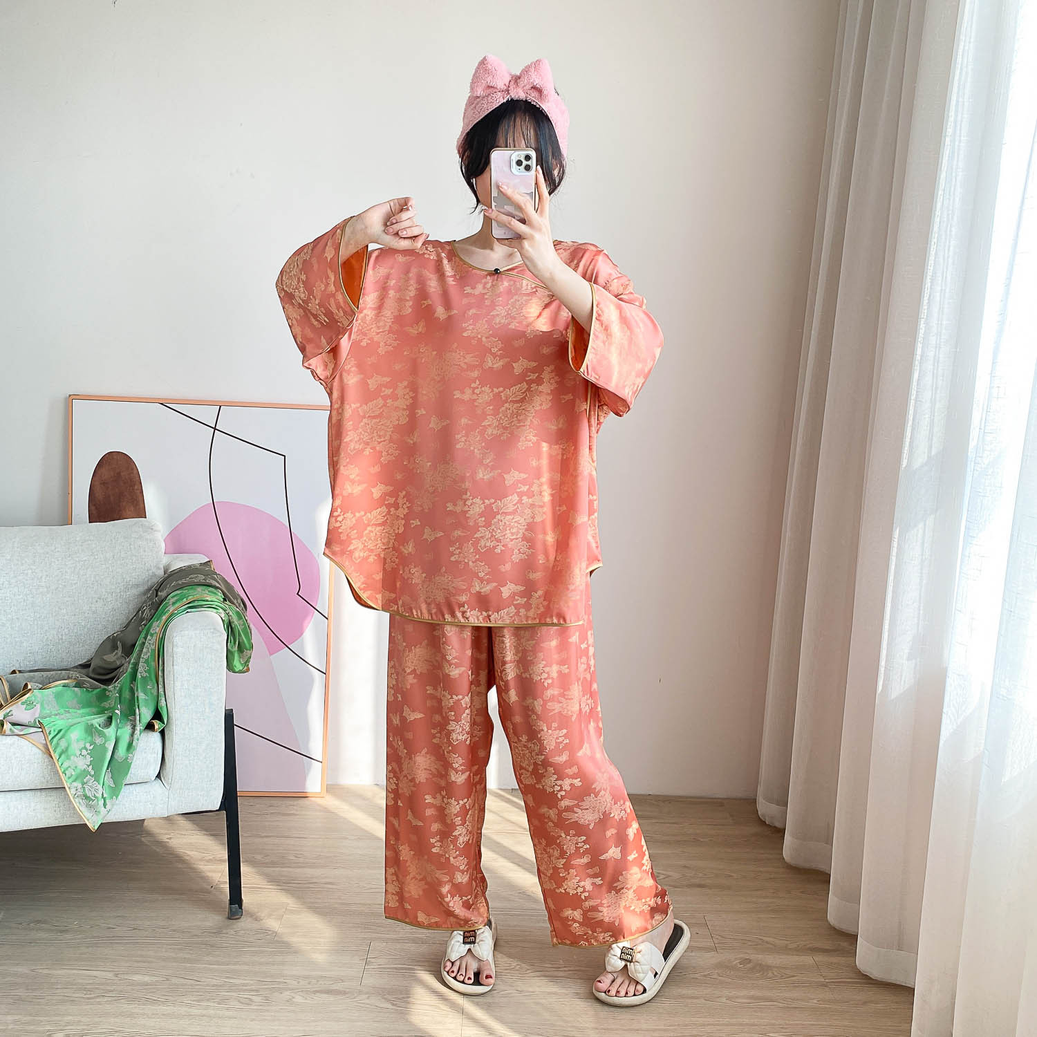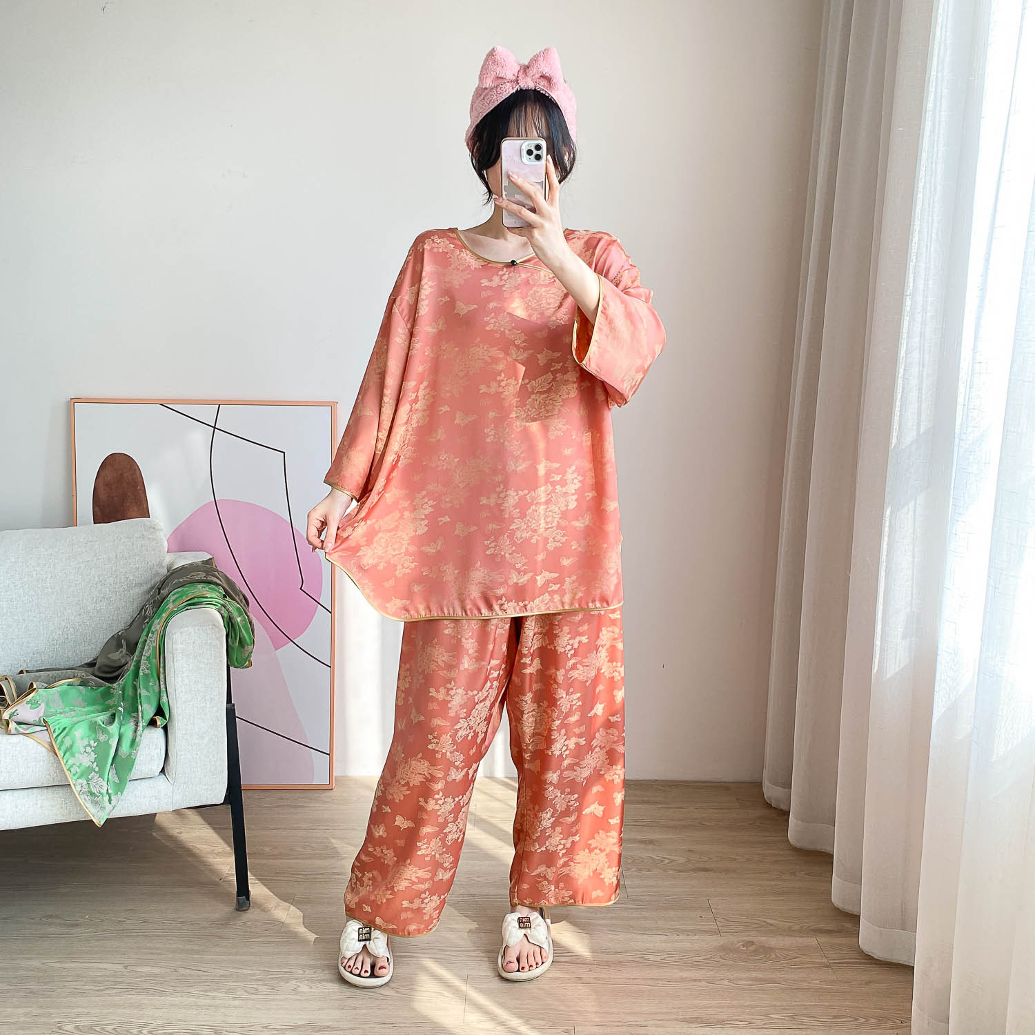 중국 스타일 중국 스타일 통통녀 플러스 사이즈 아이스 실크 파자마 여성 여름 얇은 실크 느슨한 홈 옷 세트 200 진