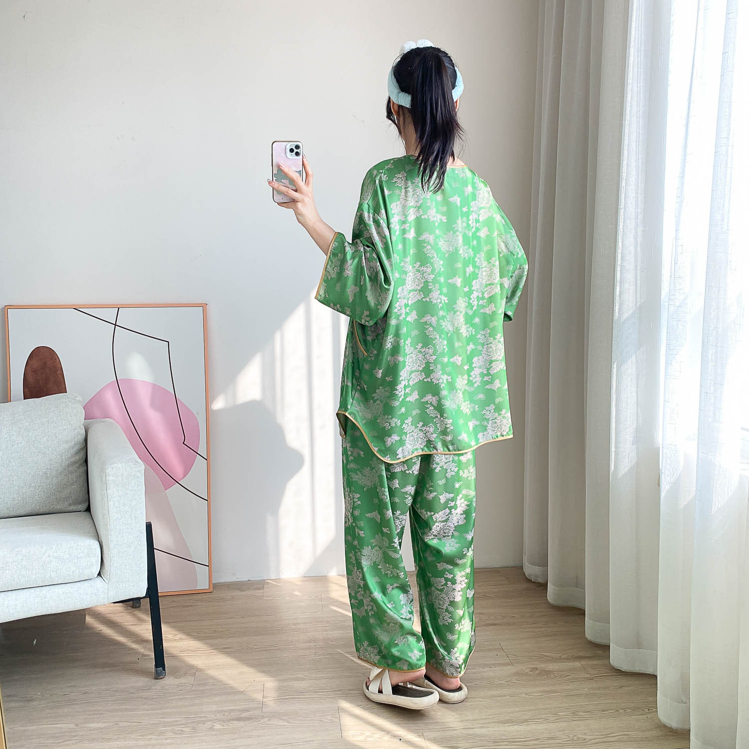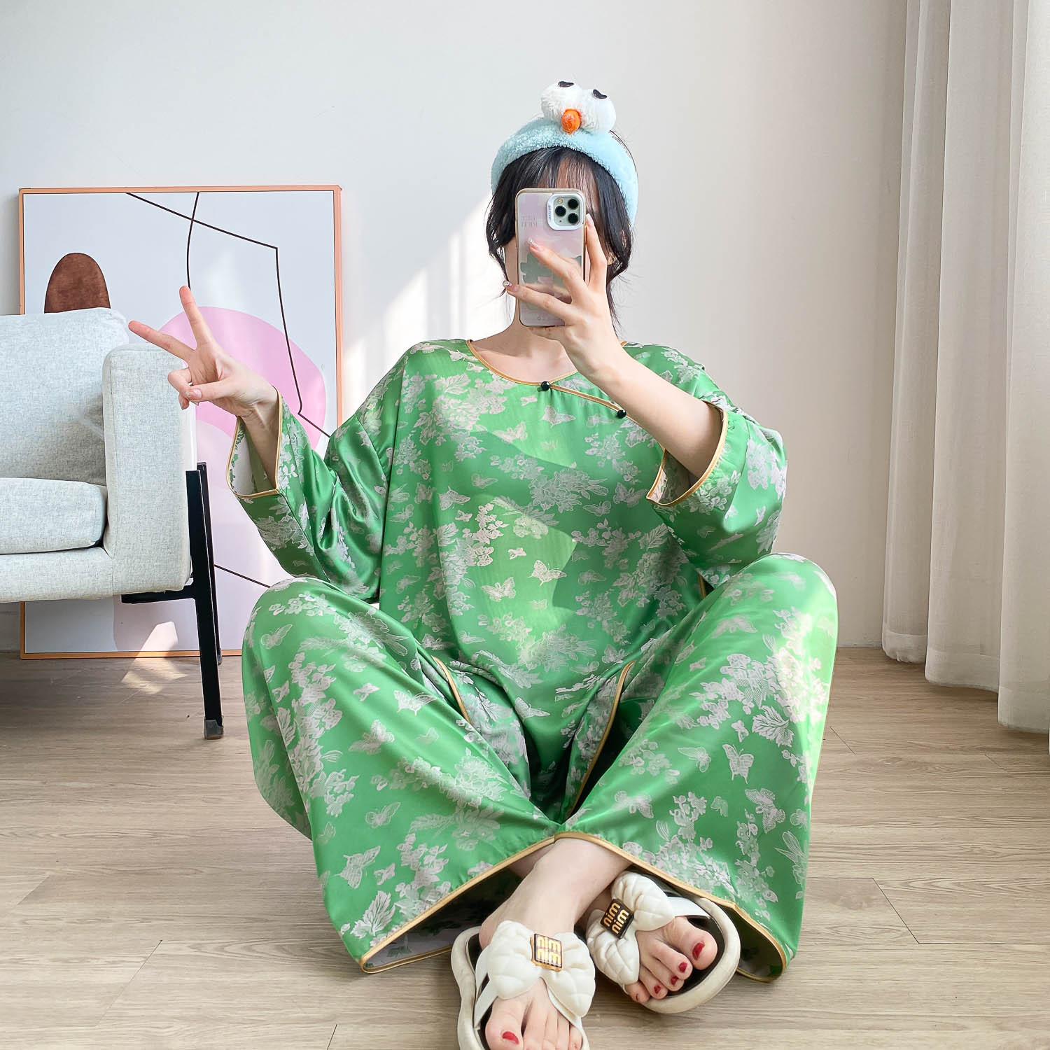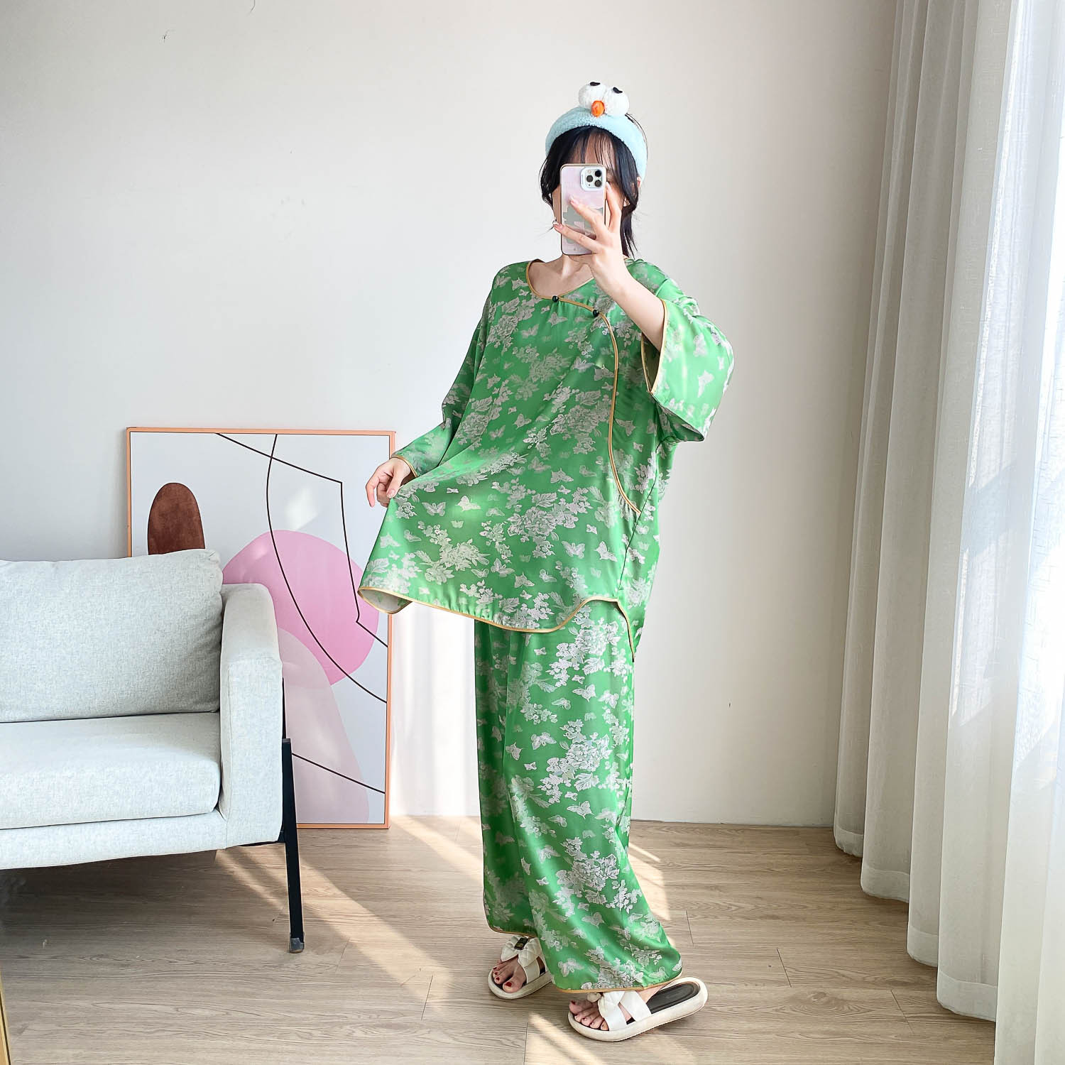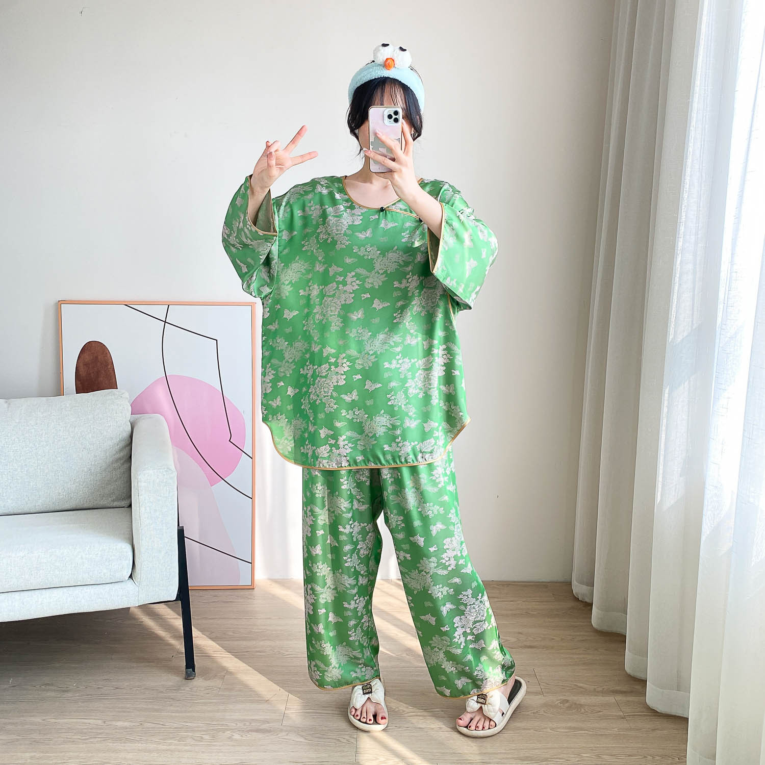 중국 스타일 중국 스타일 통통녀 플러스 사이즈 아이스 실크 파자마 여성 여름 얇은 실크 느슨한 홈 옷 세트 200 진
