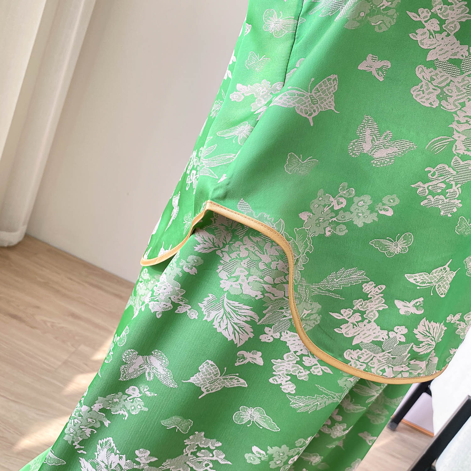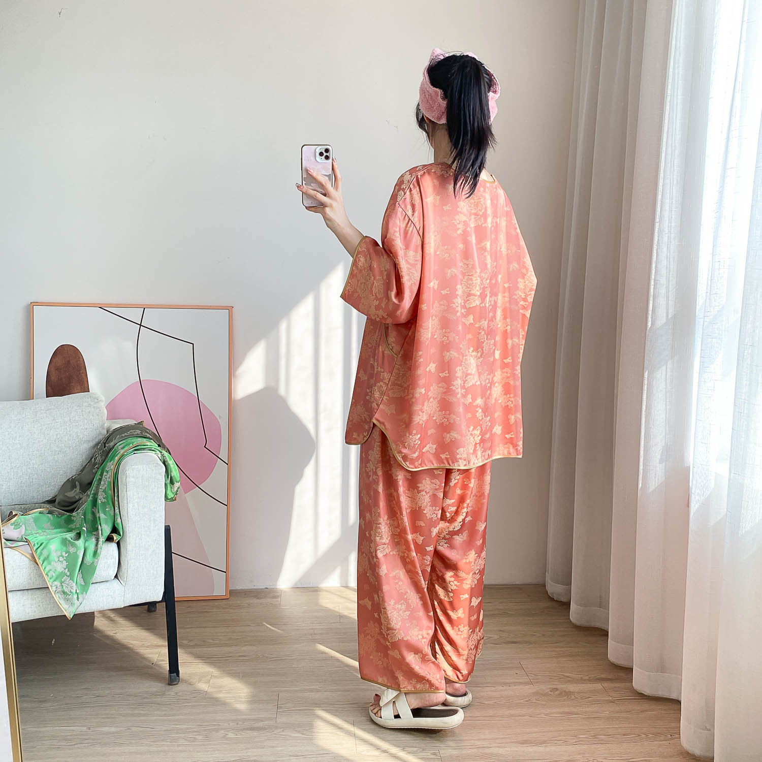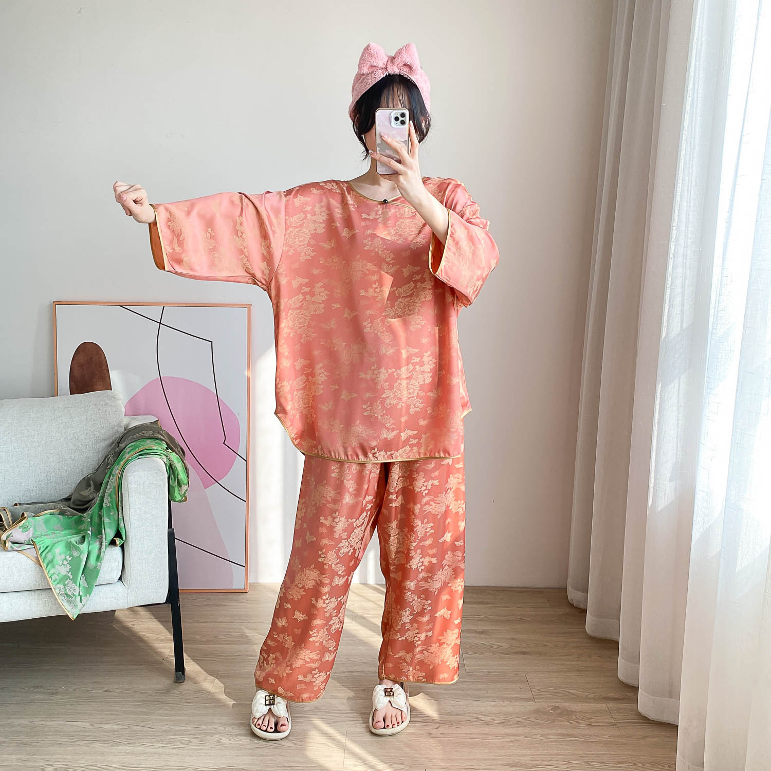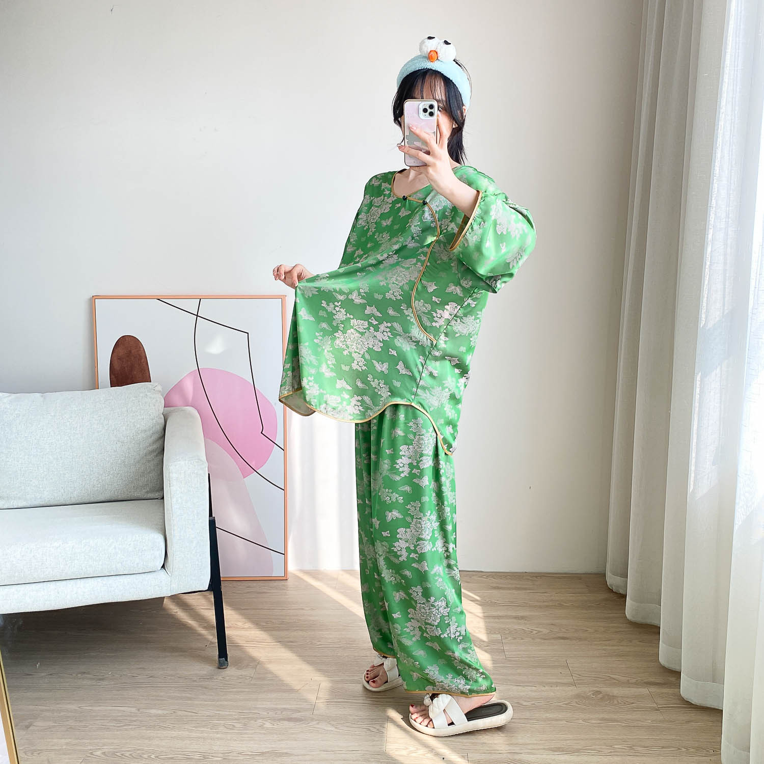중국 스타일 중국 스타일 통통녀 플러스 사이즈 아이스 실크 파자마 여성 여름 얇은 실크 느슨한 홈 옷 세트 200 진
