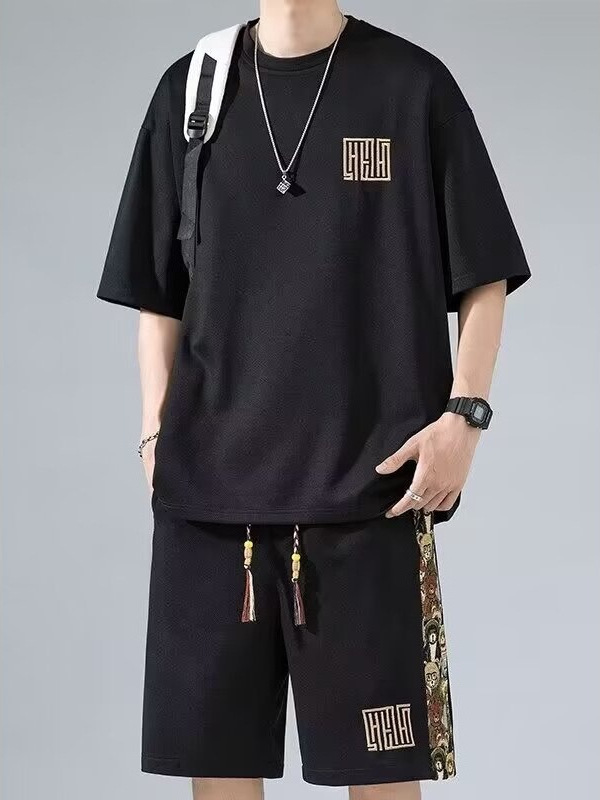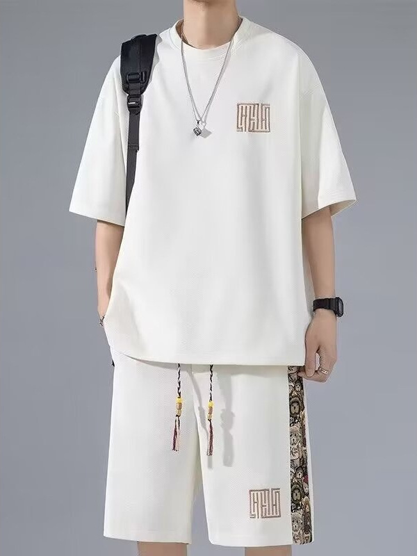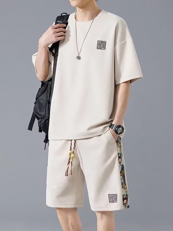 Waffe 자수 세트 남자 여름 느슨한 올 매치 반팔 얇은 통기성 반바지 캐주얼 트렌디 투피스 세트