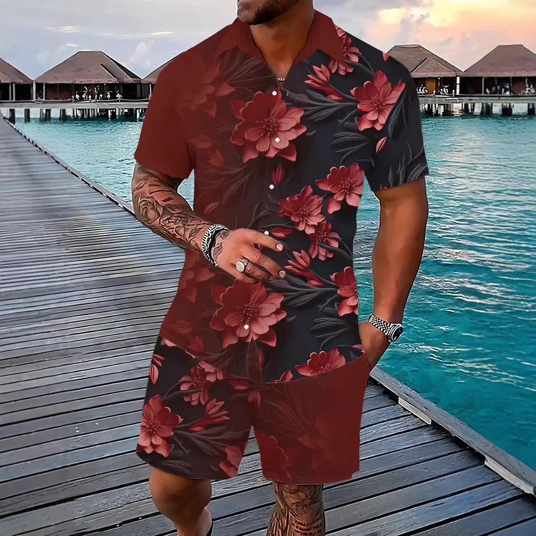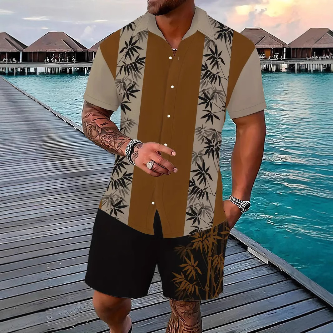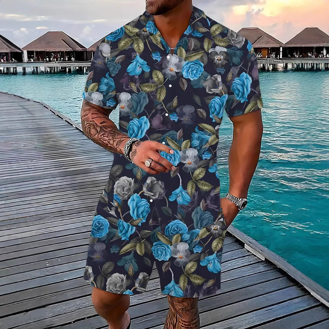 크로스 국경 AliExpress 남자의 새로운 패션 하와이 짧은 소매 반바지 비치 스타일 캐주얼 프린트 셔츠 세트 남성