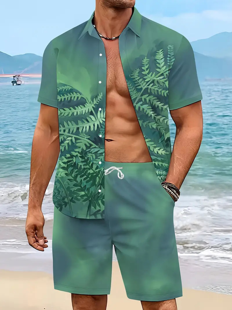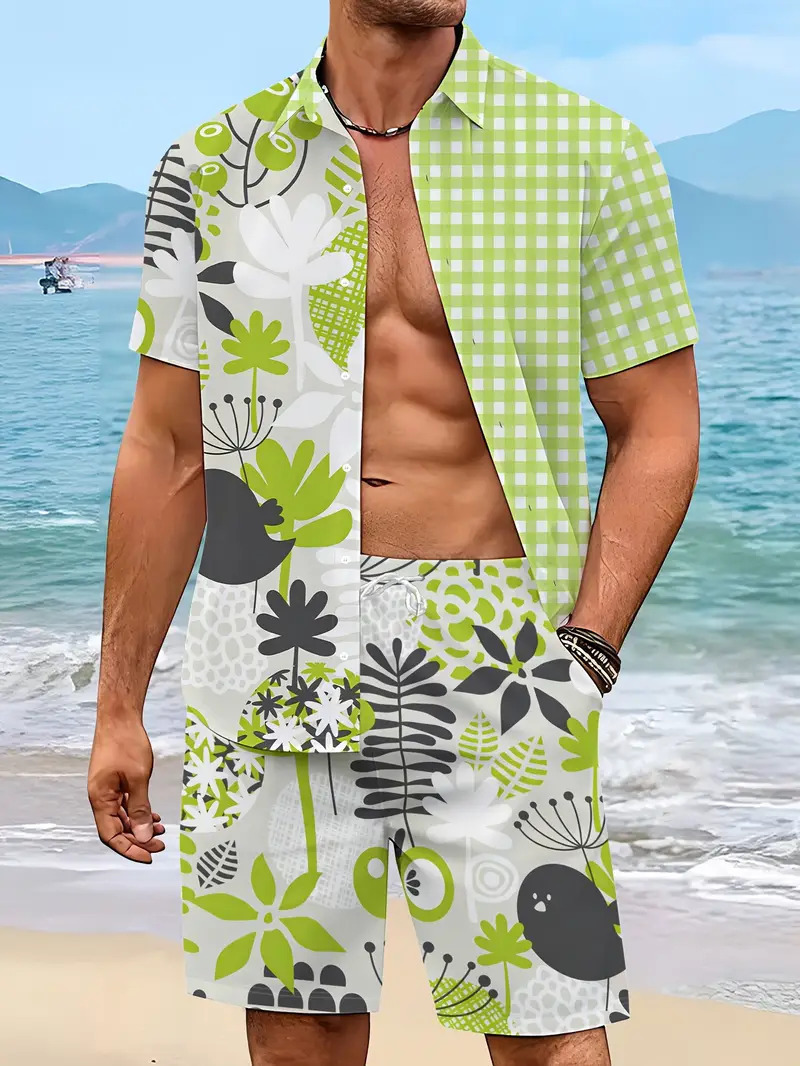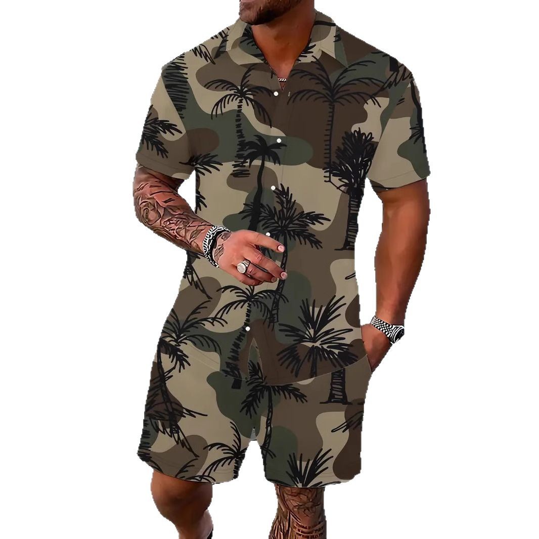 크로스 국경 AliExpress 남자의 새로운 패션 하와이 짧은 소매 반바지 비치 스타일 캐주얼 프린트 셔츠 세트 남성
