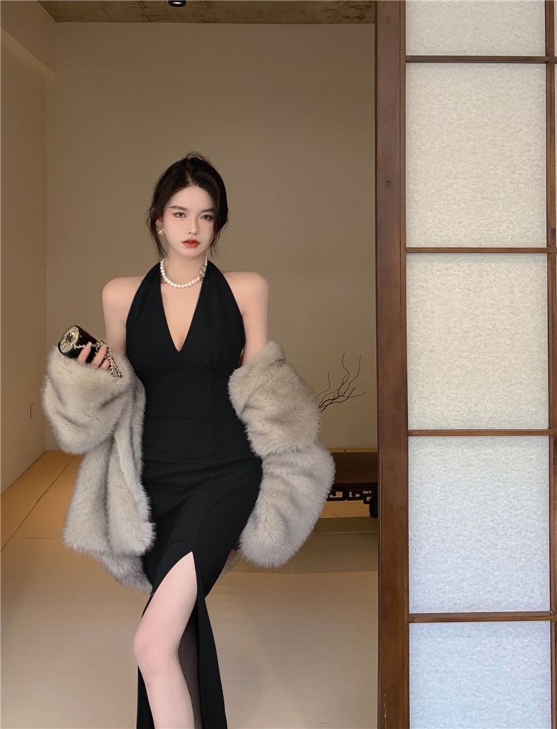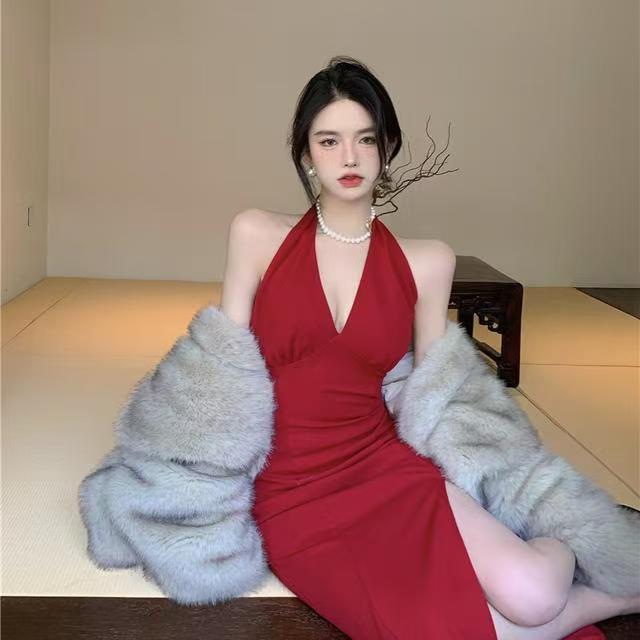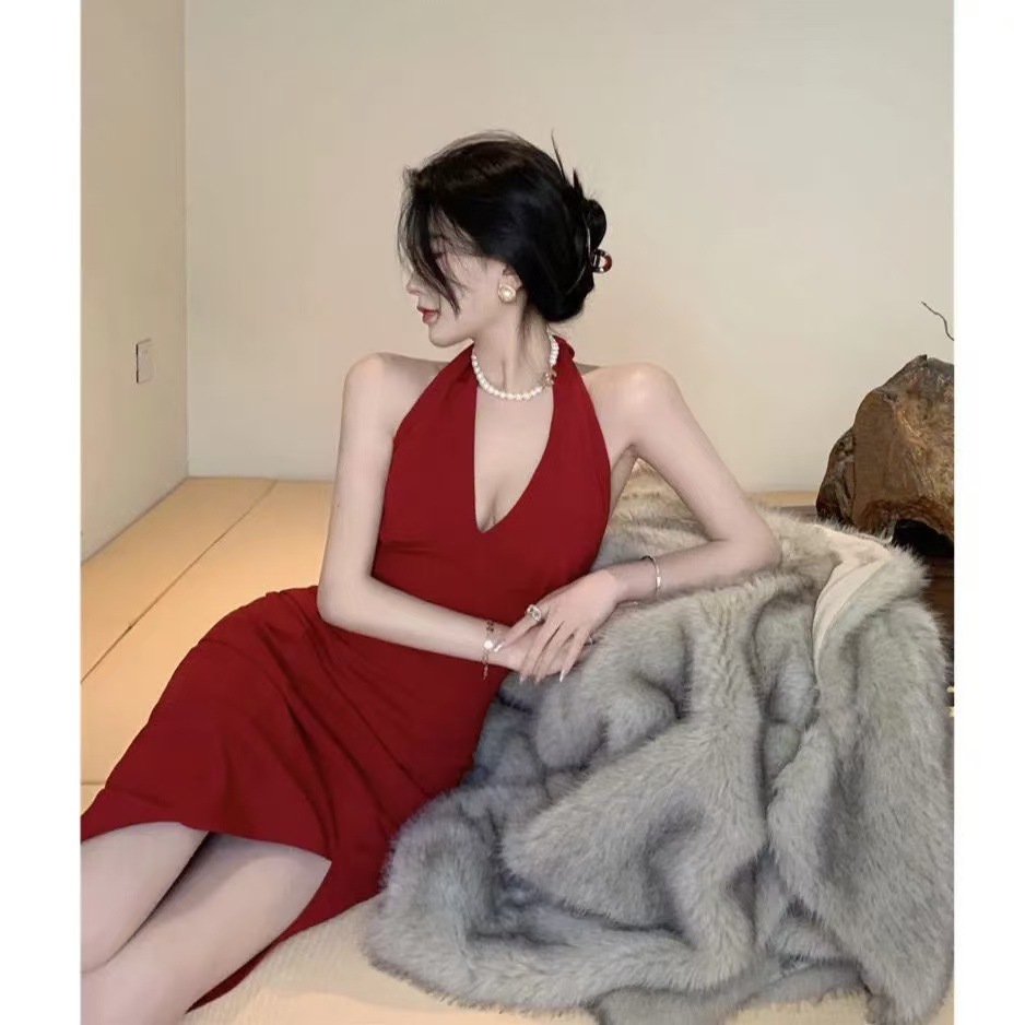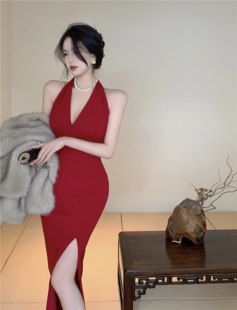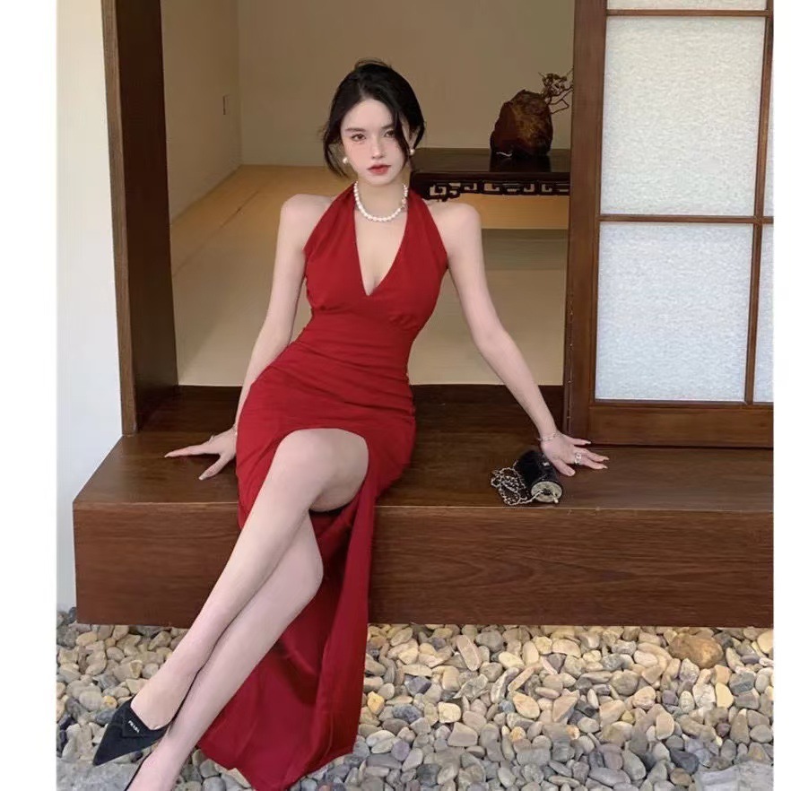 홍콩 스타일 빈티지 버건디 소매 없는 섹시한 백리스 스플릿 넥 스트랩 원피스 해변 휴일을 위한 롱 원피스