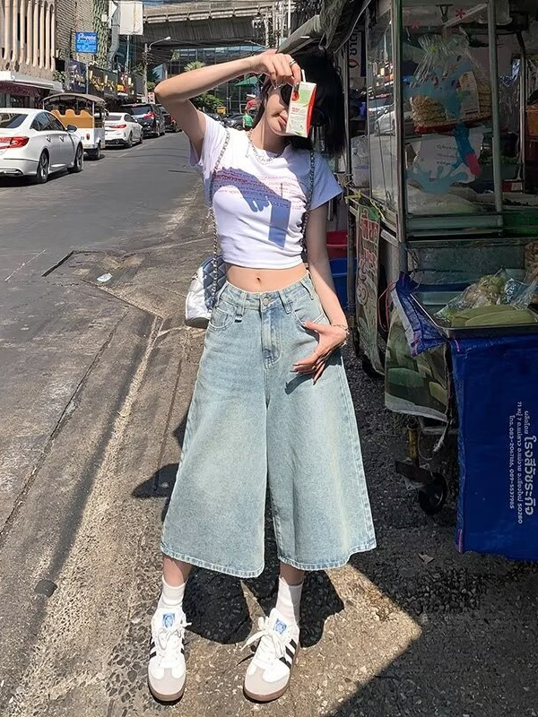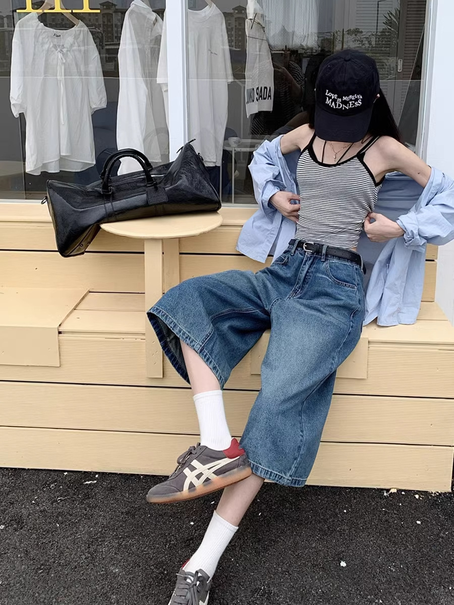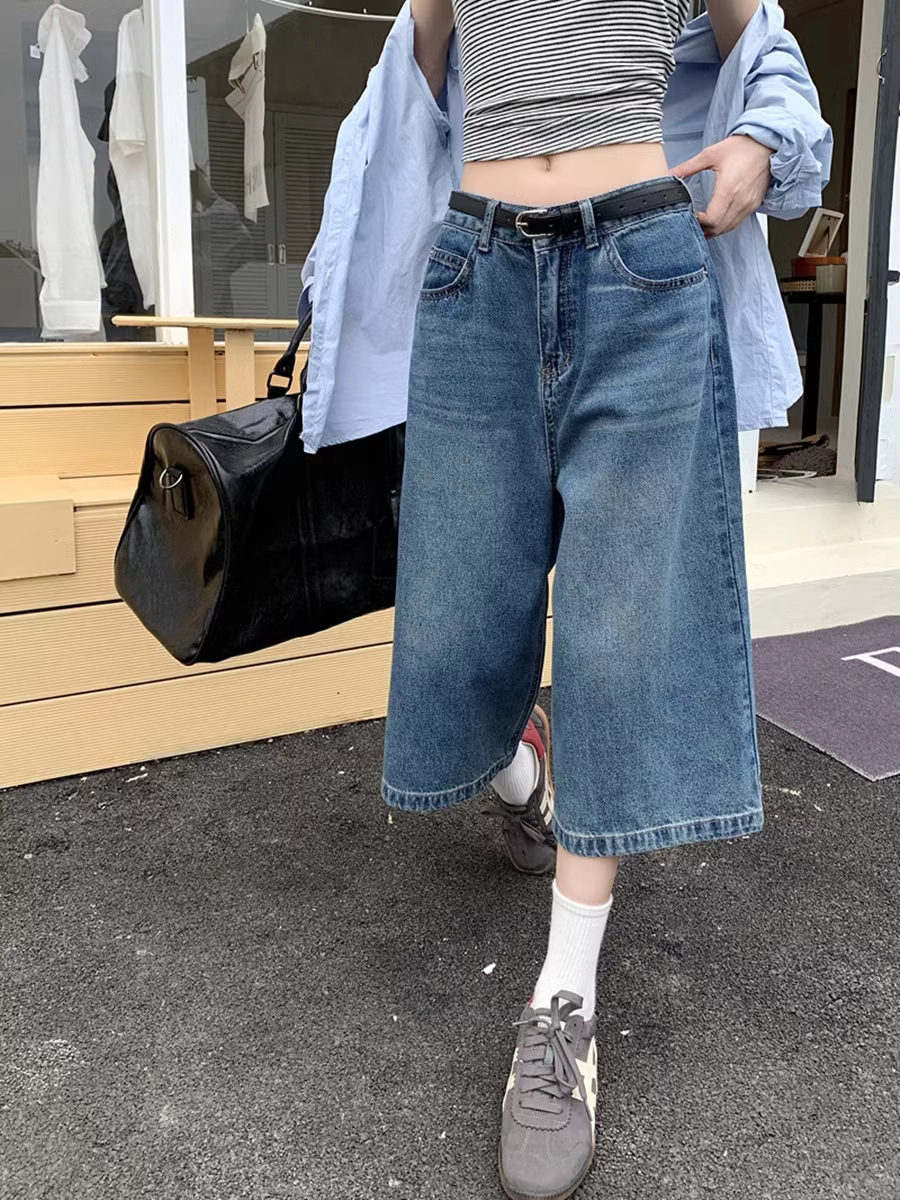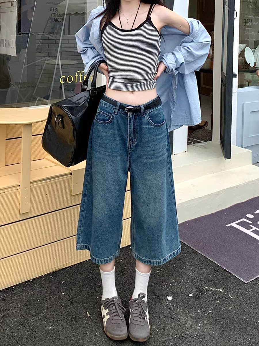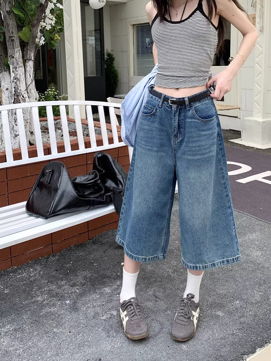 아메리칸 스타일 레트로 청바지 여성 여름 새로운 높은 허리 육체 덮음 느슨한 자른 넓은 다리 중간 바지 작은 남성