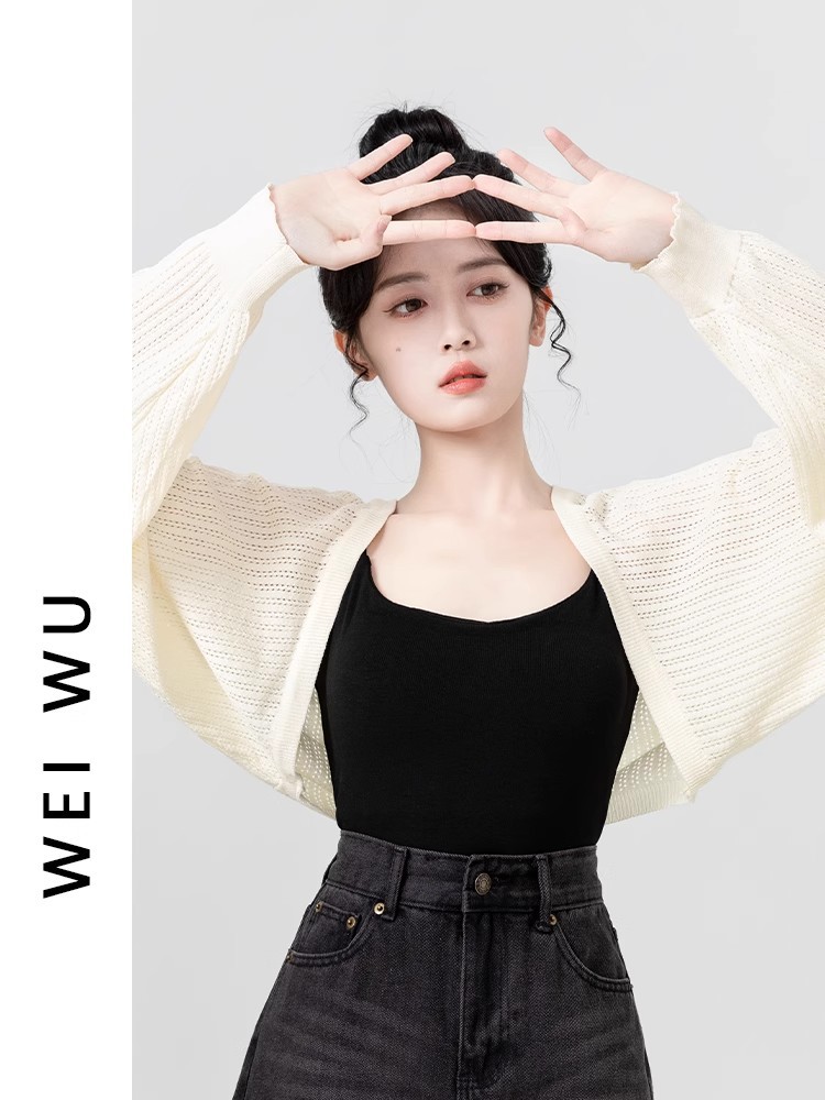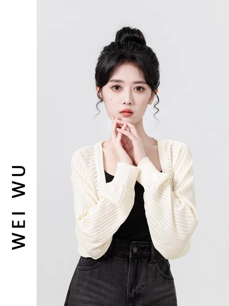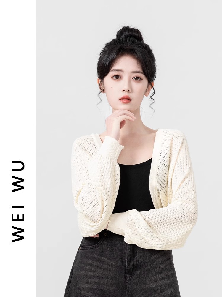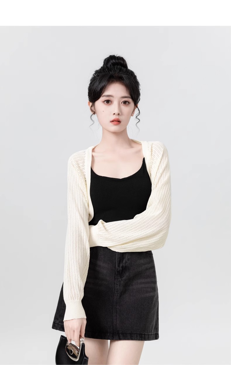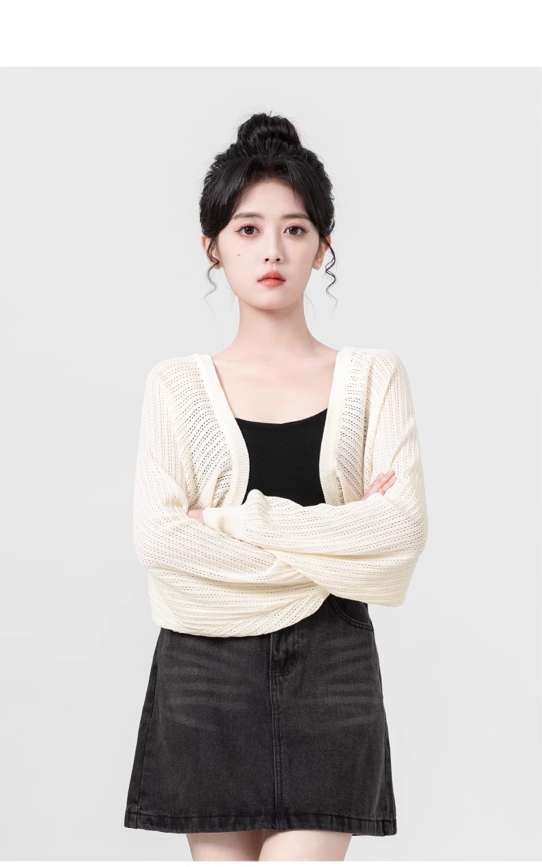 살구색 속이 비치는 긴팔 니트 가디건 여성용 여름 2026 신상품 자외선 차단 블라우스 탑 숏 스타일 조끼형 탑
