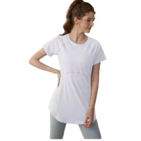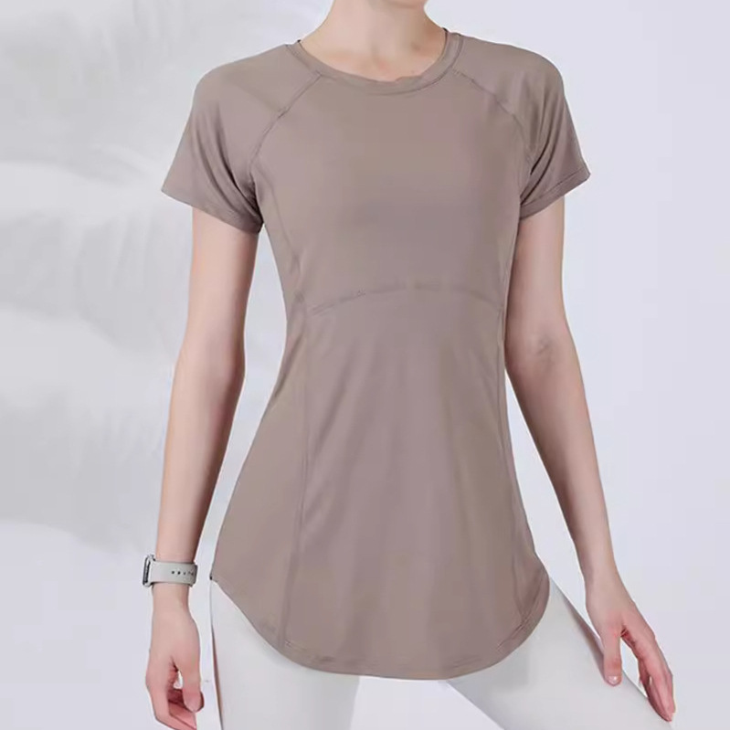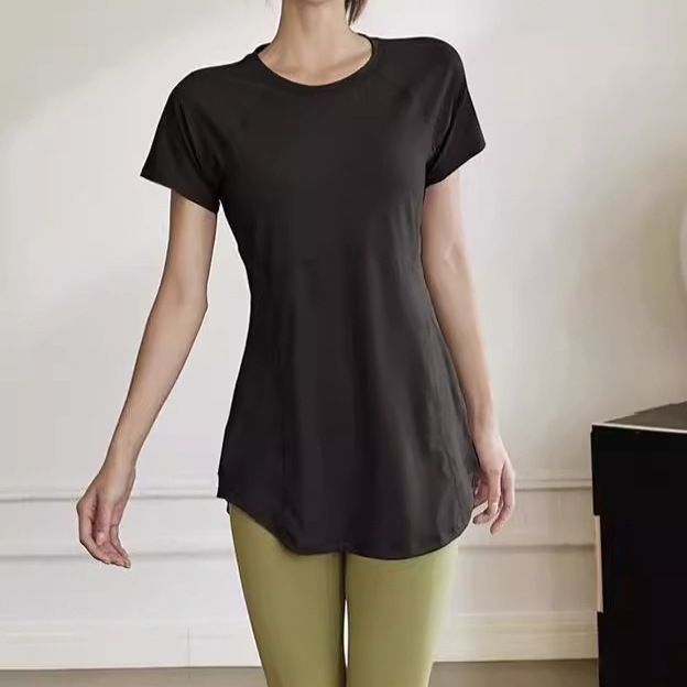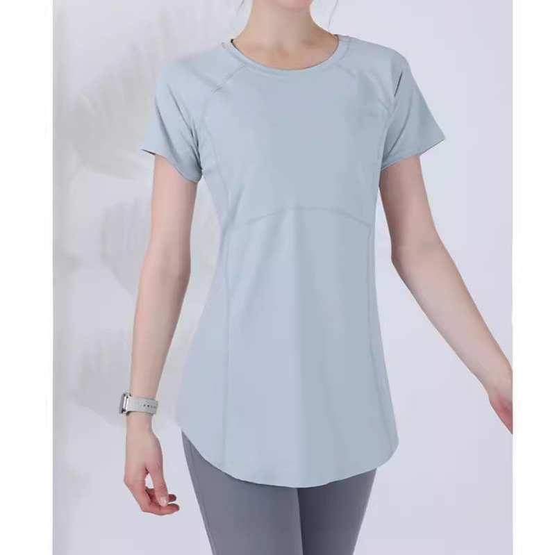 2025 새로운 요가 세트 여성 중간 길이의 엉덩이 커버 슬림 반팔 티셔츠 달리기 스포츠 최고 피트니스 세트 여름