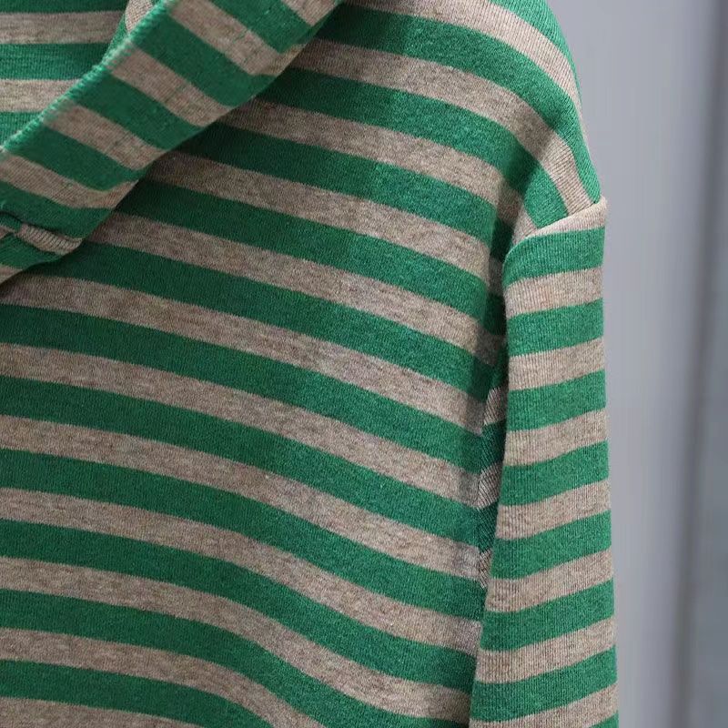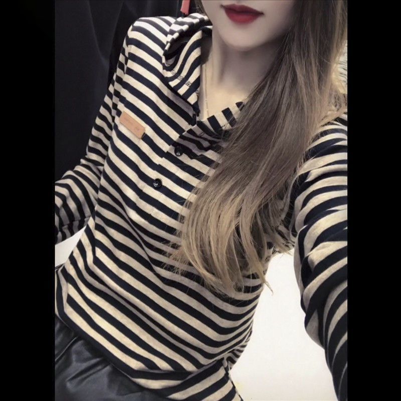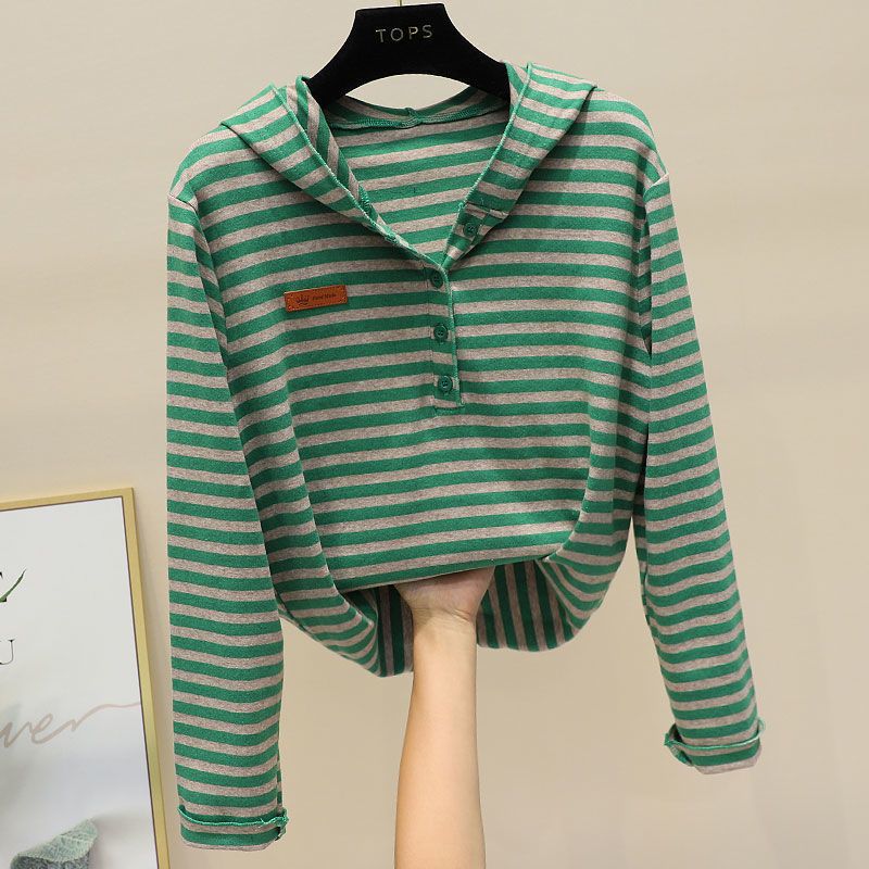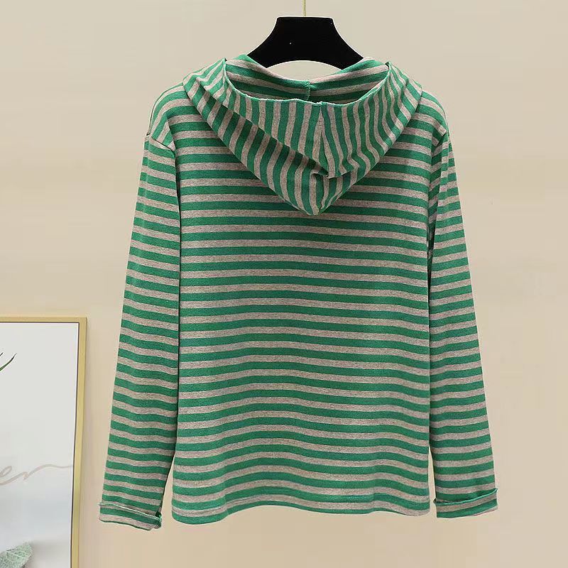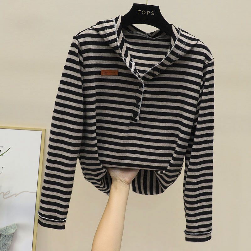 2025 새로운 봄과 가을 긴 소매 후드 티셔츠 여성용 쇼트 캐주얼 올 매치 스트라이프 티셔츠 탑베이스 셔츠 재킷