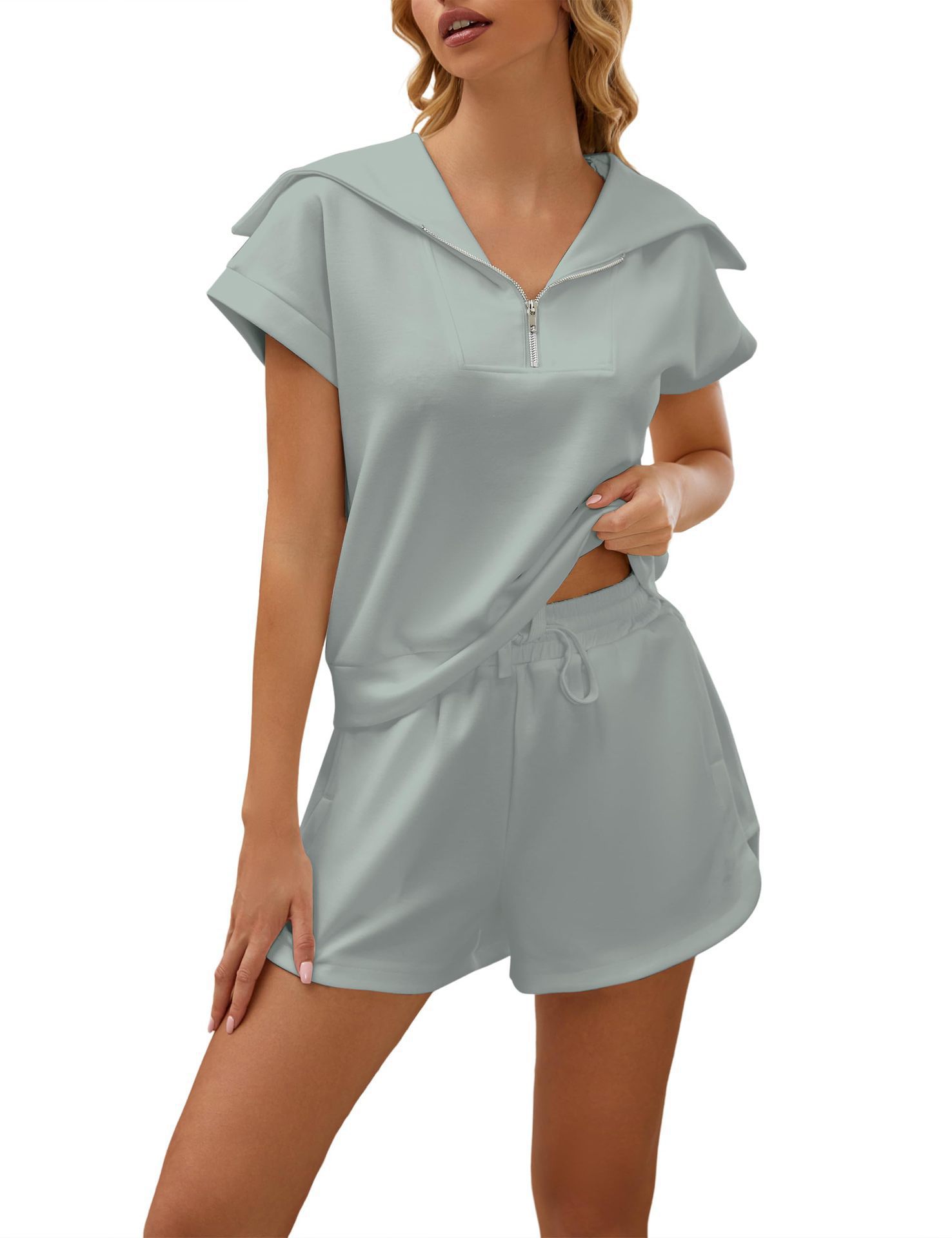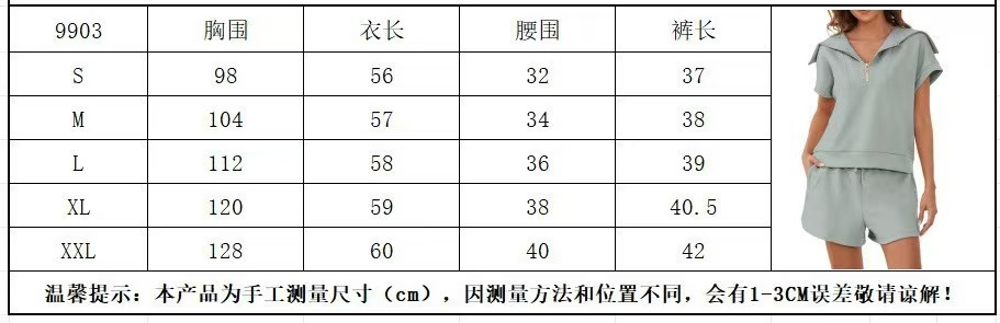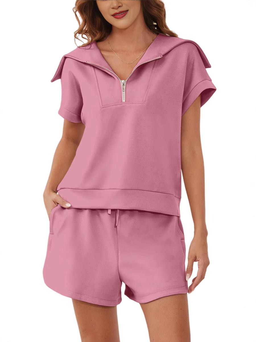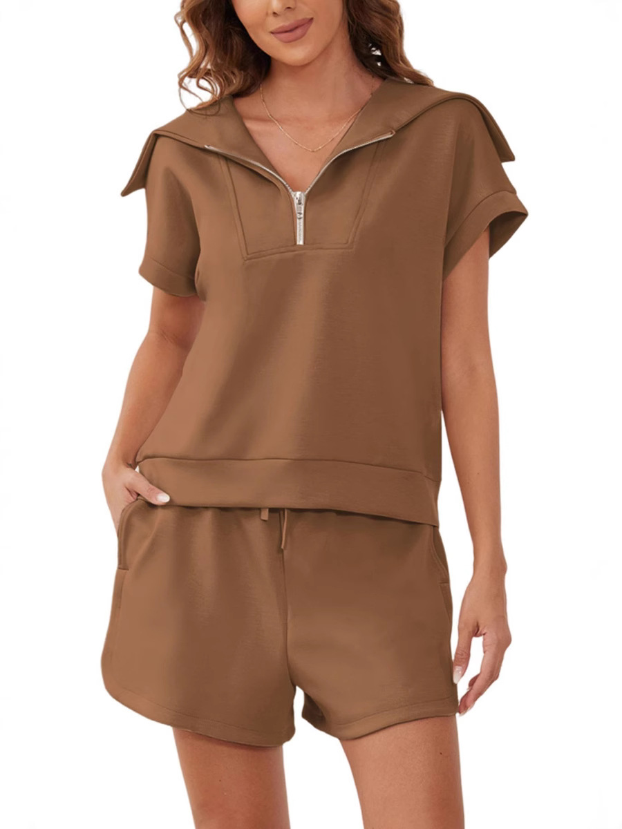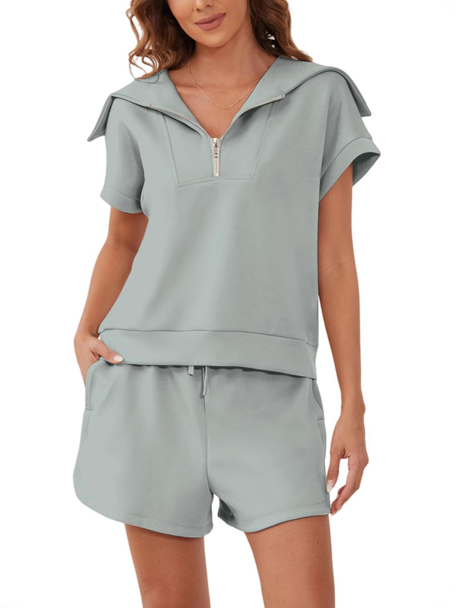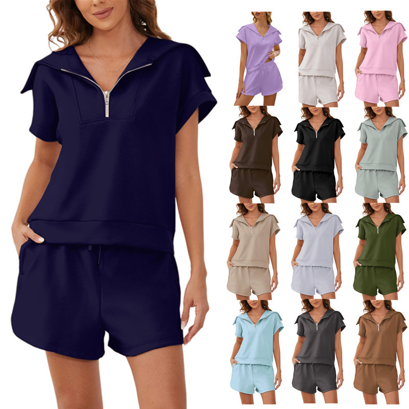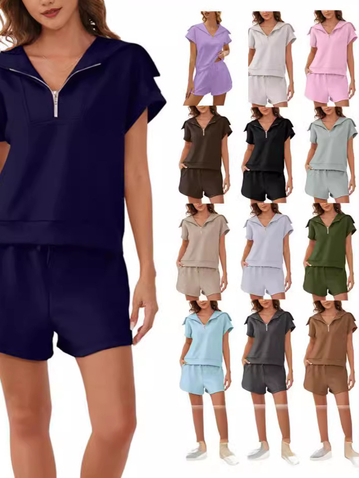 2025 여름 새로운 유럽과 미국 아마존 여성 2 피스 세트 하프 지퍼 롭 반소매 운동복 높은 허리 반바지