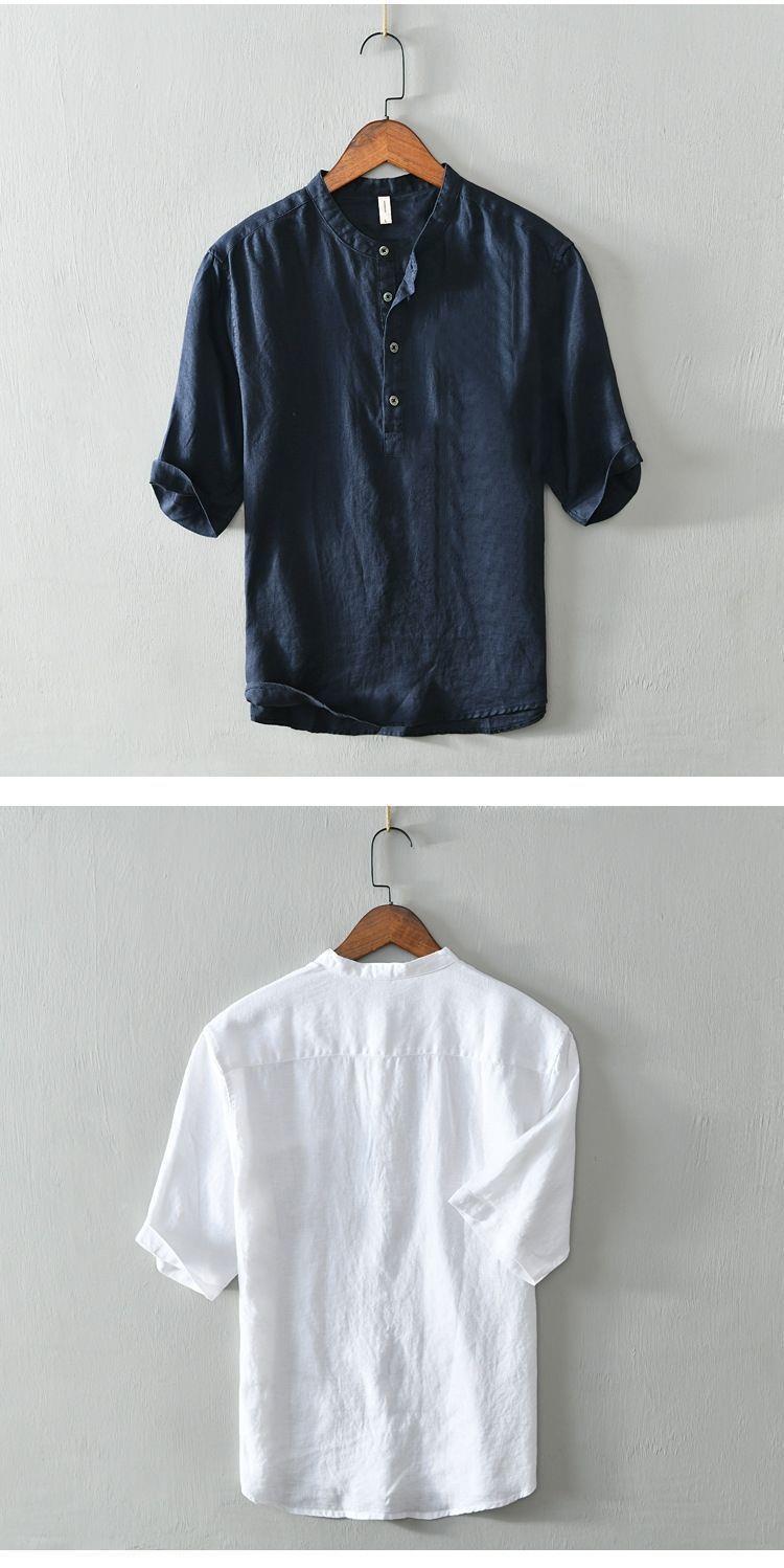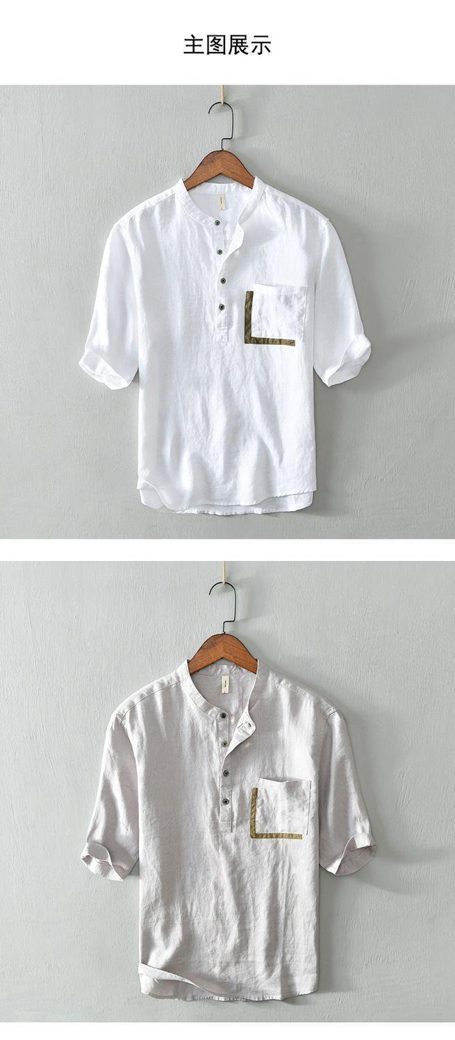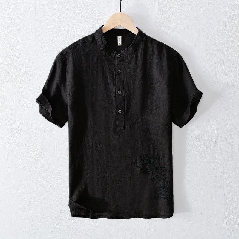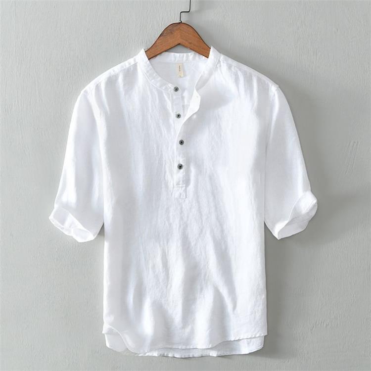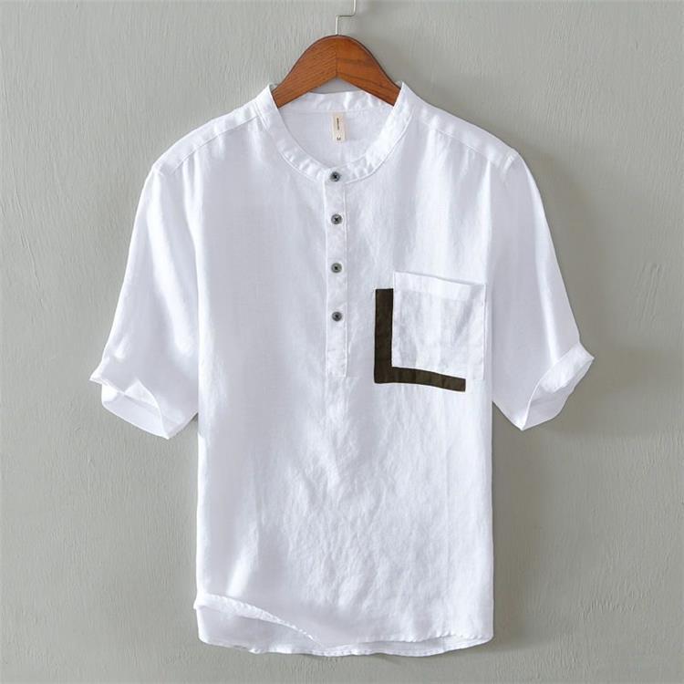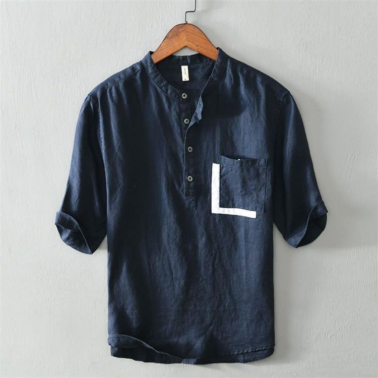 중국 스타일 봄과 여름 느슨한 고급 남성 리넨 반소매 코튼 및 리넨 캐주얼 통기성 5 점 반소매 셔츠 칼라 티셔츠 남성용
