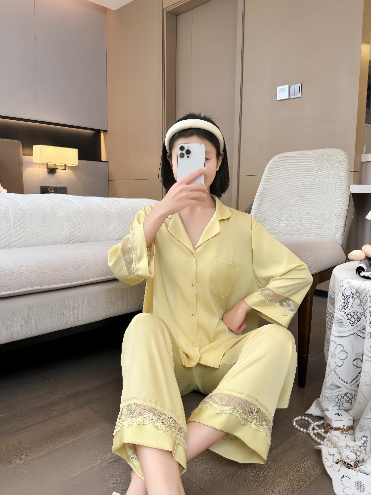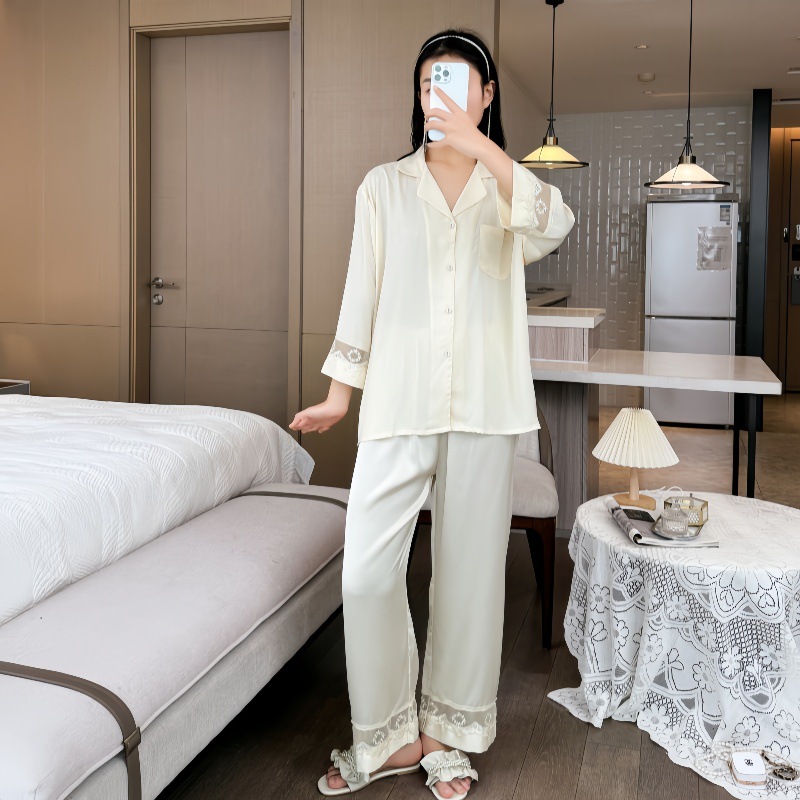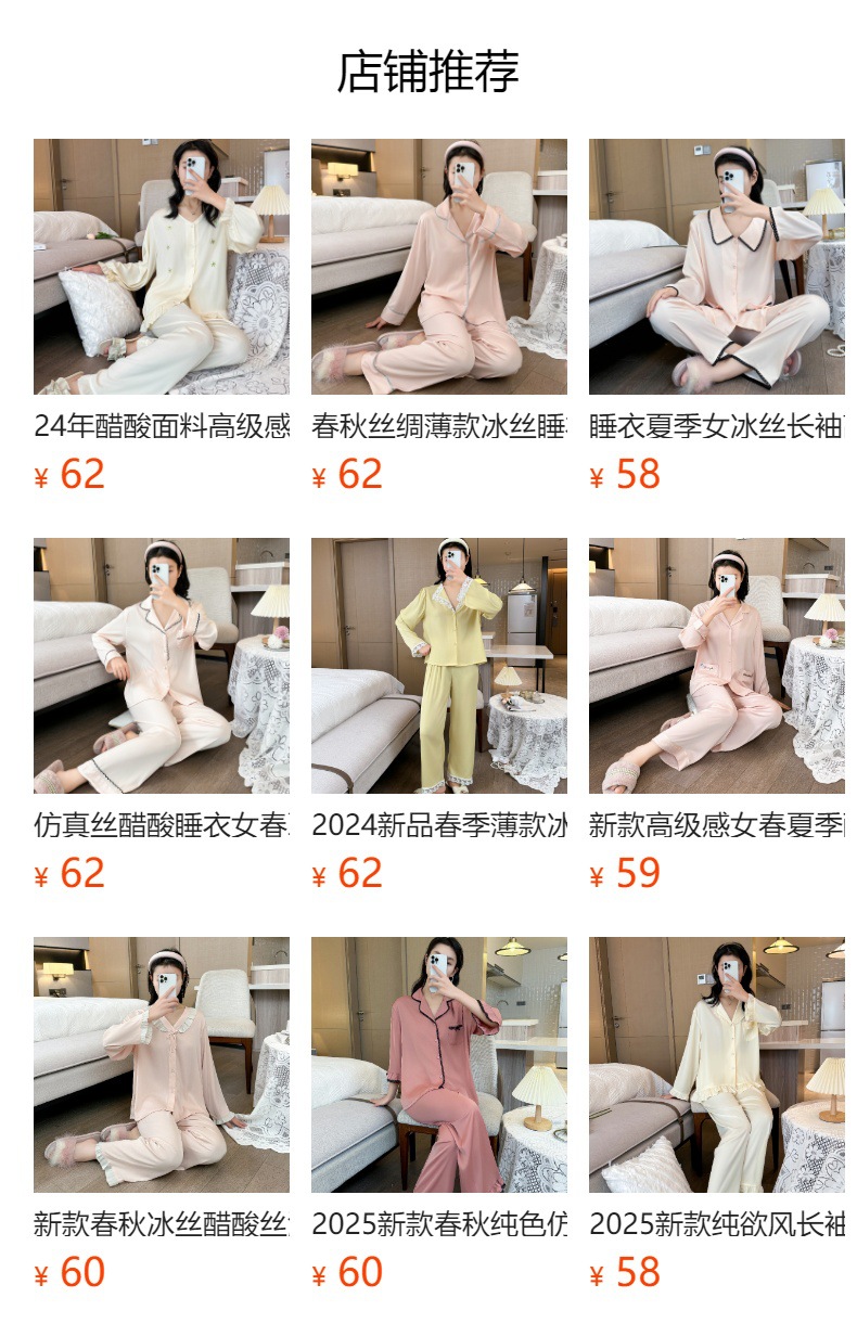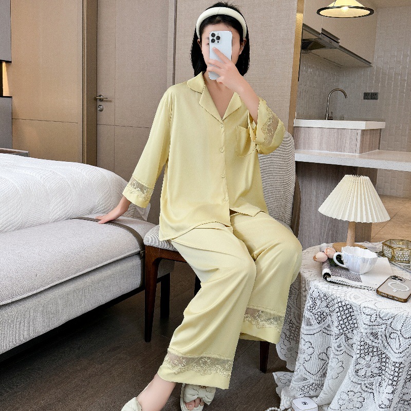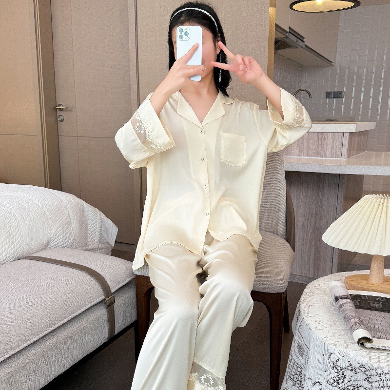 잠옷 여성의 봄과 가을 여름 얇은 얼음 실크 아세트산 긴 소매 겉옷 하이 엔드 2025 새로운 스타일 홈 의류 세트