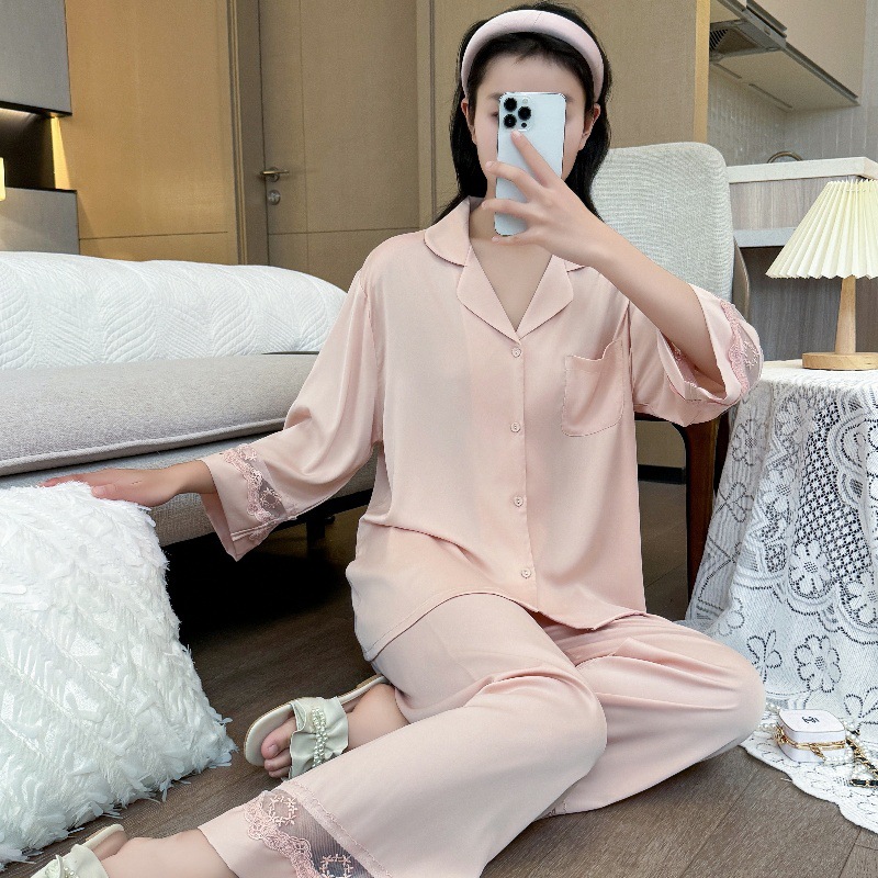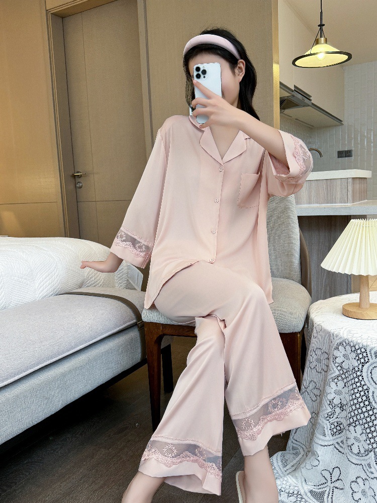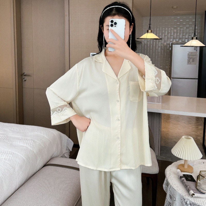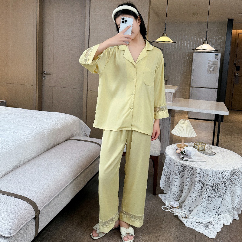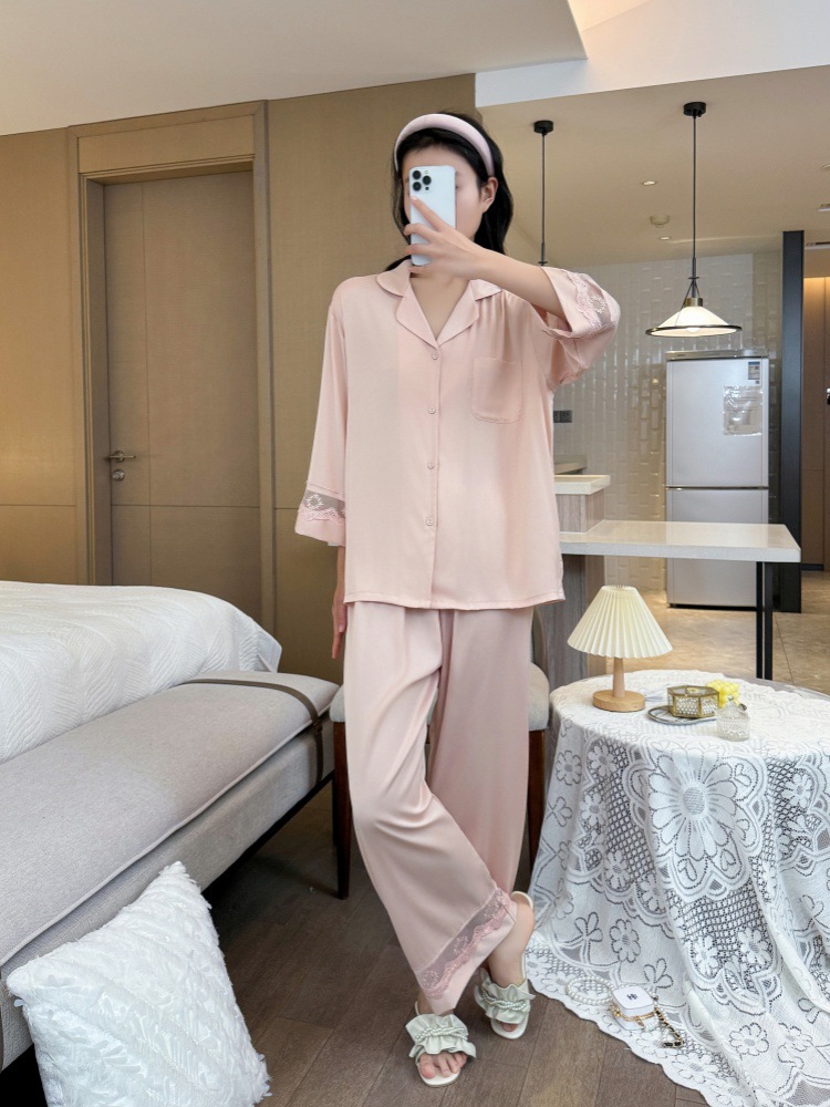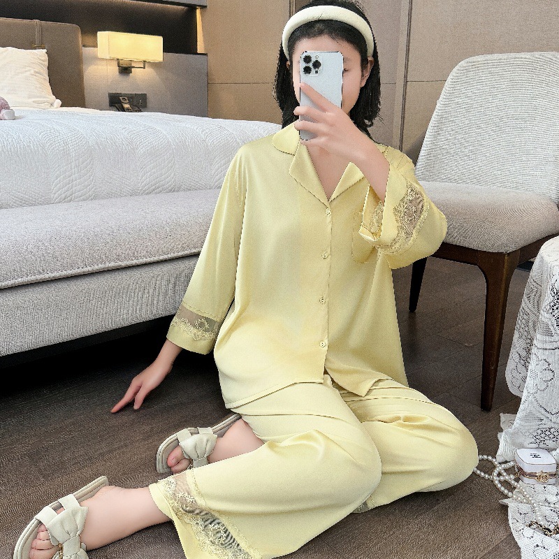 잠옷 여성의 봄과 가을 여름 얇은 얼음 실크 아세트산 긴 소매 겉옷 하이 엔드 2025 새로운 스타일 홈 의류 세트