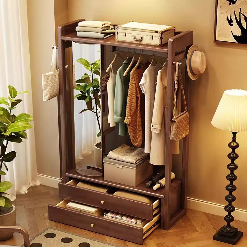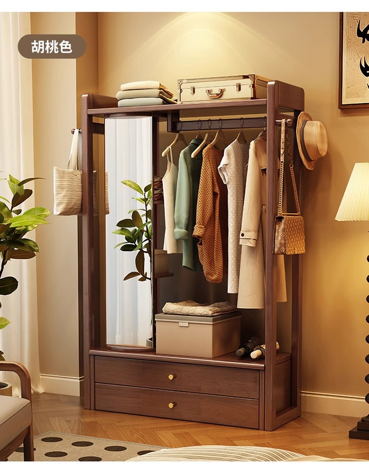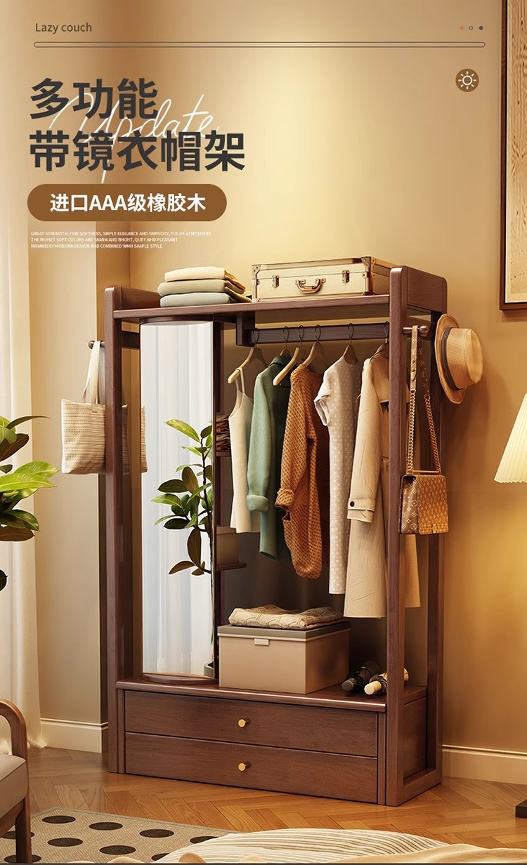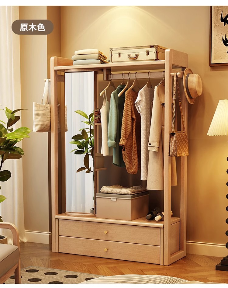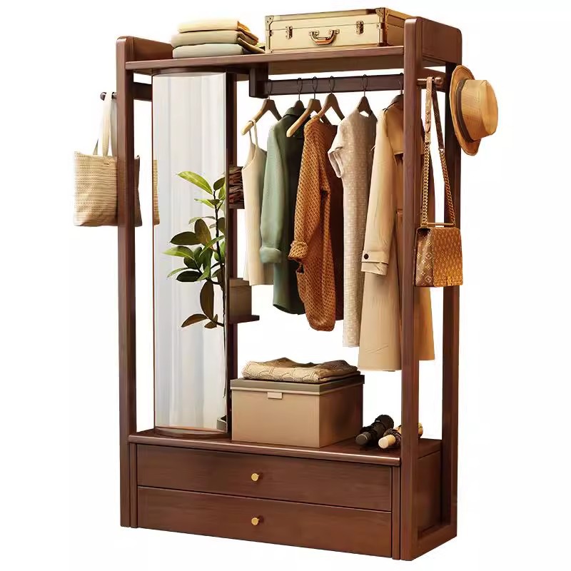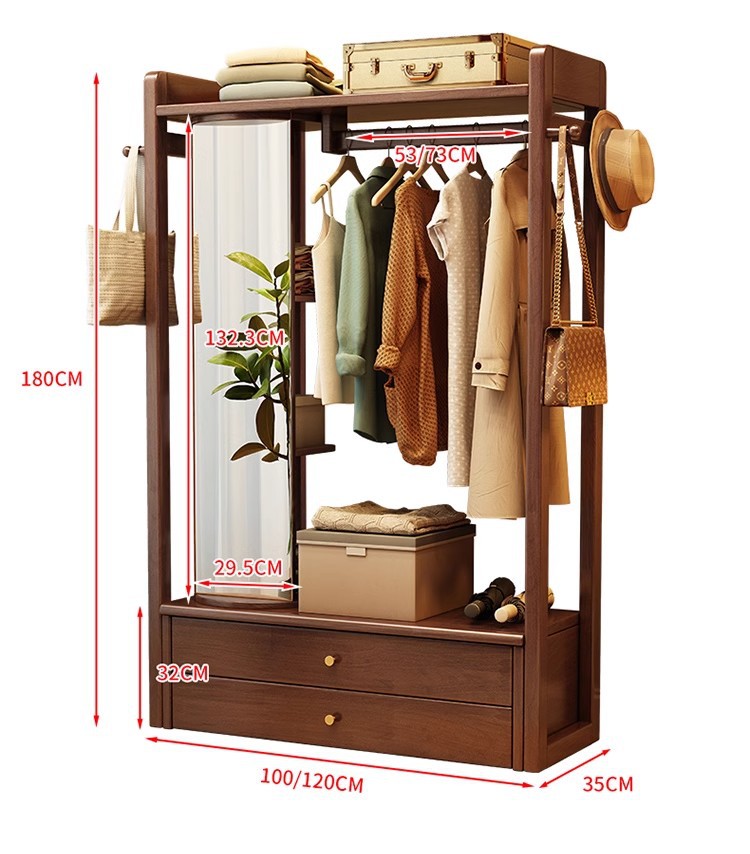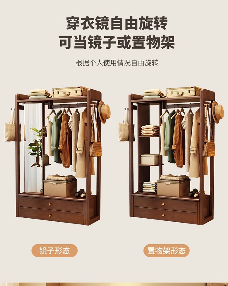 전체 길이 거울 다기능 랙이있는 회전 가능한 전체 길이 거울 옷걸이 통합 바닥 침실 단단한 나무 코트 랙