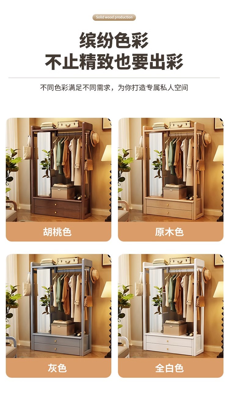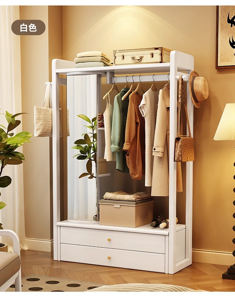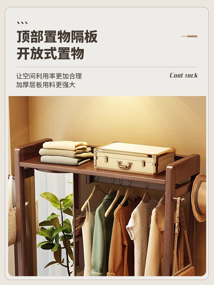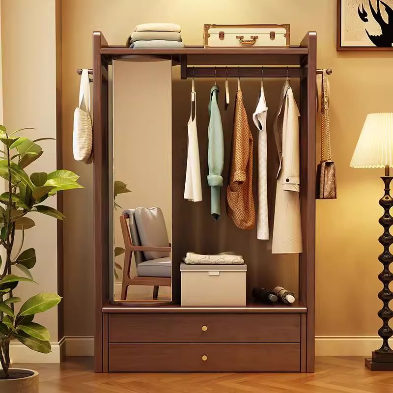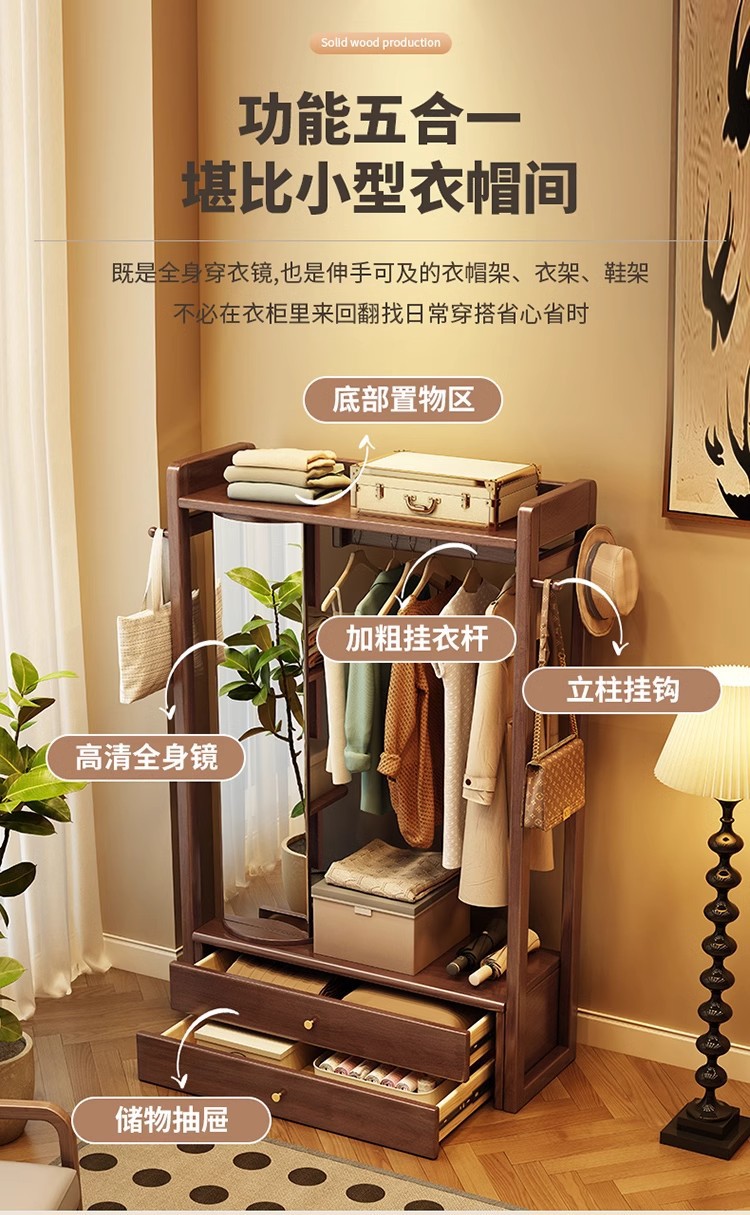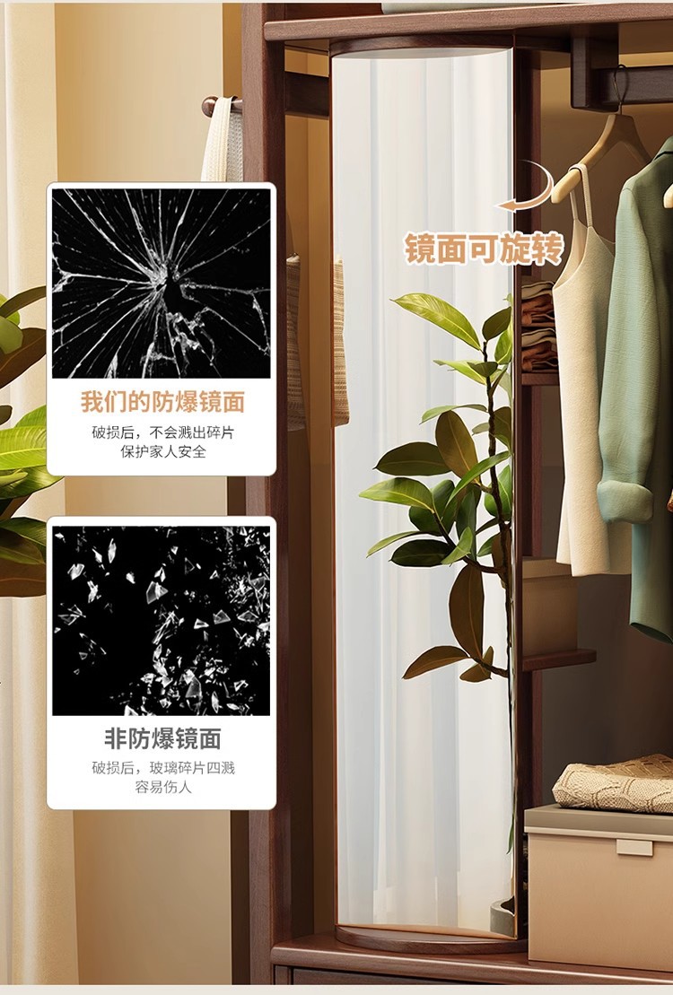 전체 길이 거울 다기능 랙이있는 회전 가능한 전체 길이 거울 옷걸이 통합 바닥 침실 단단한 나무 코트 랙